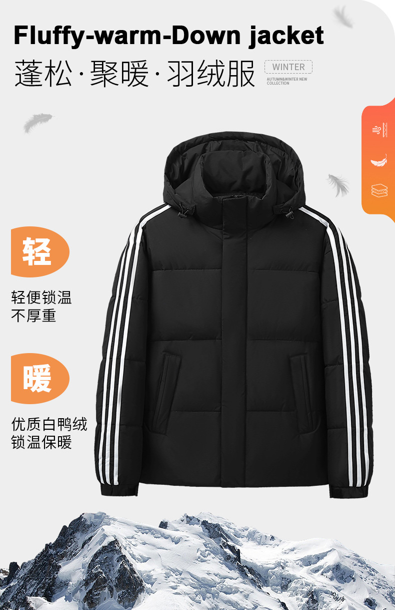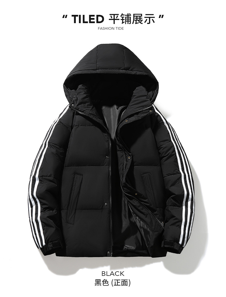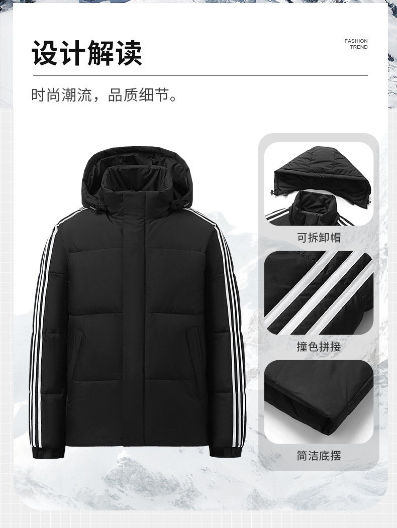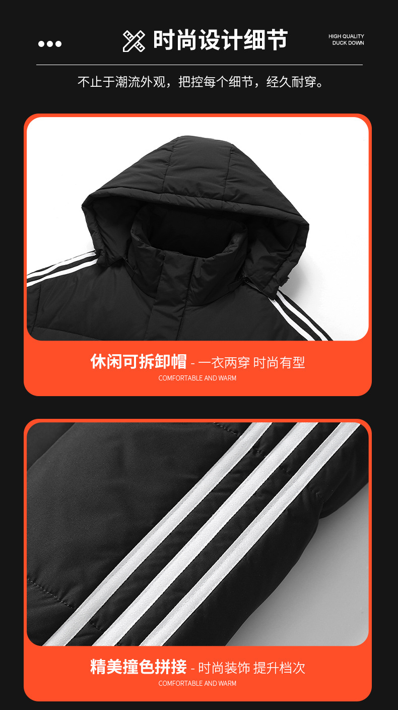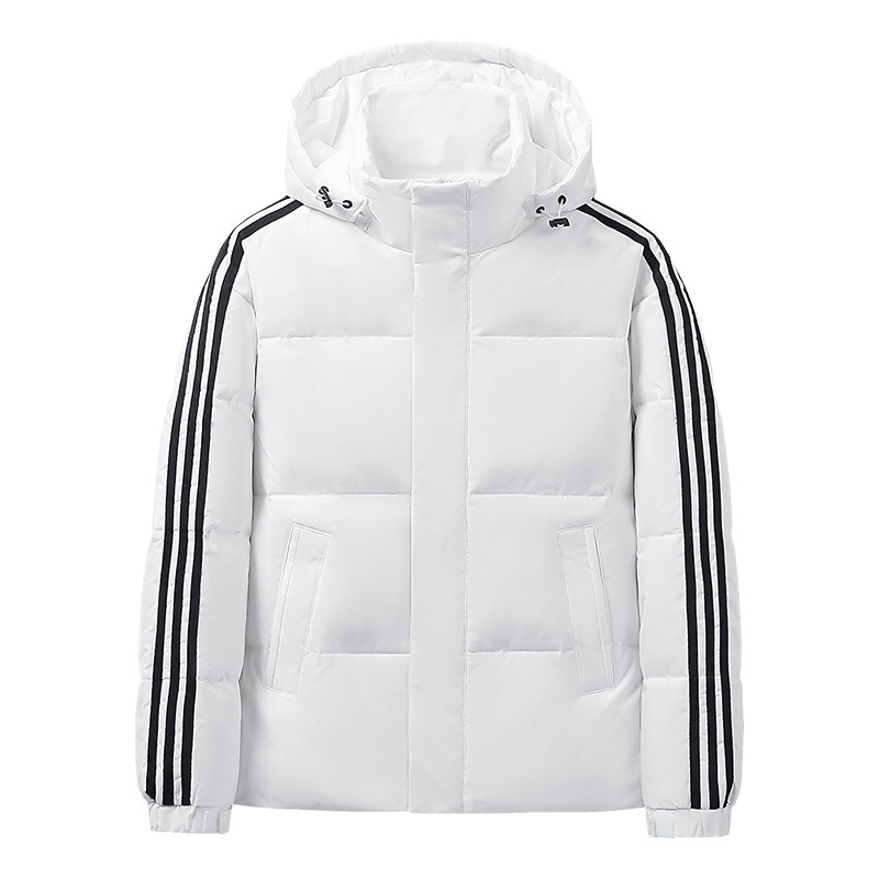Короткий пуховик с отстегивающимся капюшоном, парный комплект, зимний дизайн Adidas с тремя полосками.