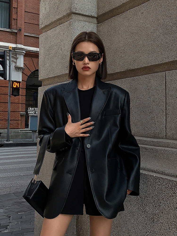 Ousph черный PU кожаный пиджак женский 2024 весна и осень зима новый расширенный текстура свободный маленький клип