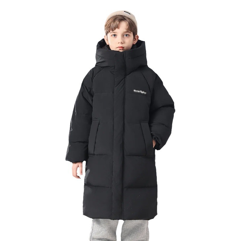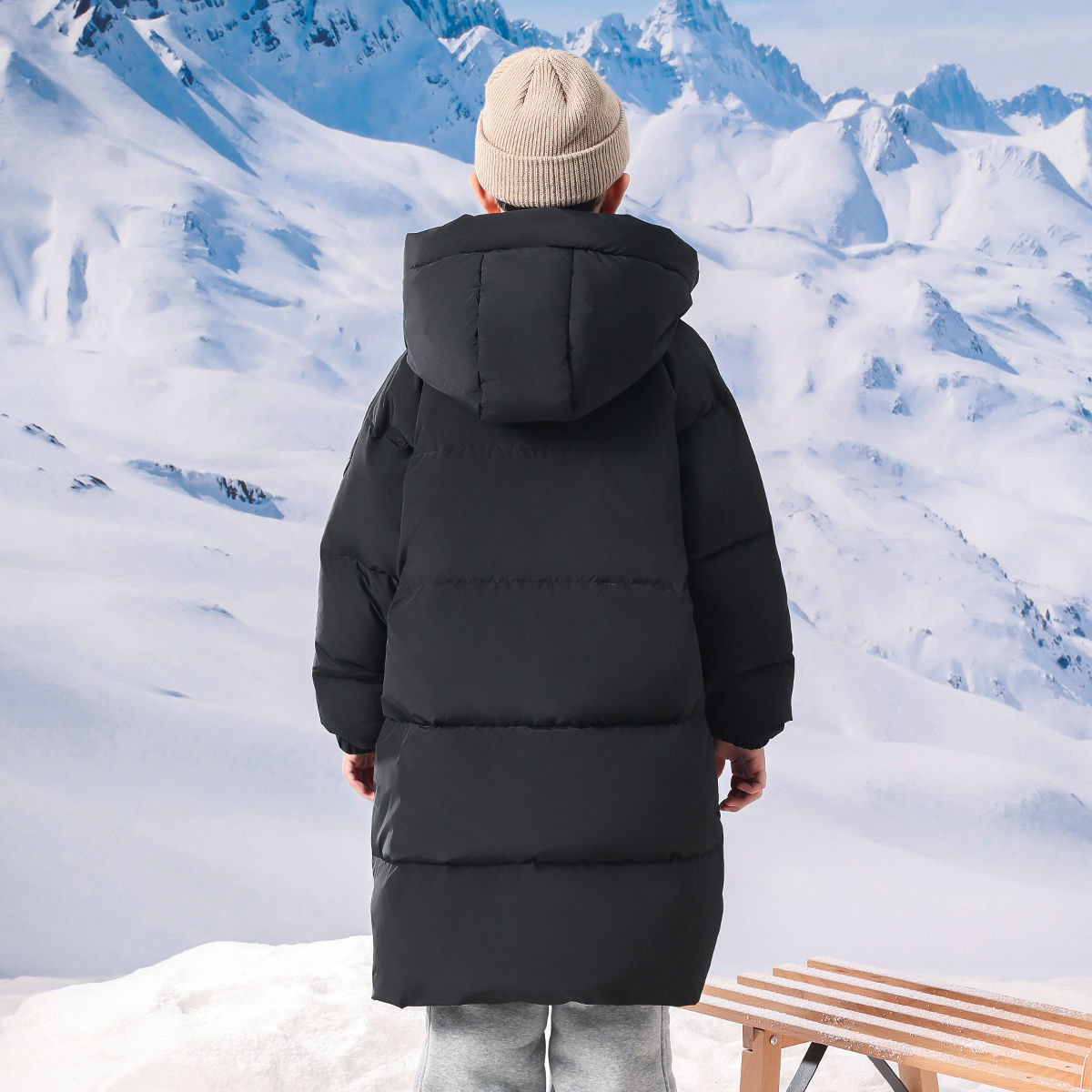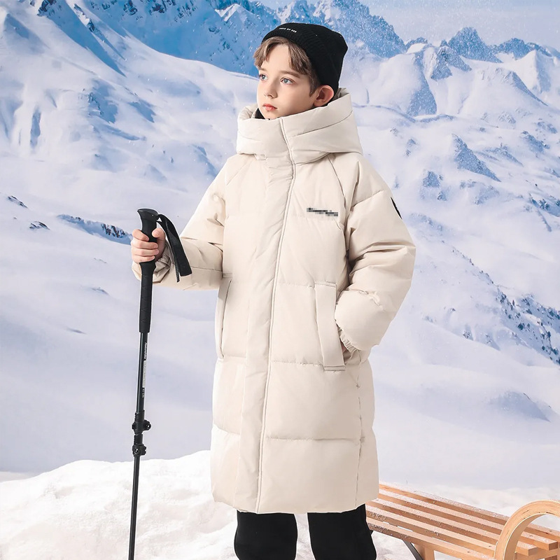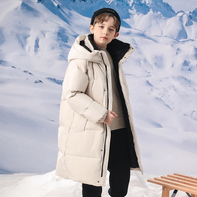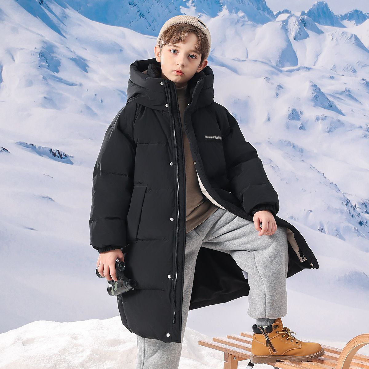 Детский пуховик в корейском стиле для мальчиков, зимний модный теплый пуховик средней длины ниже колена с капюшоном, серый, на утином пуху, для девочек постарше.