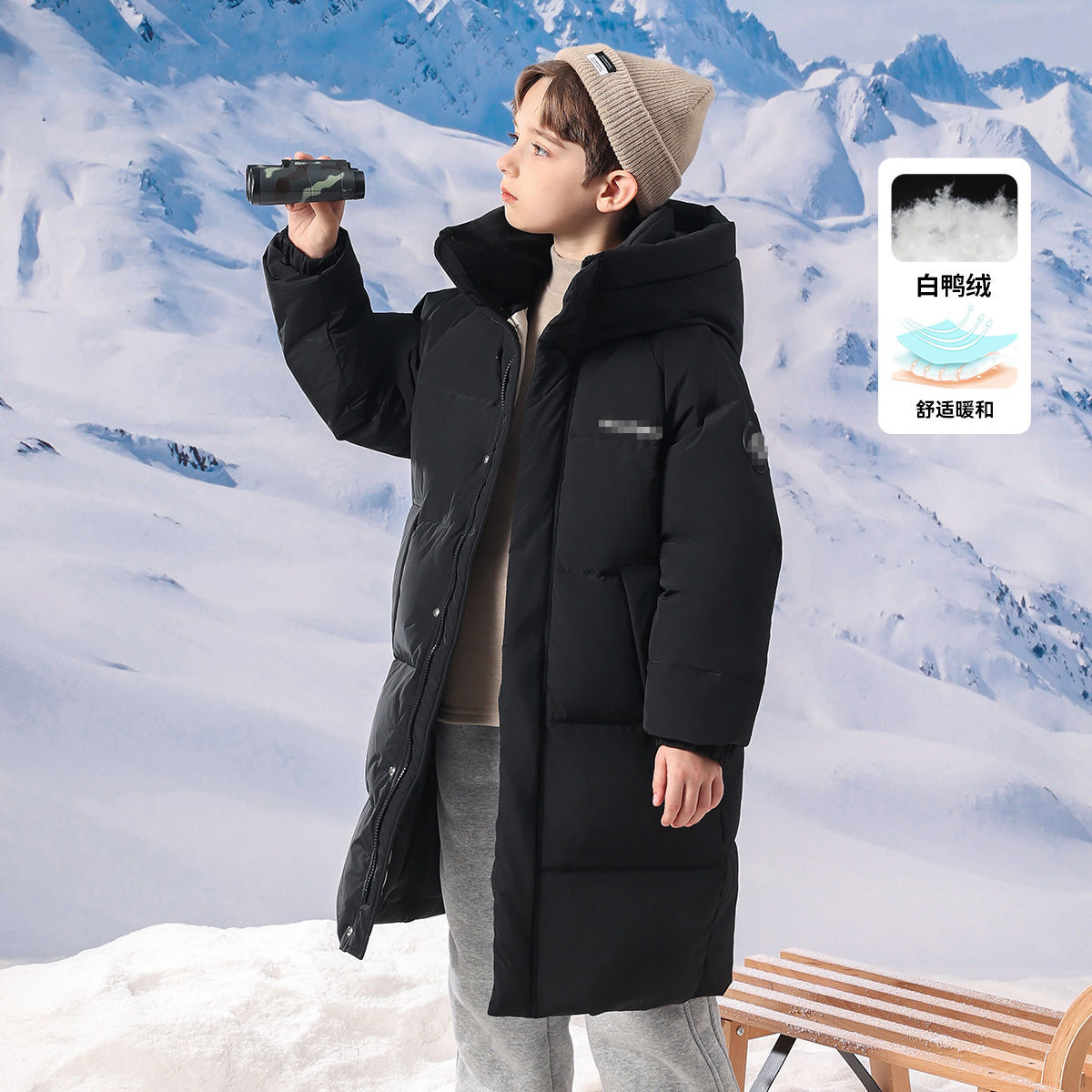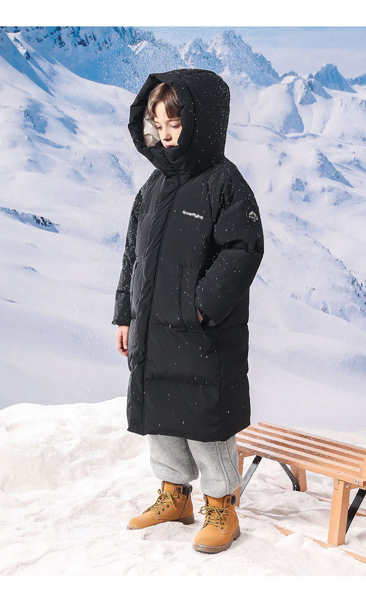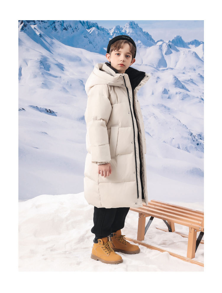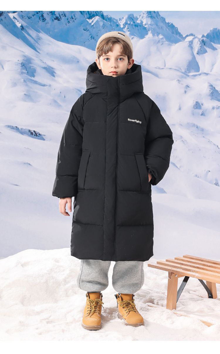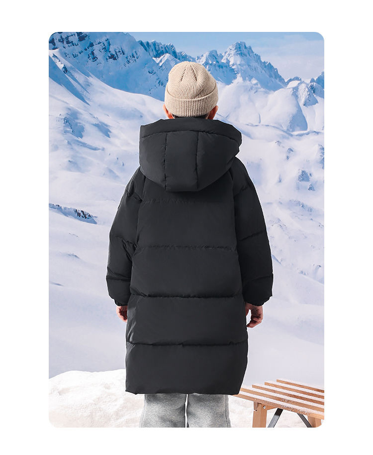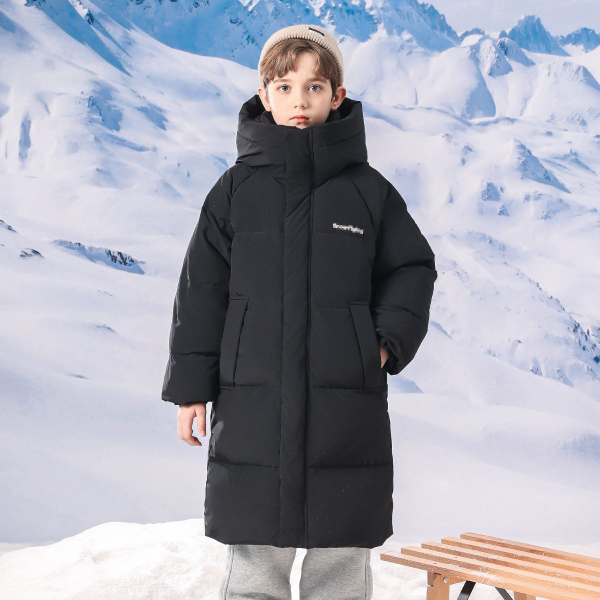 Детский пуховик в корейском стиле для мальчиков, зимний модный теплый пуховик средней длины ниже колена с капюшоном, серый, на утином пуху, для девочек постарше.