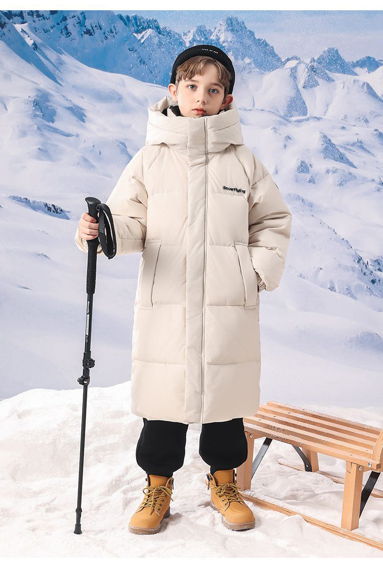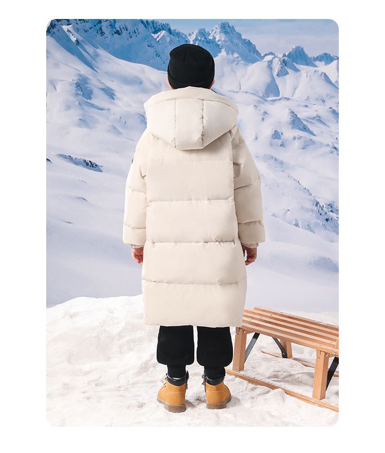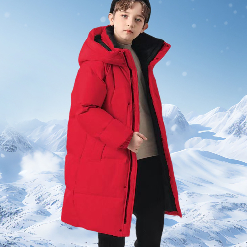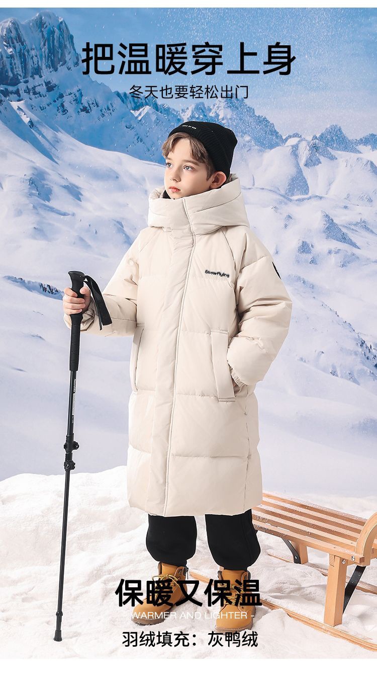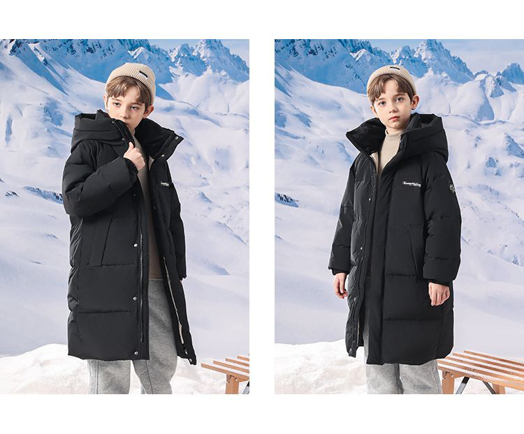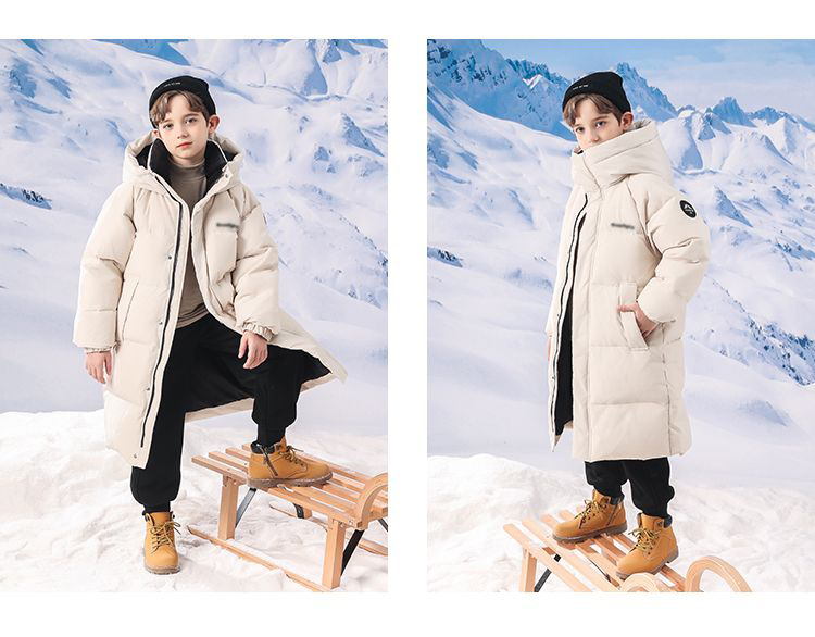 Детский пуховик в корейском стиле для мальчиков, зимний модный теплый пуховик средней длины ниже колена с капюшоном, серый, на утином пуху, для девочек постарше.
