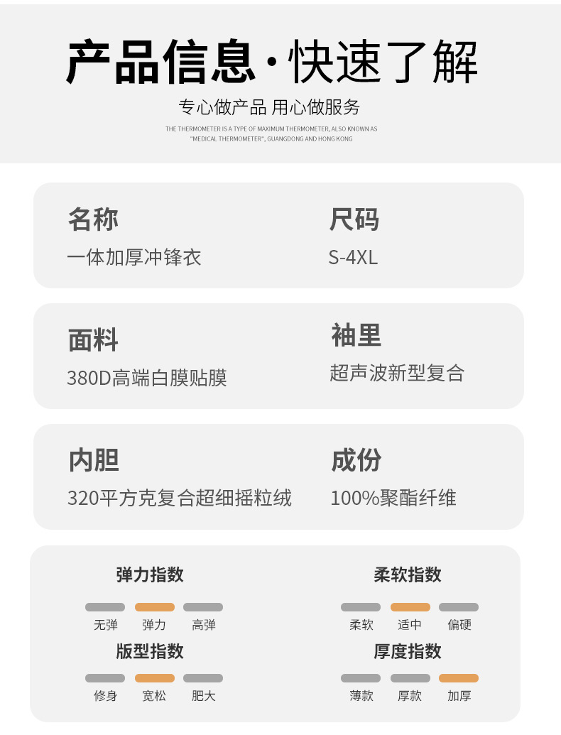 Подкладка: 320 GSM ламинированный микрофлис Ткань: 380D высококачественный материал с белой пленкой Подкладка рукавов: Ультразвуковая сварка, новый композитный утолщенный материал для подкладки рукавов