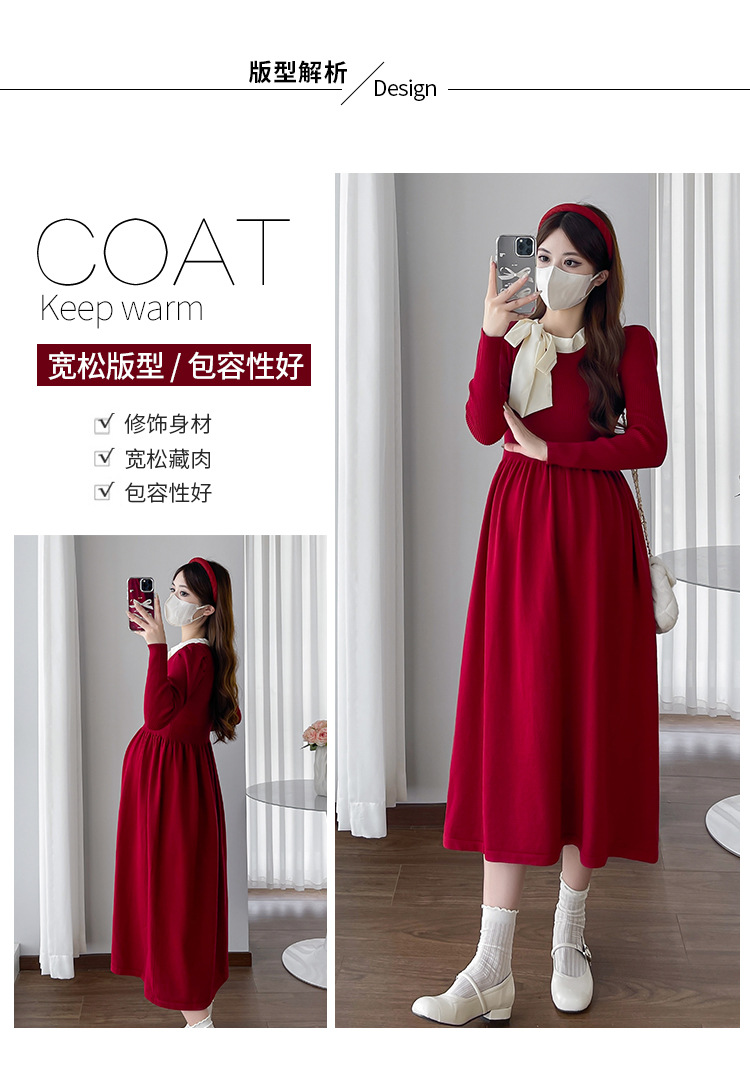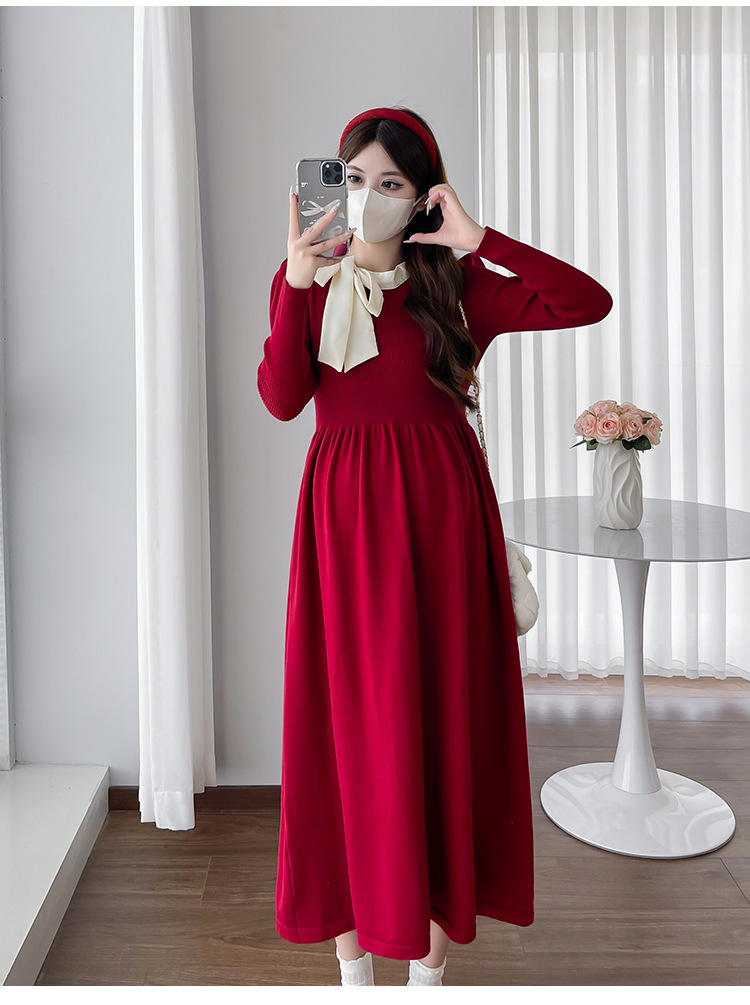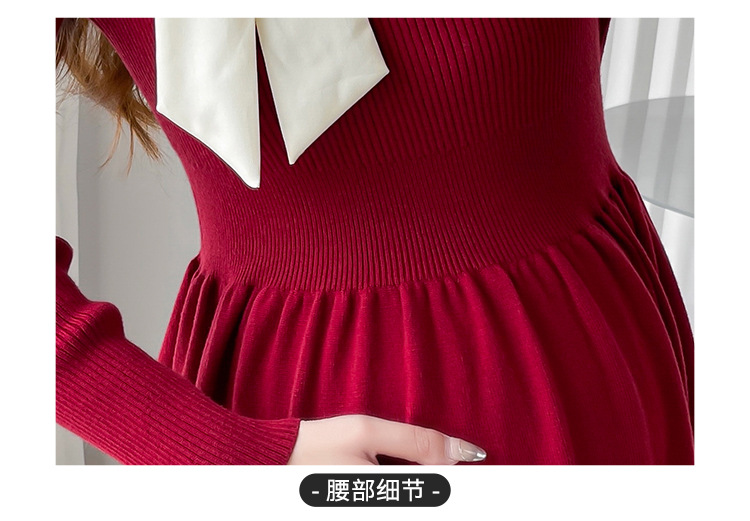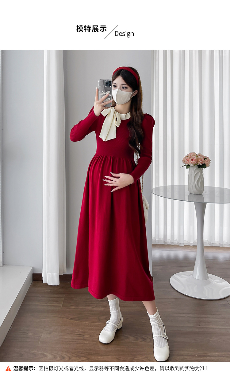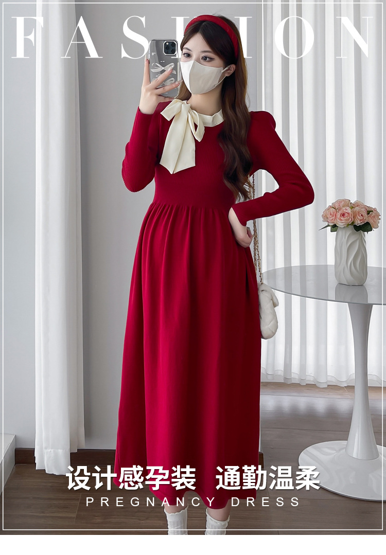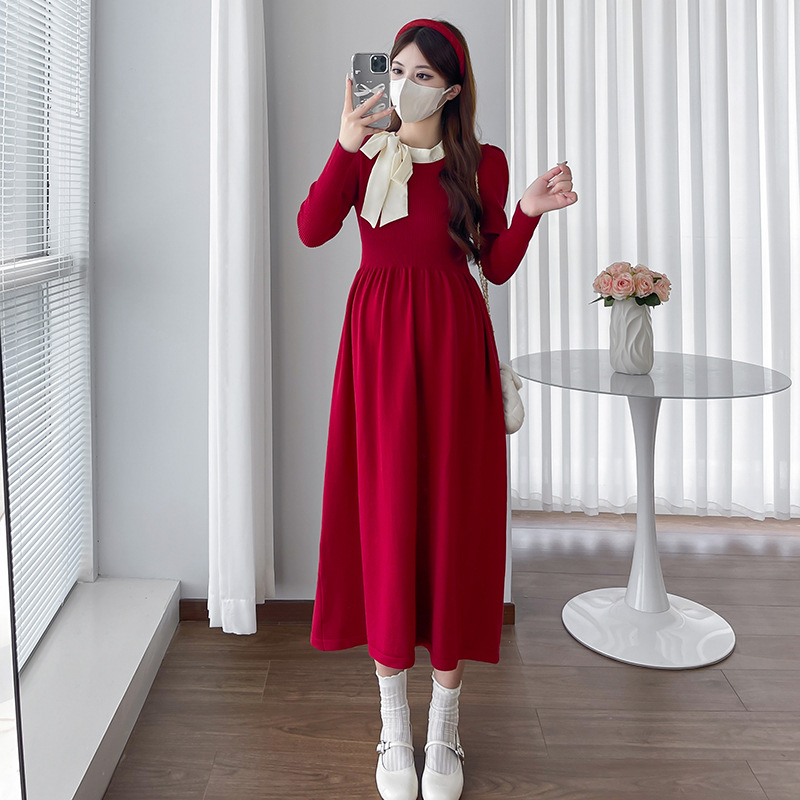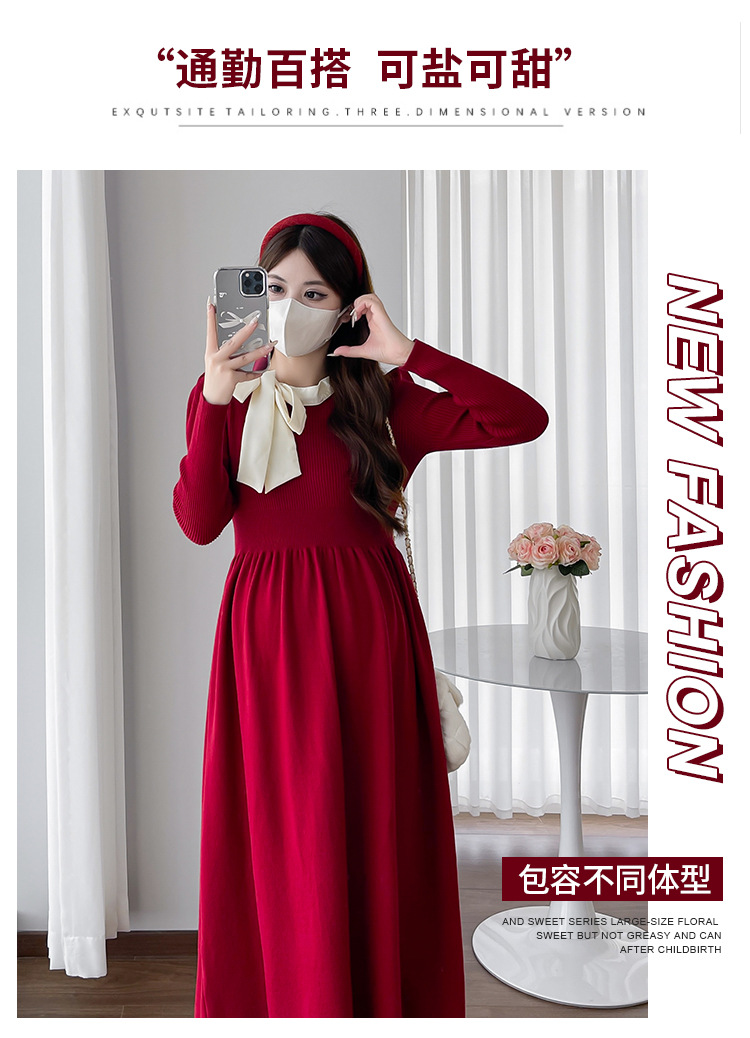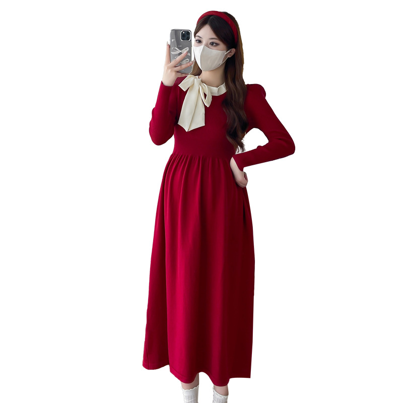 Красное платье для кормящих мода маленький ароматный бант большой размер толстый вязаный свитер для беременных осенью и зимой