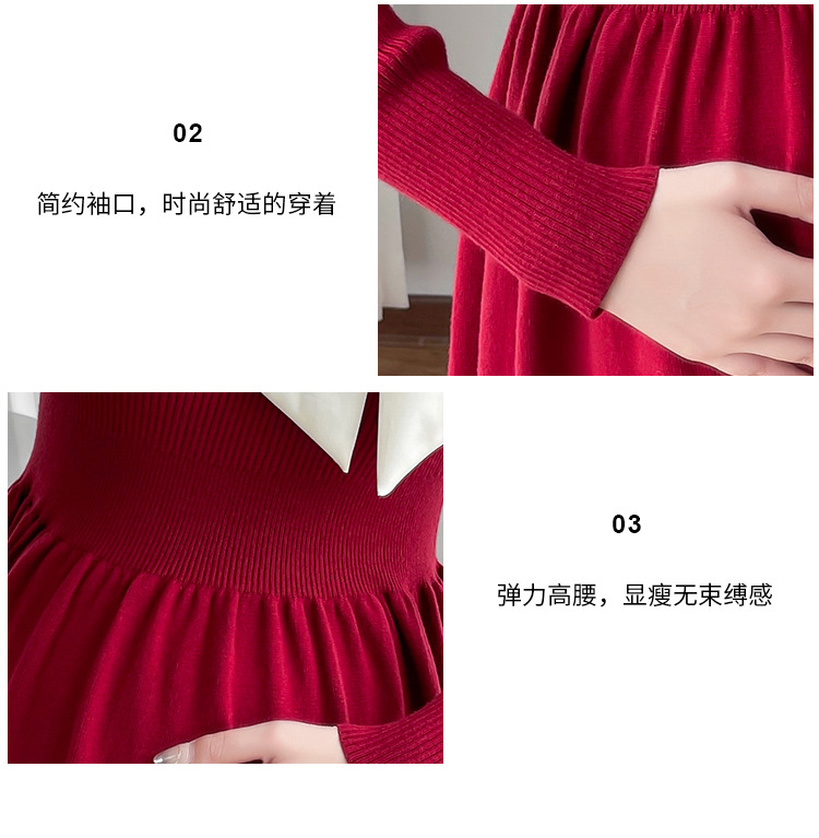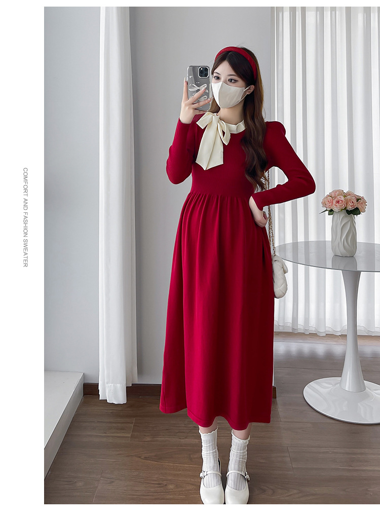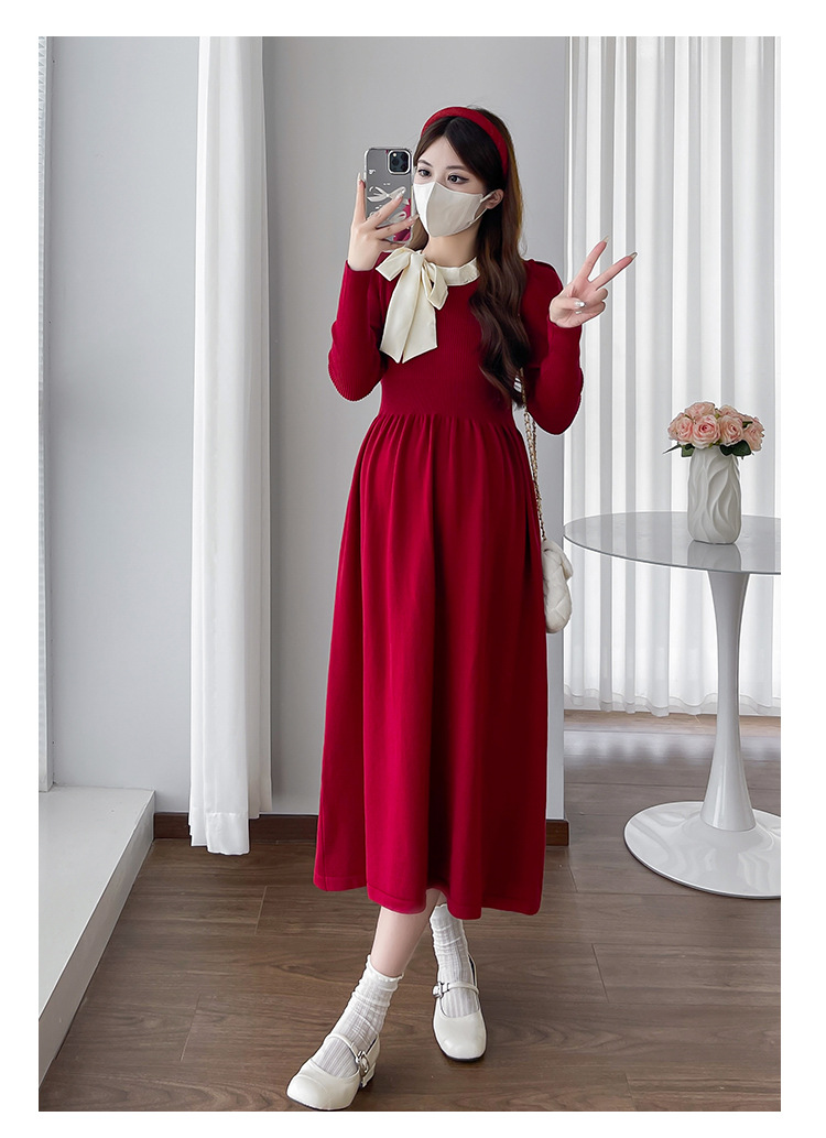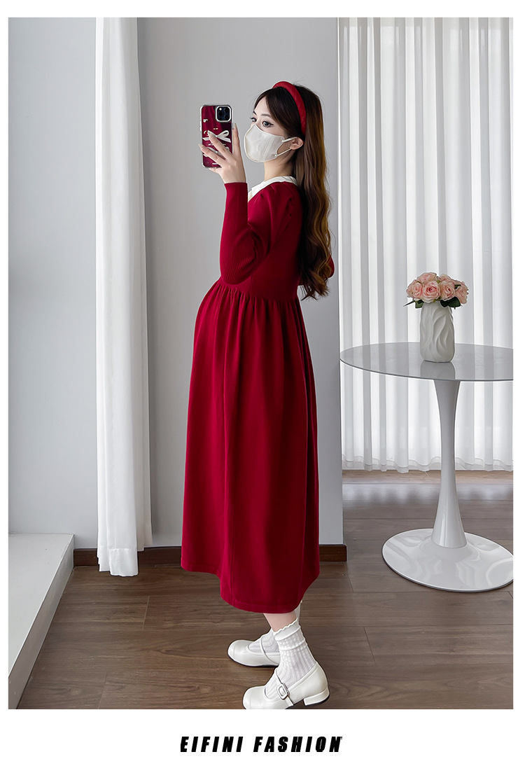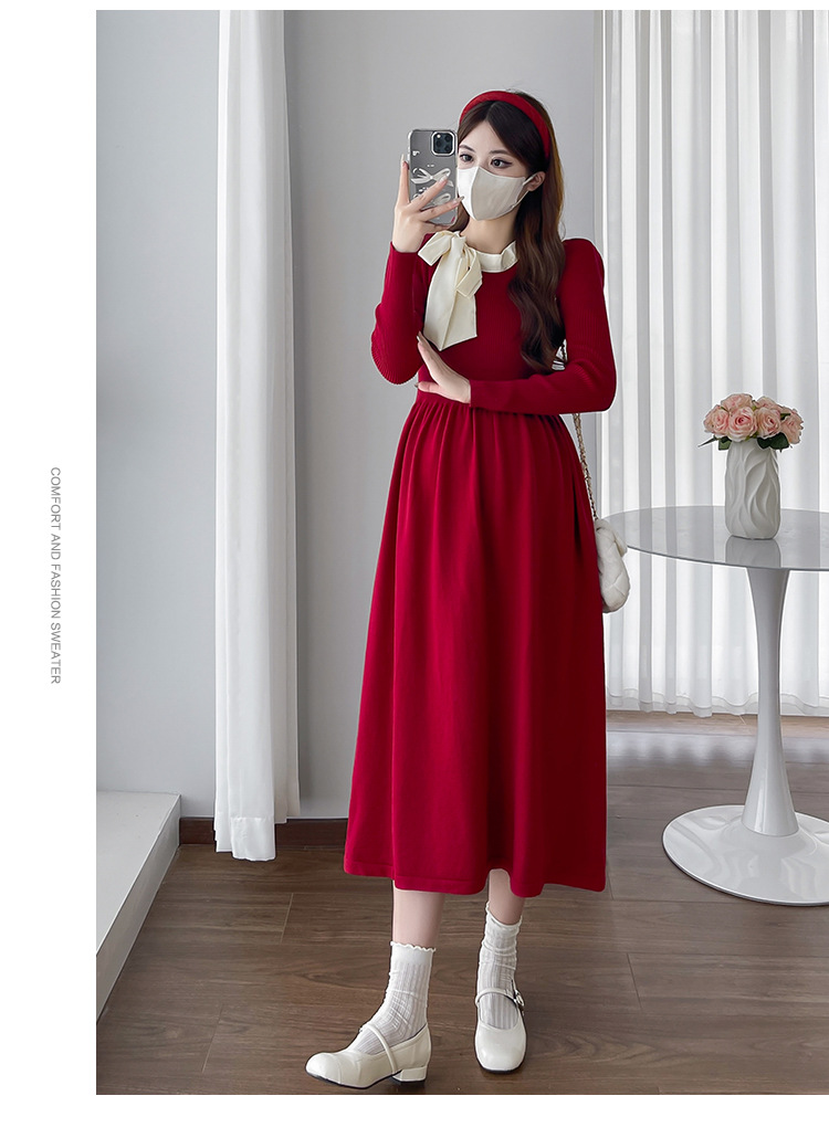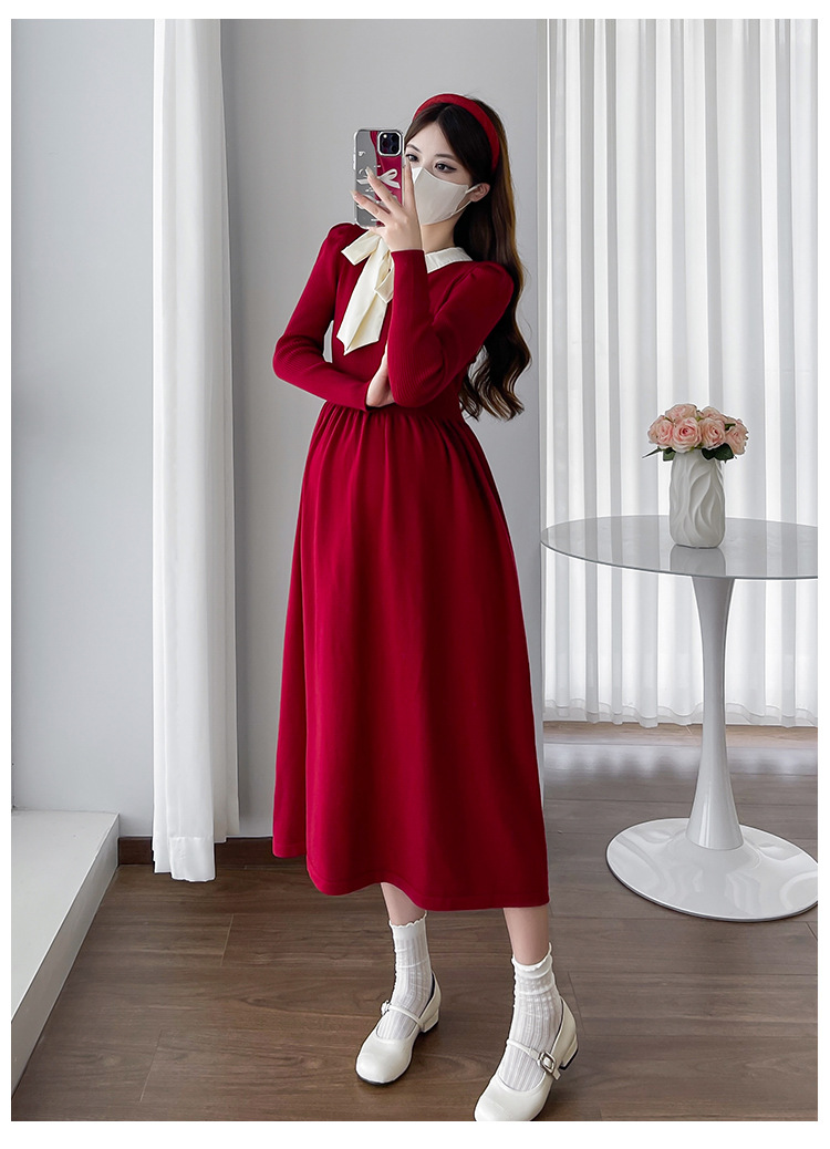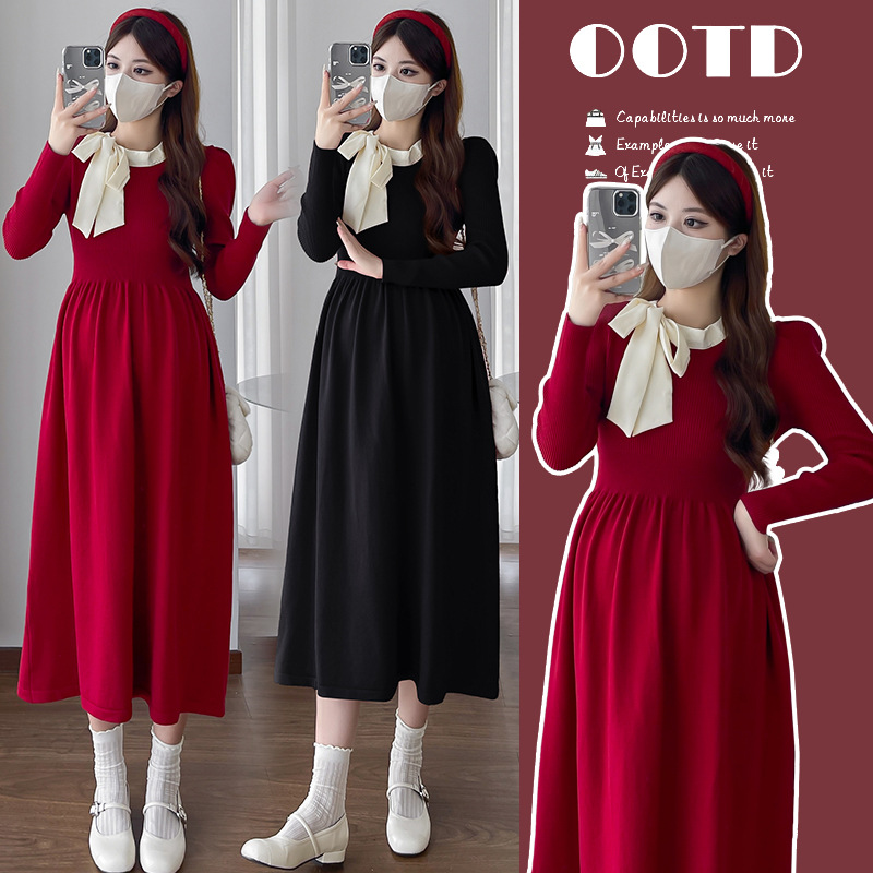 Красное платье для кормящих мода маленький ароматный бант большой размер толстый вязаный свитер для беременных осенью и зимой