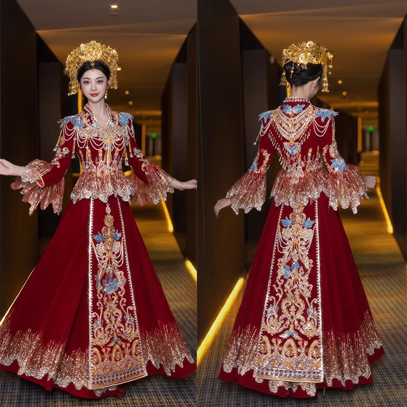 Высококачественный бархатный костюм Xiuhe с v-образным вырезом для невесты, новый стиль, маленький утягивающий вид, шинуазри, кимоно для свадебного шоу, шинуазри