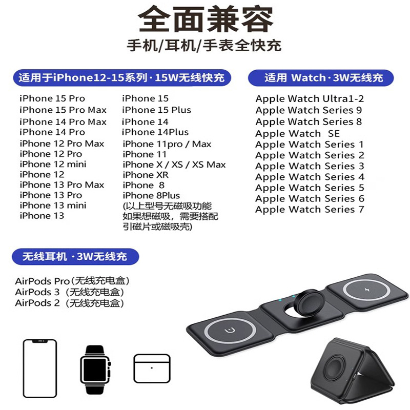 Производитель магнитных беспроводных зарядных устройств «три в одном», оптовая продажа, складная магнитная беспроводная зарядка, подходящая для мобильных телефонов и часов Apple.