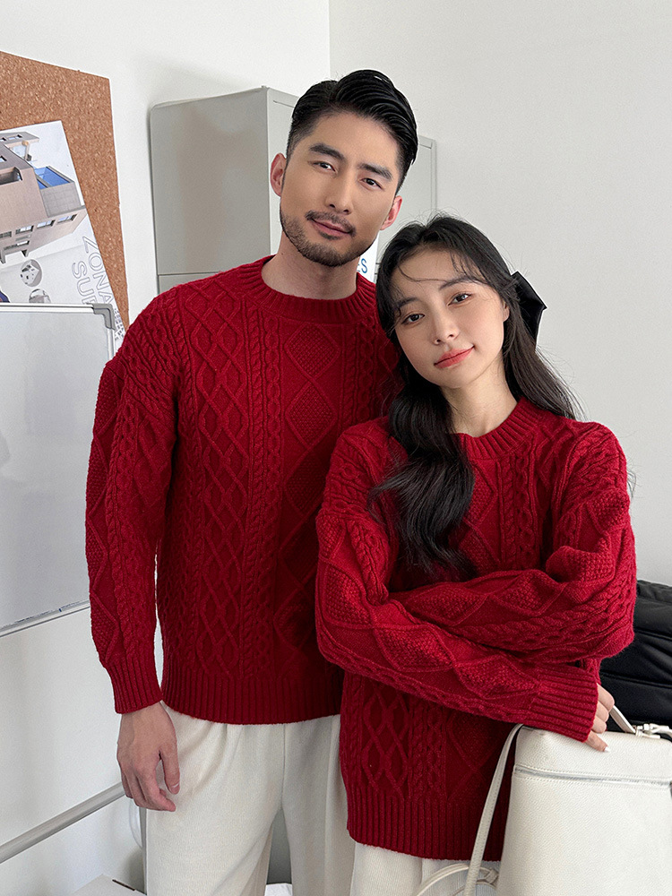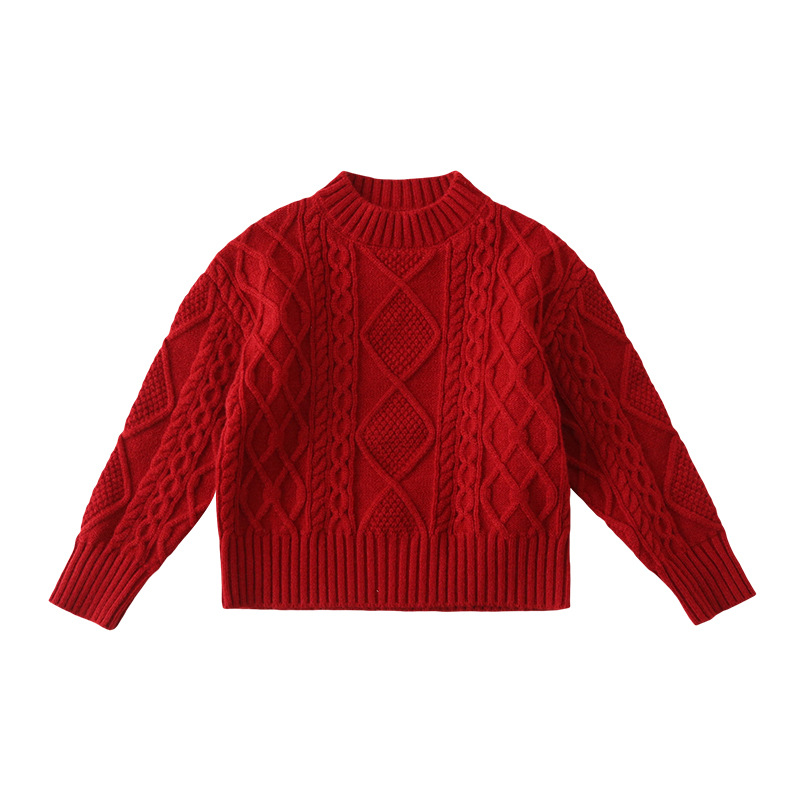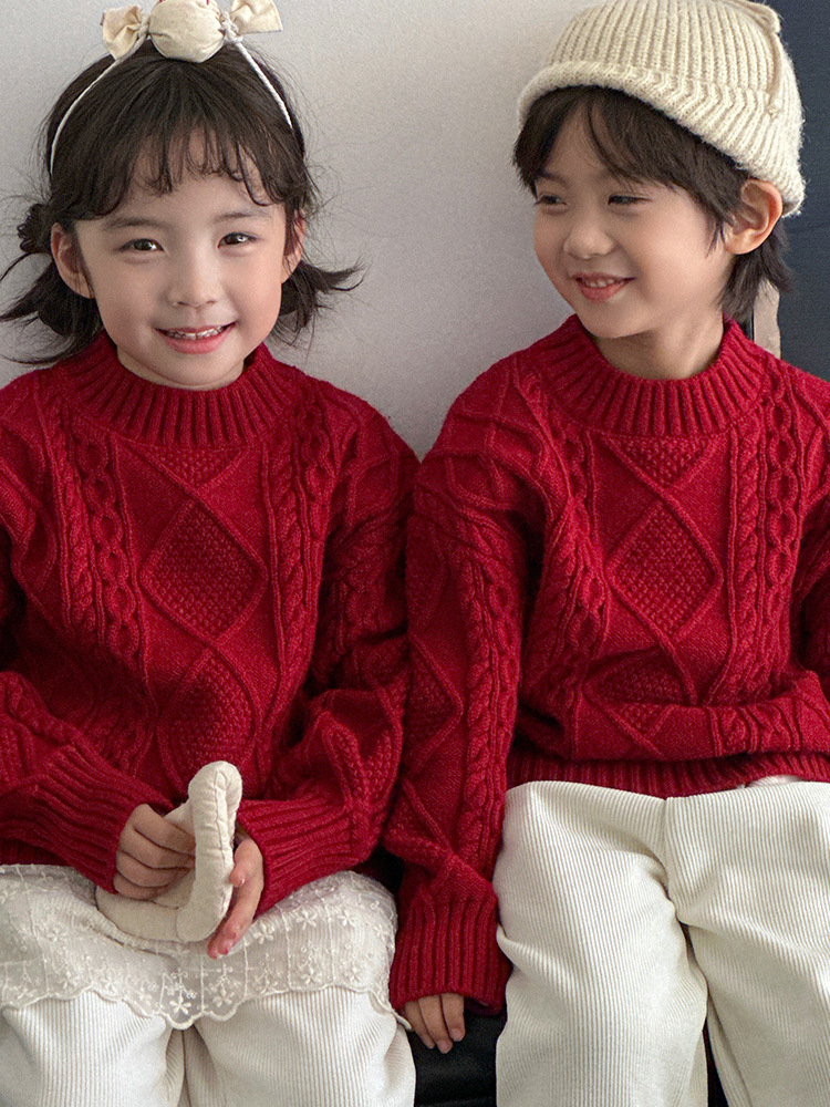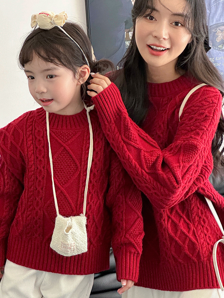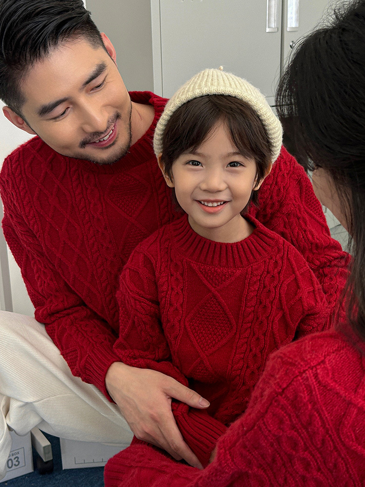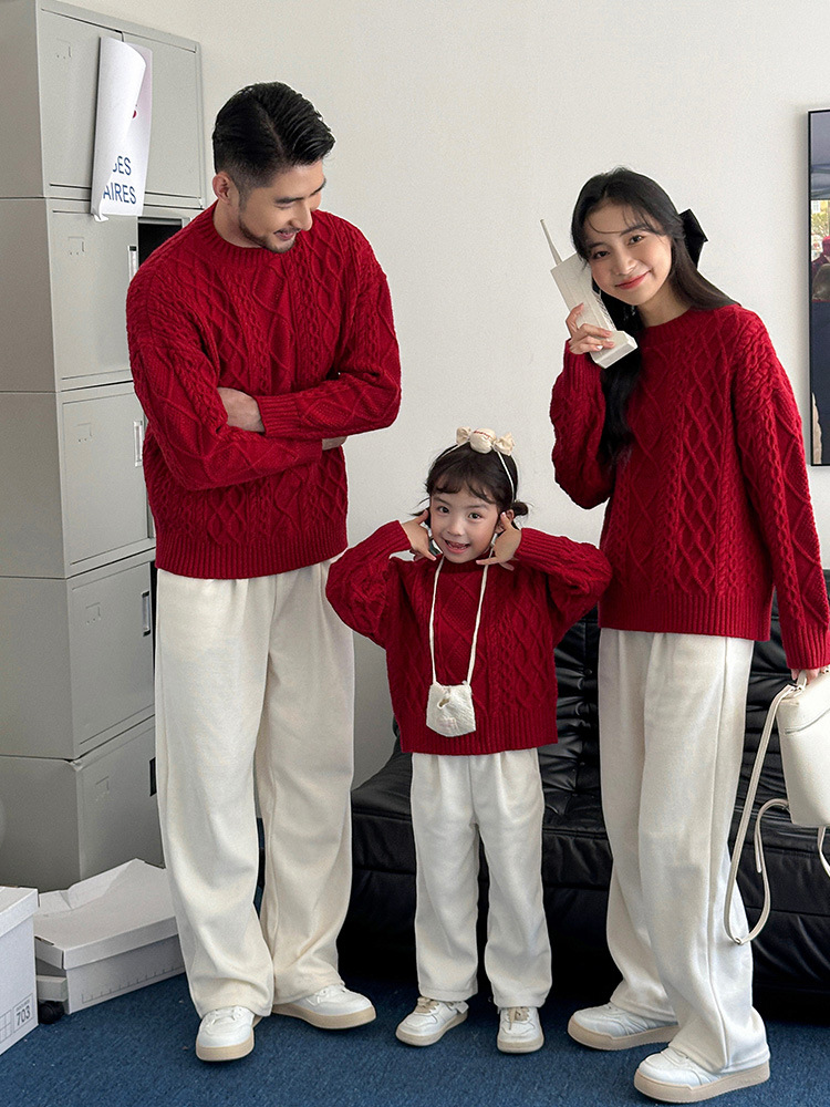 Родина и ребенок в красном свитере