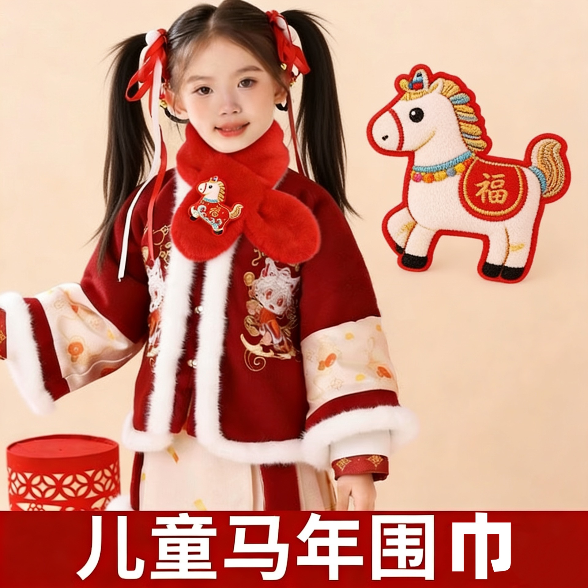 Детский шарф на Новый год - Лошадь удачи; Детский новогодний шарф - Счастливый Дракон; Детский шарф на Новый год - Танец белого льва; Детский новогодний шарф — Белый Цератопс; Детский новогодний шарф — Красный Цератопс; Детский новогодний шарф - Красный Бог богатства; Детский шарф на Новый год - Сумка с сюрпризами; Детский шарф на Новый год - Красная змея с сокровищами