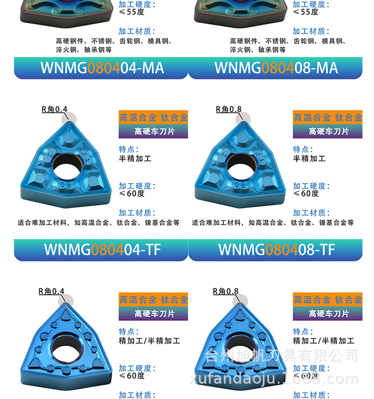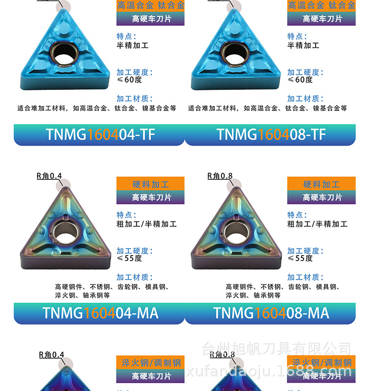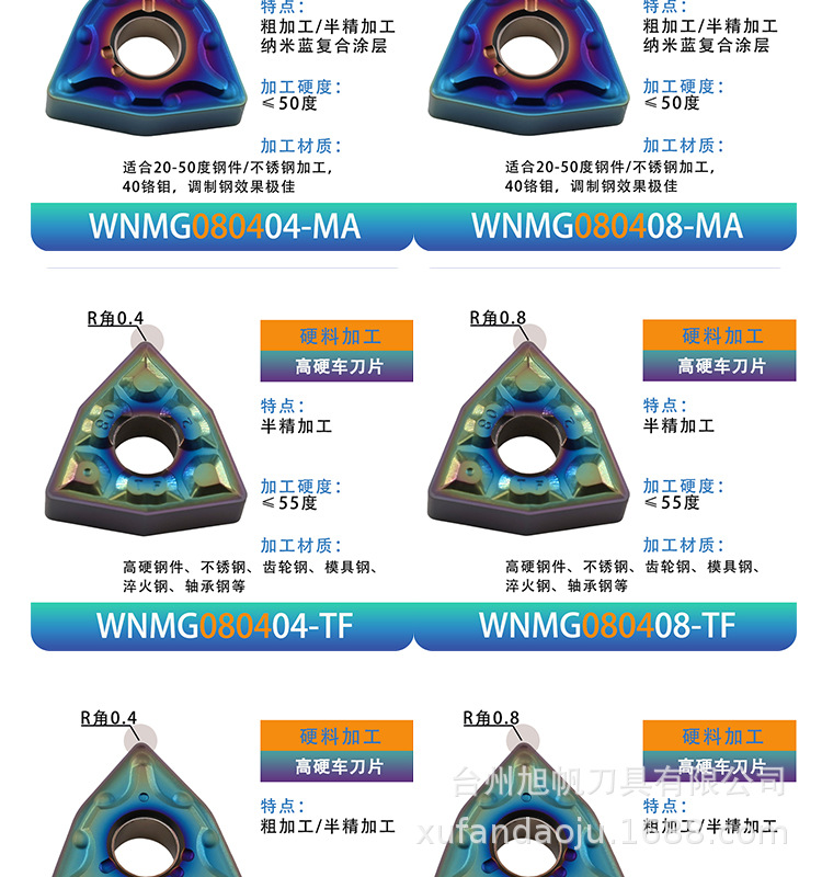 ВНМГ080404-Закаленная сталь МА/модулированная сталь DP6150; ВНМГ 080408 -Закаленная сталь МА/модулированная сталь DP6150; ВНМГ080404-TF красочная обработка твердого материала на 55 градусов DU6150; ВНМГ080408-TF красочная обработка твердого материала на 55 градусов DU6150; ВНМГ080404-MA Красочная 55-градусная обработка твердого материала DU6150; ВНМГ080408-MA Красочная 55-градусная обработка твердого материала DU6150; ВНМГ080404-TF, высокая твердость, высокая температура, обработка твердого материала 50–60 градусов DH6160.; ВНМГ080408-TF, высокая твердость, высокая температура, обработка твердого материала 50–60 градусов DH6160.; ВНМГ080404-МС, высокая твердость и высокая температура, обработка твердого материала 50–60 градусов DH6160.; ВНМГ080408-МС, высокая твердость и высокая температура, обработка твердого материала 50–60 градусов DH6160.; ВНМГ0804012-МС, высокая твердость и высокая температура, обработка твердого материала 50–60 градусов DH6160.