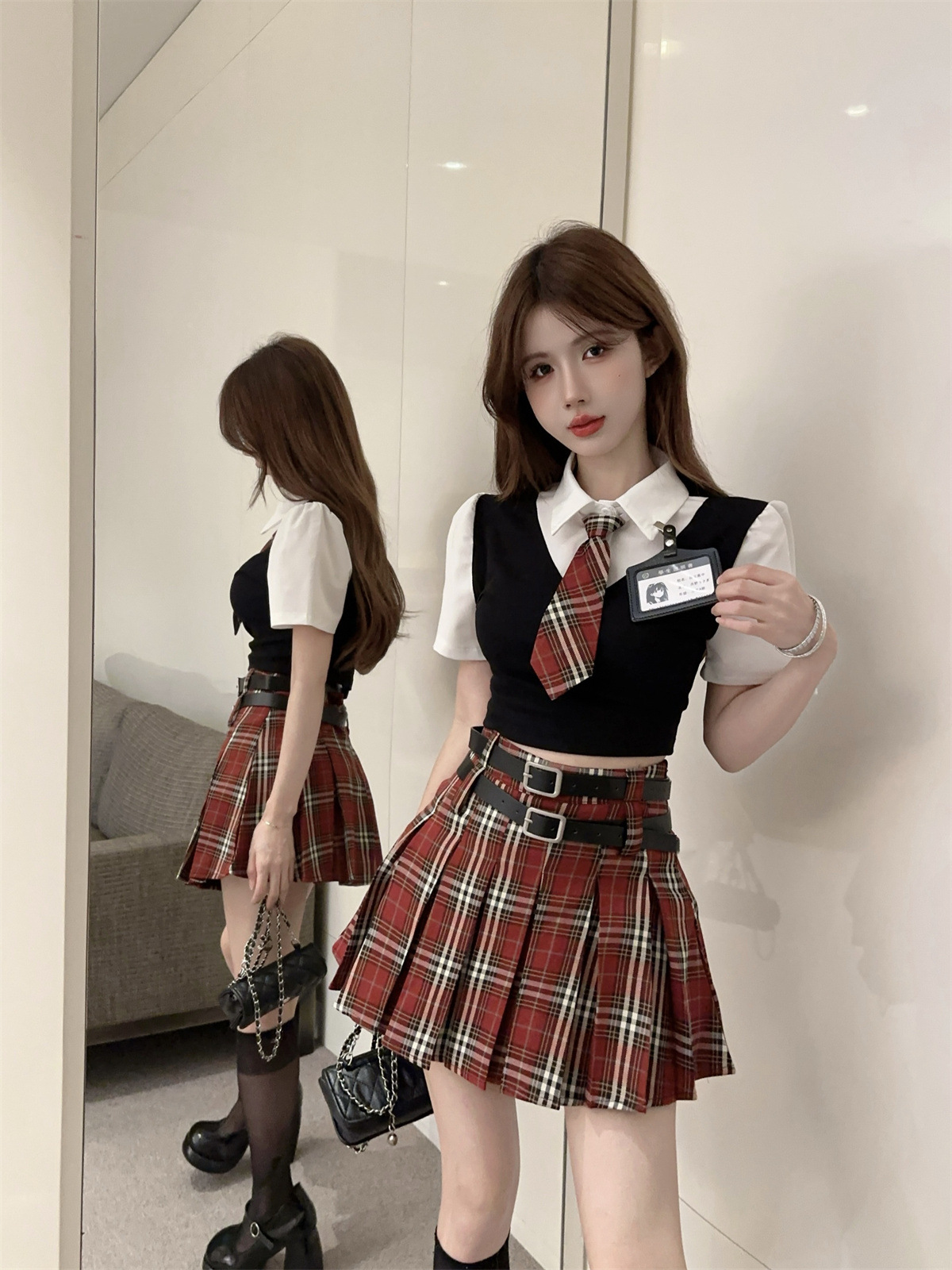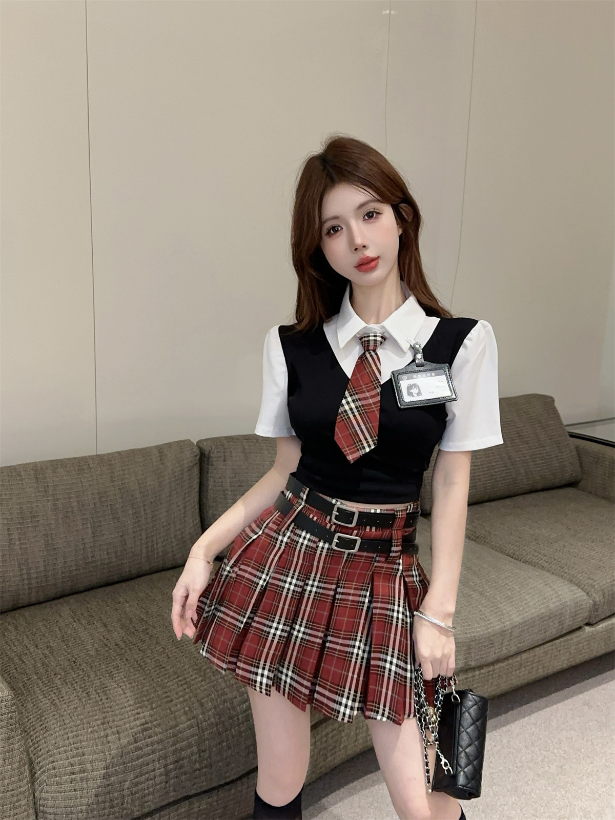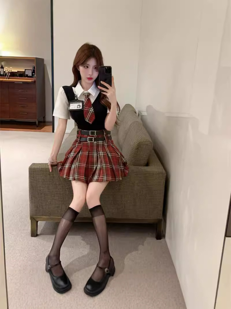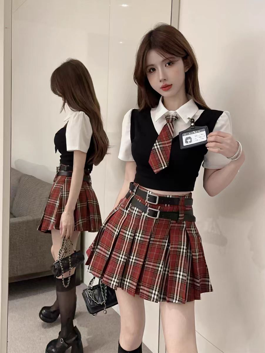 Поддельный топ из двух частей (с галстуком + значком); Поддельный топ-двойка + красная клетчатая юбка (в комплекте с поясом)
