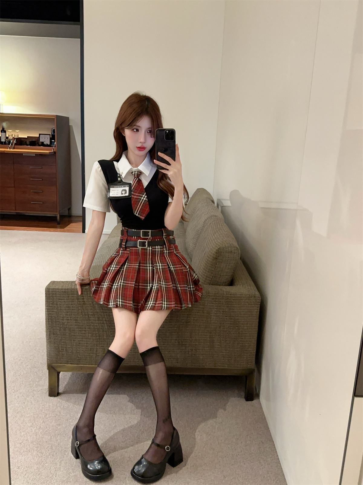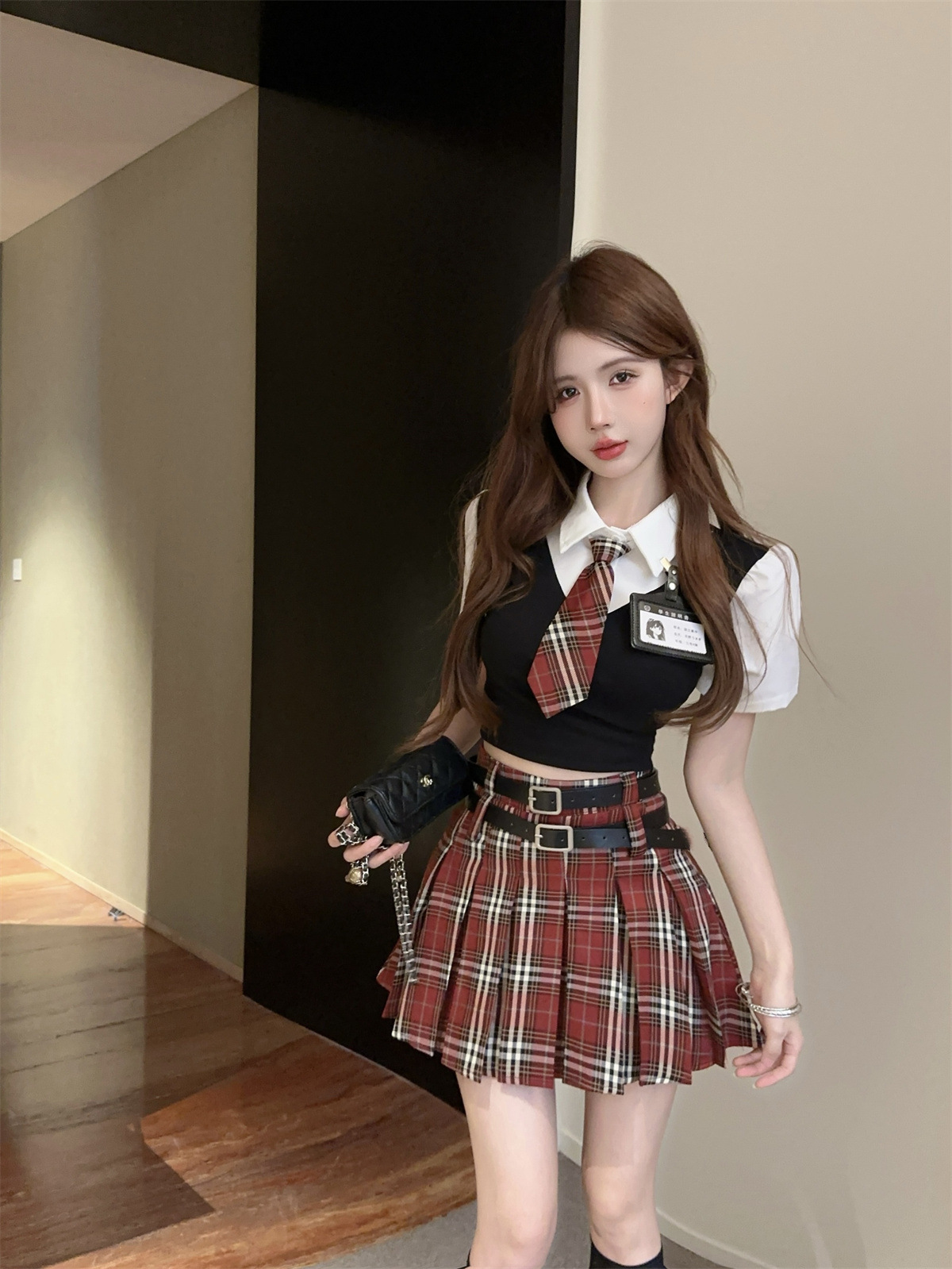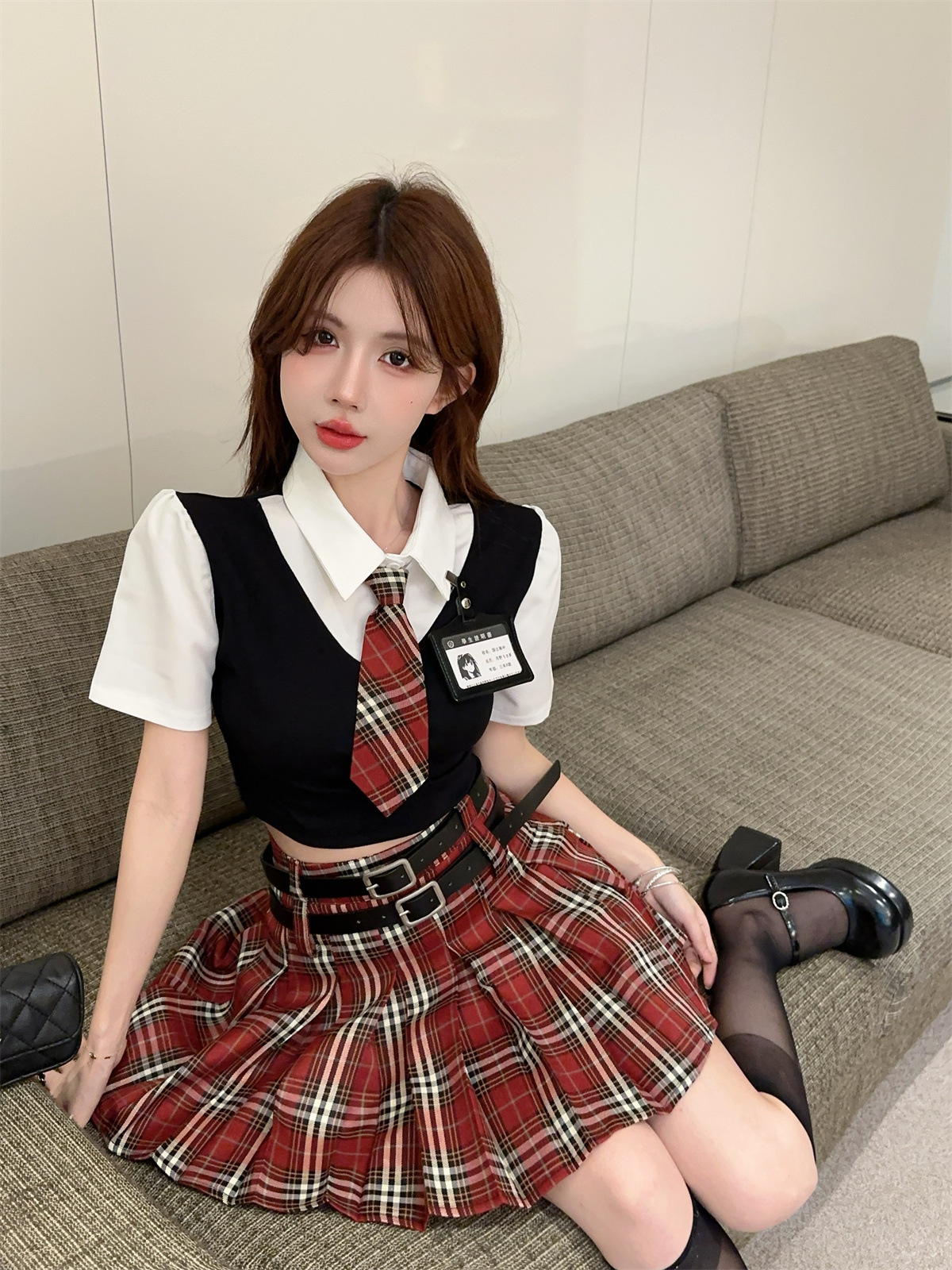 Поддельный топ из двух частей (с галстуком + значком); Поддельный топ-двойка + красная клетчатая юбка (в комплекте с поясом)