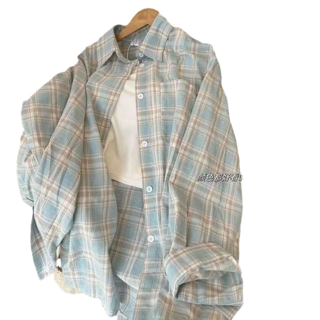 新款美式复古薄款格子长袖衬衫外套夏季设计防晒开衫宽松衬衣