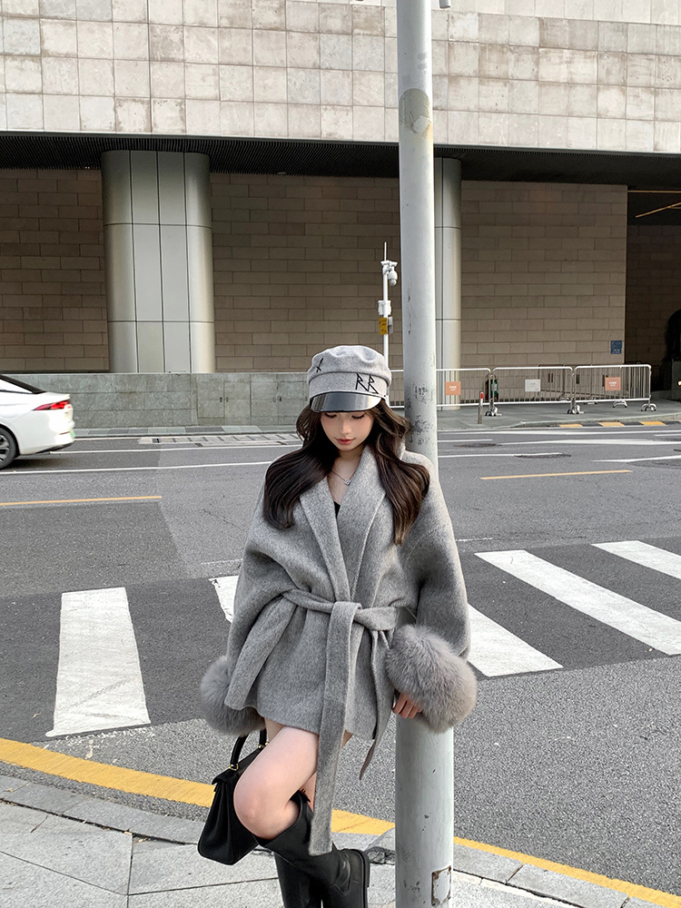 [Фабрика спот] Серый ремешок для талии шерстяная куртка женский осенний и зимний длинный рукав свободное пальто