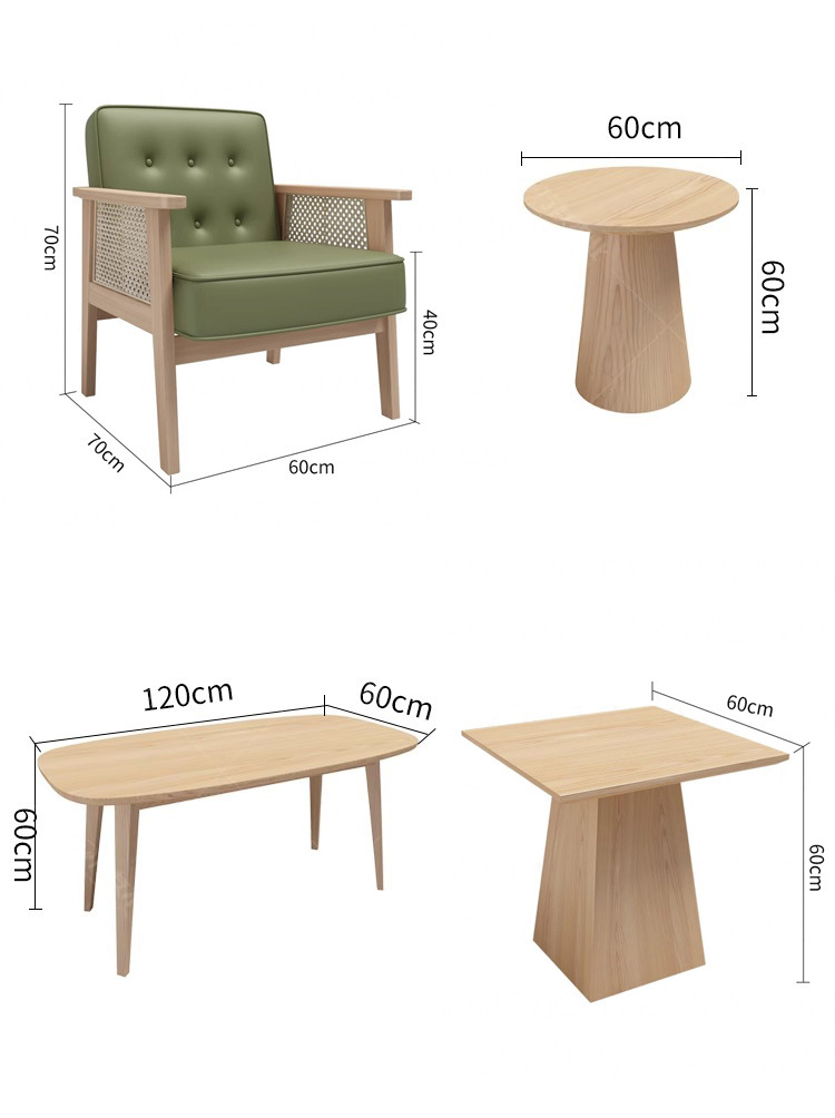 Одноместное сиденье коричневого цвета; Одноместное сиденье брудно-белое; Одиночный ретро зеленый; Двойной коричневый; Двойной белый; Двойной ретро зеленый; Маленький круглый стол (цвет дерева); Маленький квадратный стол (цвет дерева); Длинный стол (цвет дерева); Квадратный стол 60 см (цвет орехового дерева); Круглый стол 60 см (цвет орех); Квадратный стол 60 см (поперечные ножки) (цвет ореха); Стол круглый 60 см (поперечные ножки) (цвет ореха)