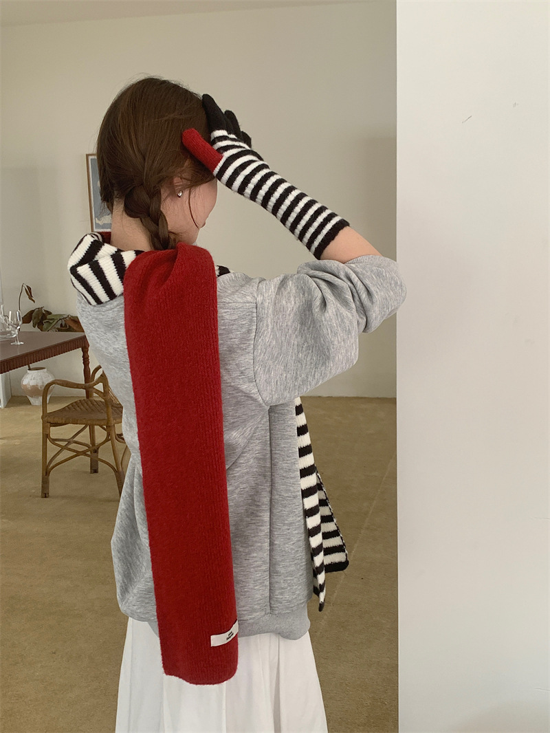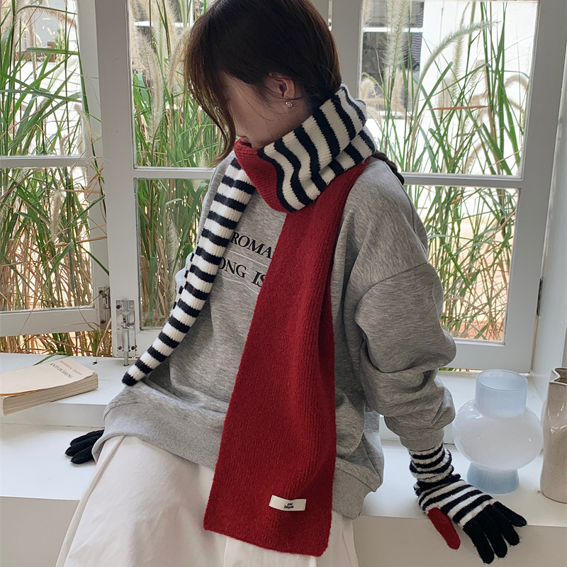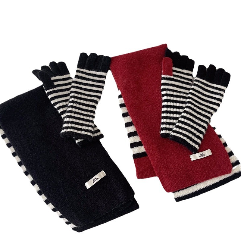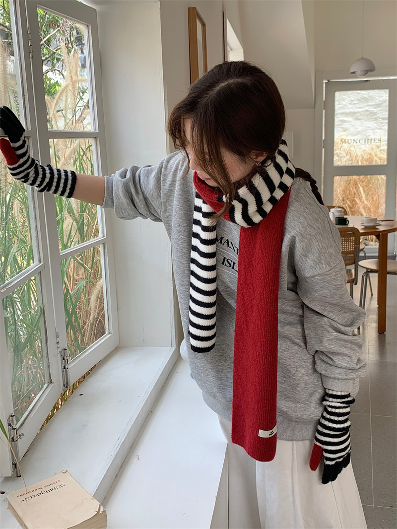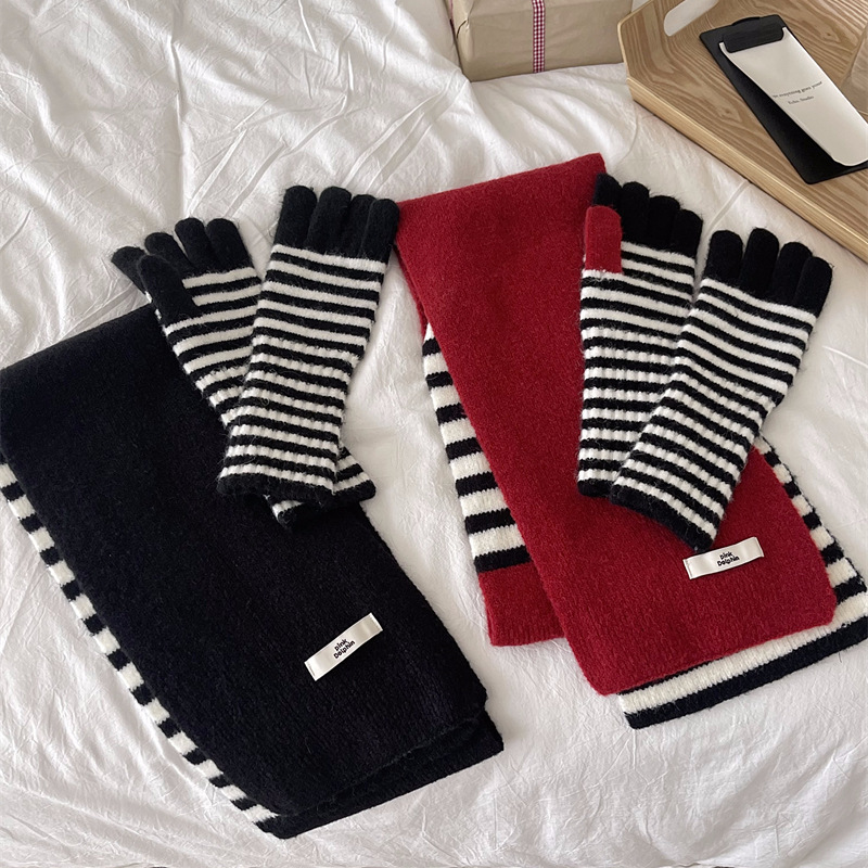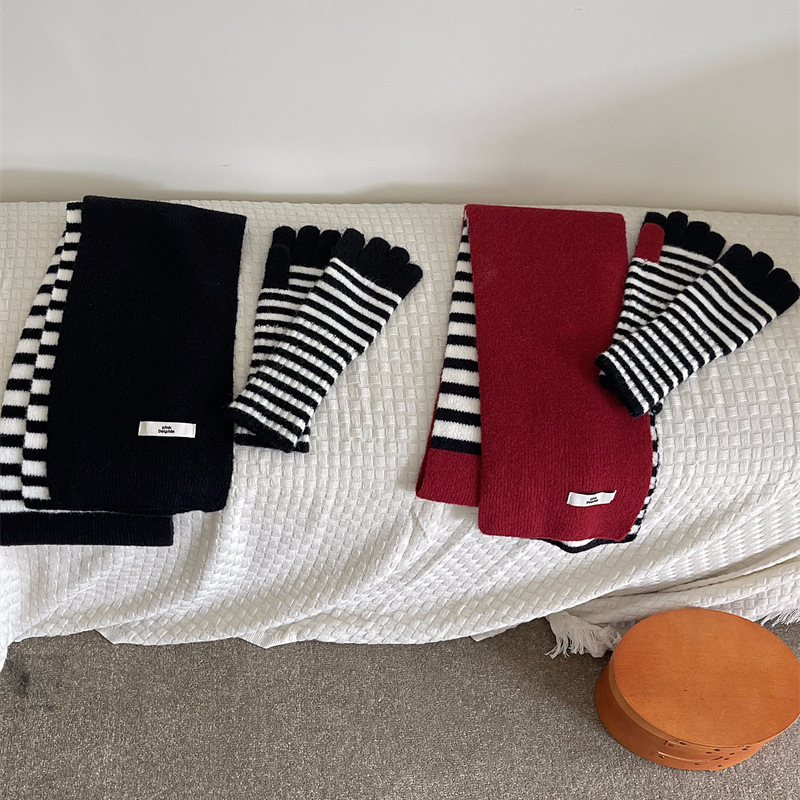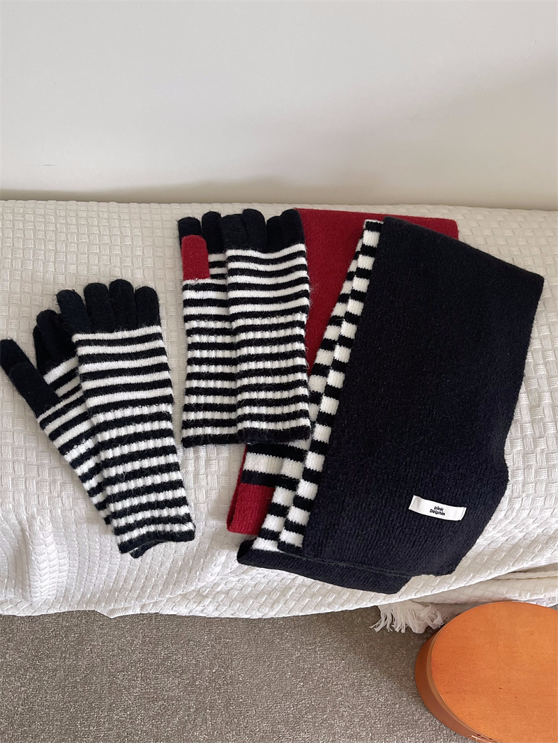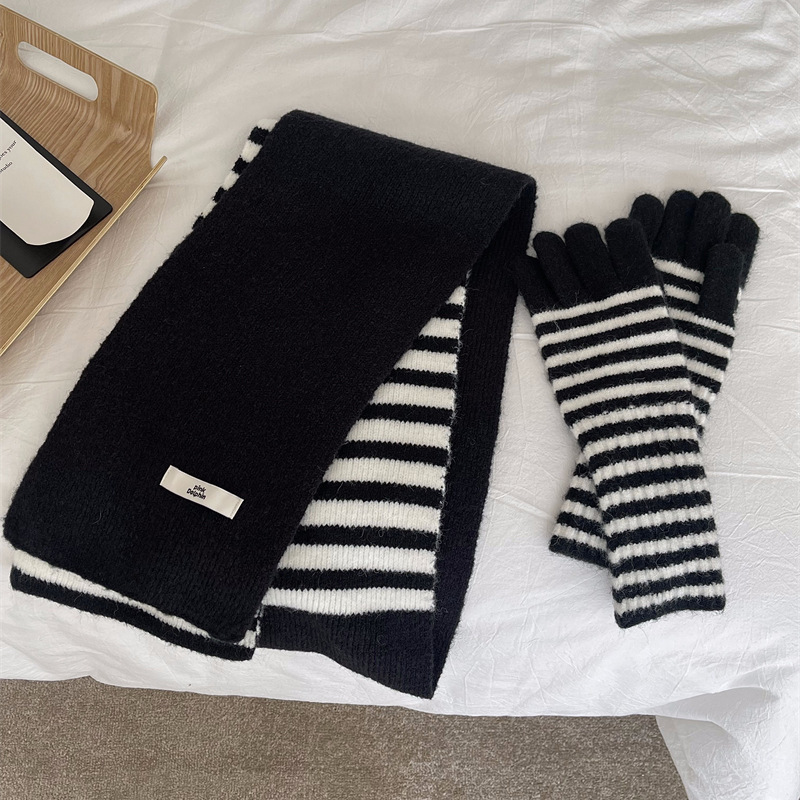 Черно-белая полосатая шерстяная перчатка комбинированный набор шарф женский осенне-зимний утолщенный теплый и холодный трикотаж пара