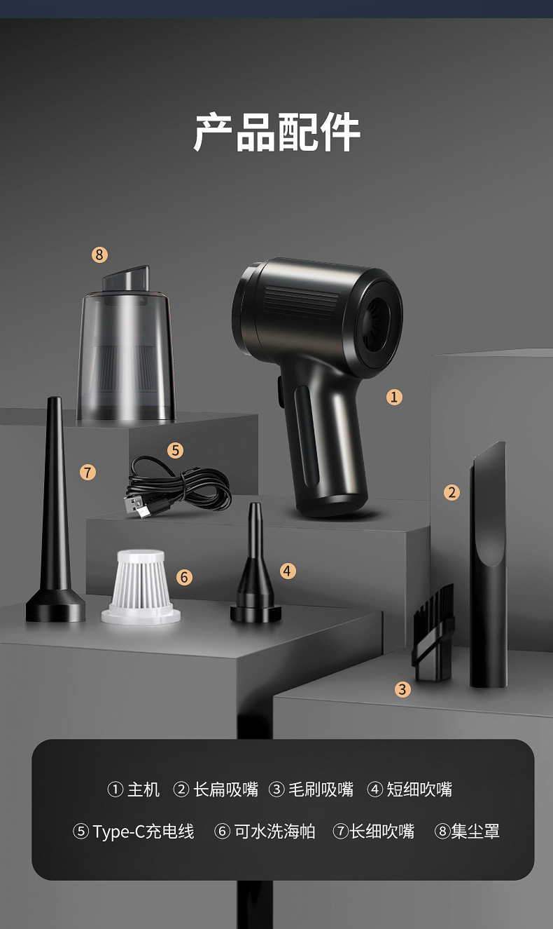 【包装清单】:吸尘器主机、内置海帕滤芯、长扁吸嘴带毛刷、吹气嘴、Type-C接口充电线、6国语言说明书(注:默认英文说明书如需中文说明书亲联系客服)