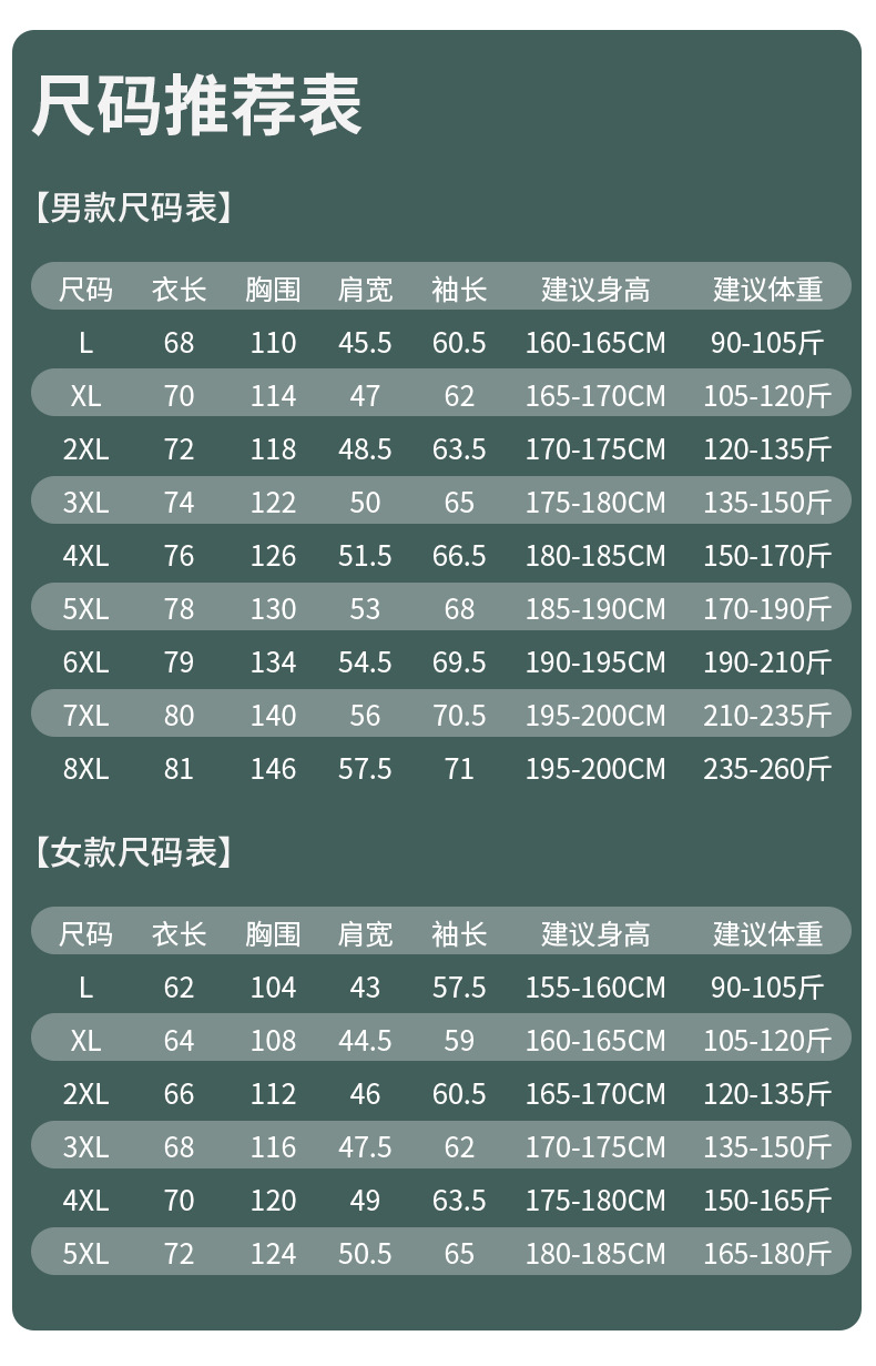 L; XL; 2XL; 3XL; 4XL; 5XL; 6XL; 7XL; 8XL