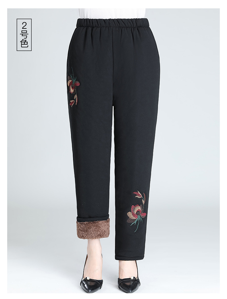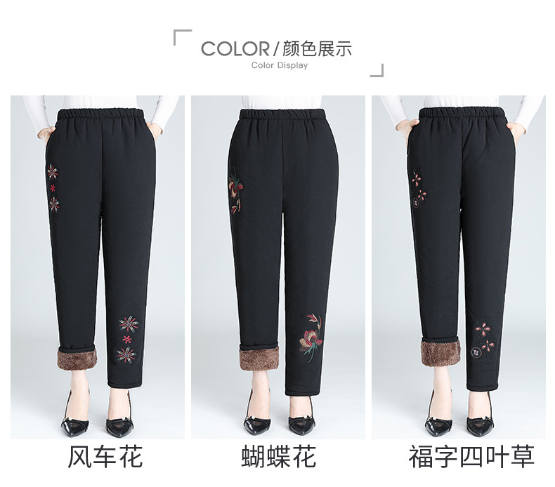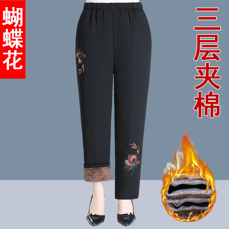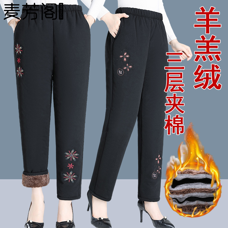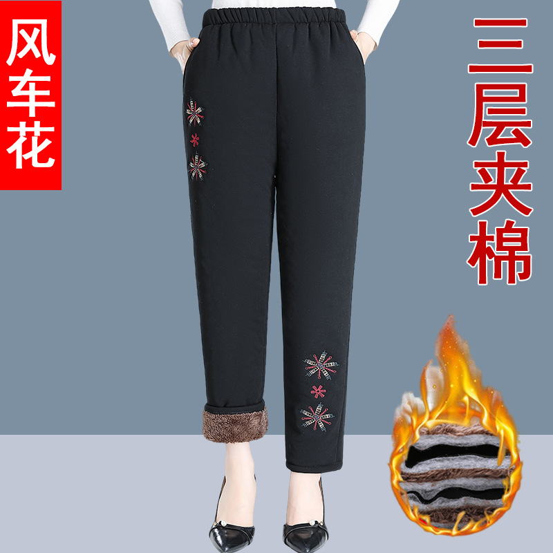Зимние хлопковые брюки для женщин среднего и старшего возраста, утепленные стеганые брюки для бабушки с овечьим флисом, брюки для мамы, вышитые длинные брюки для пожилых женщин.