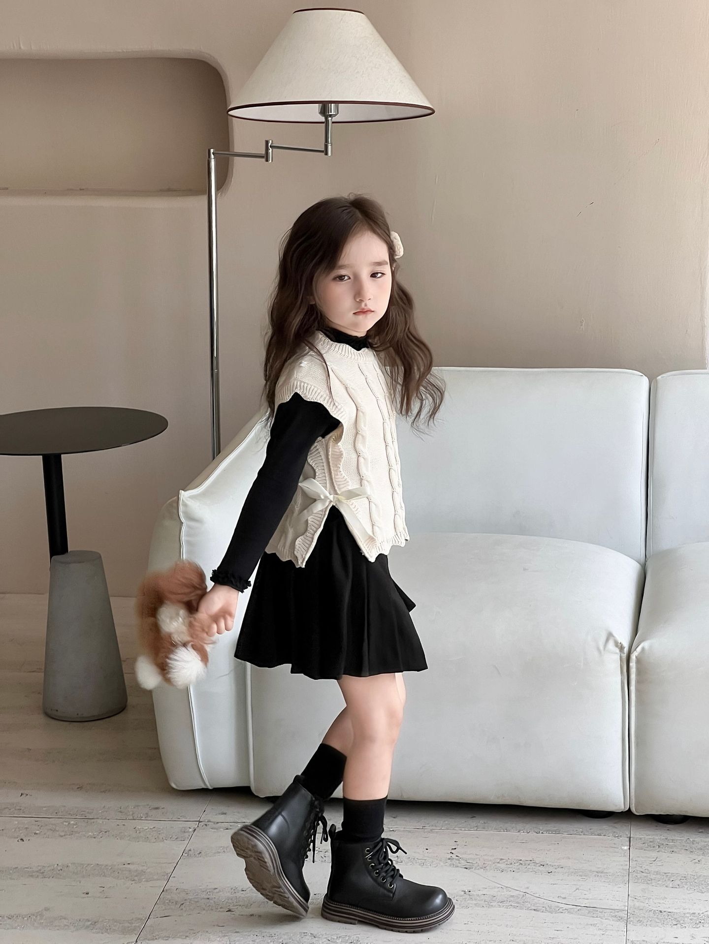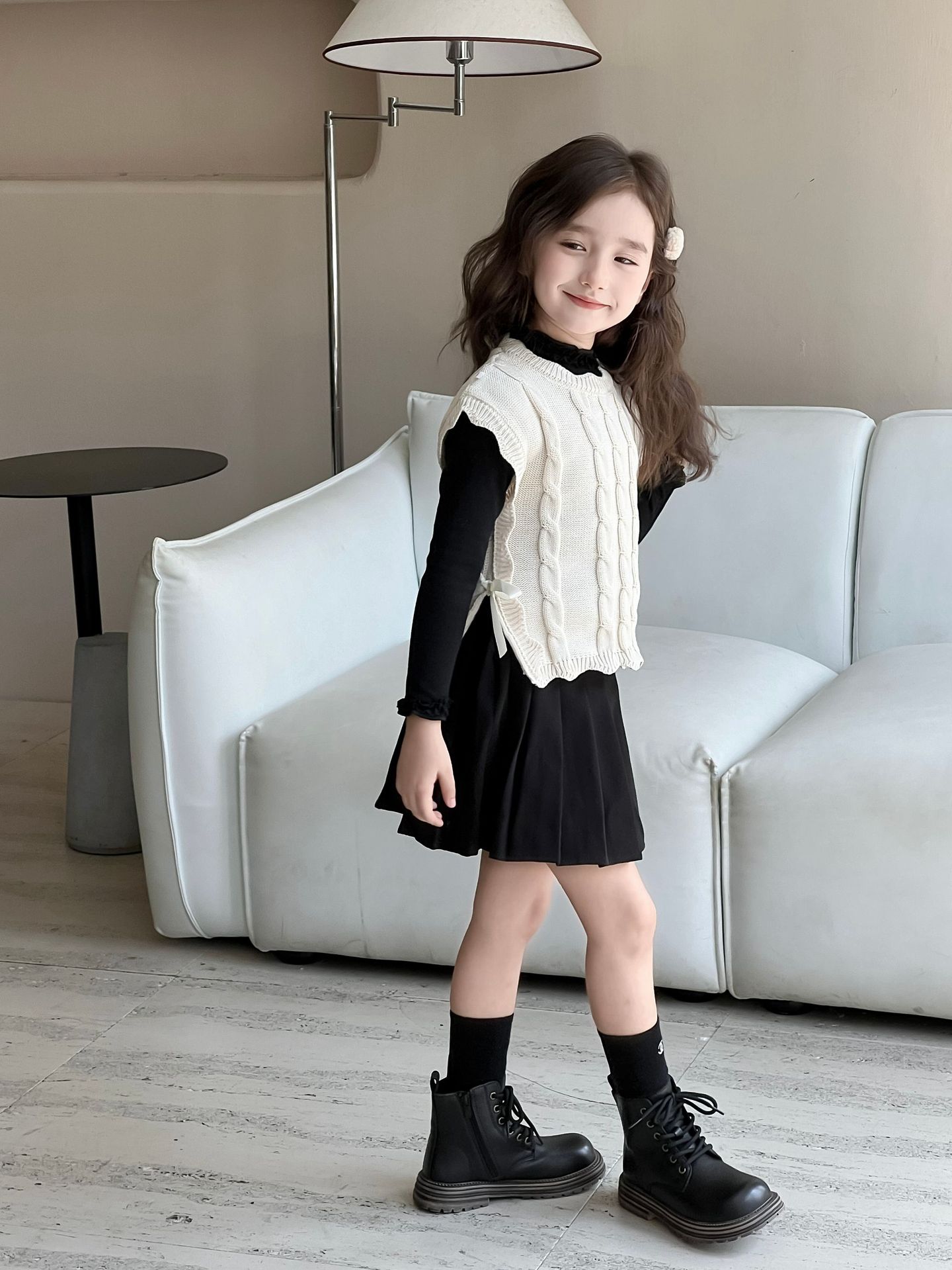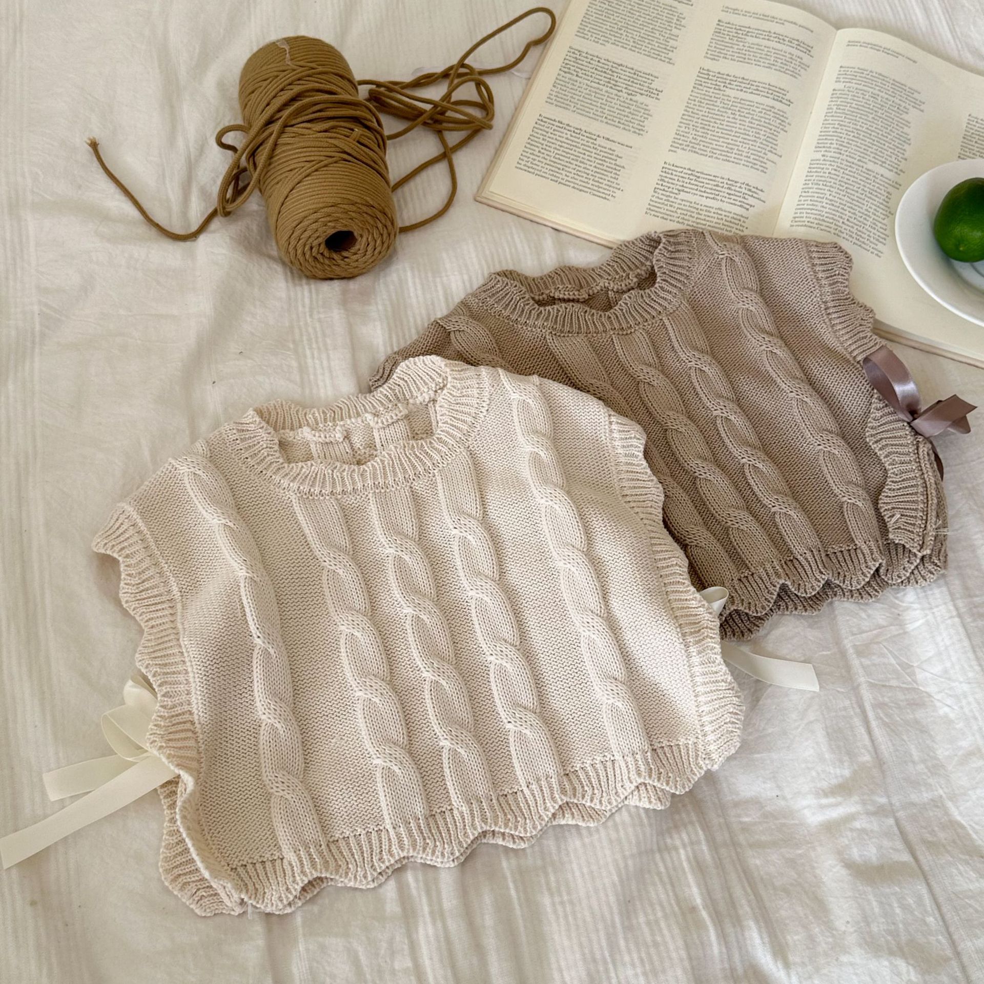 Детский вязаный жилет для девочек, весна-осень 2026, новый, в милом лесном стиле, с кружевом, без рукавов, модный трикотажный топ