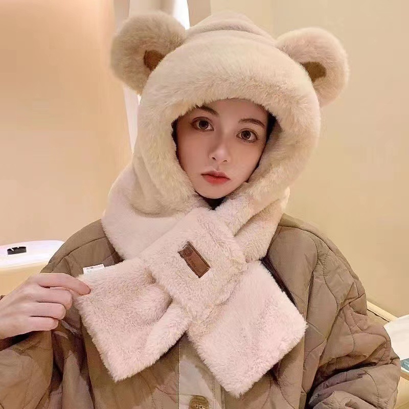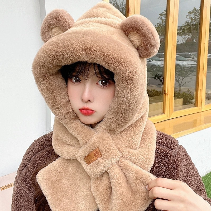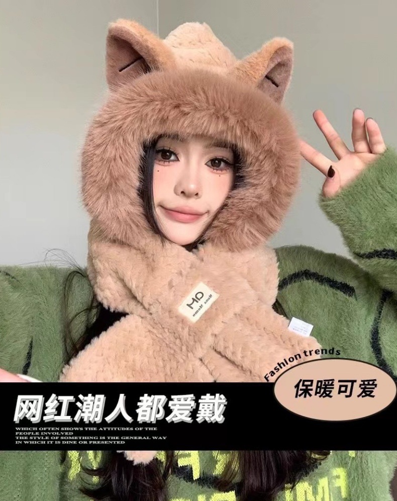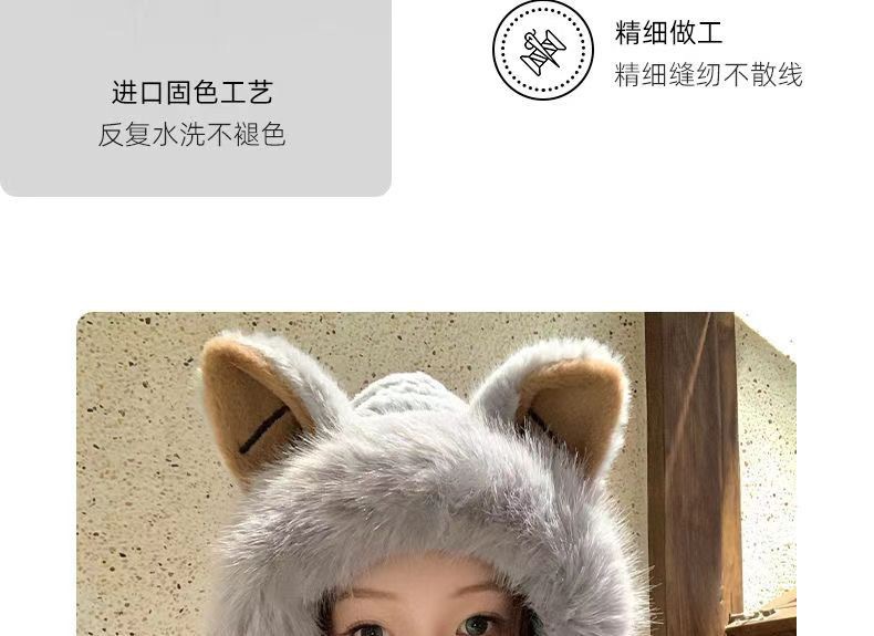 Зимняя милая плюшевая шапка с лисьими ушками, шарф на шею, универсальная теплая шапка, универсальная маленькая осенне-зимняя шапка, демонстрирующая лицо.
