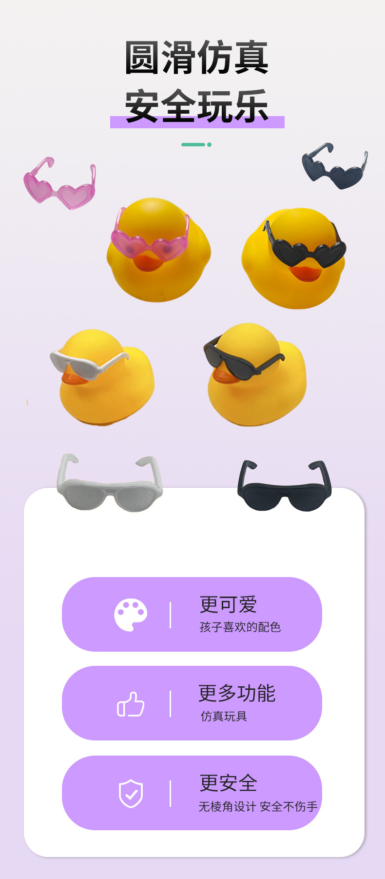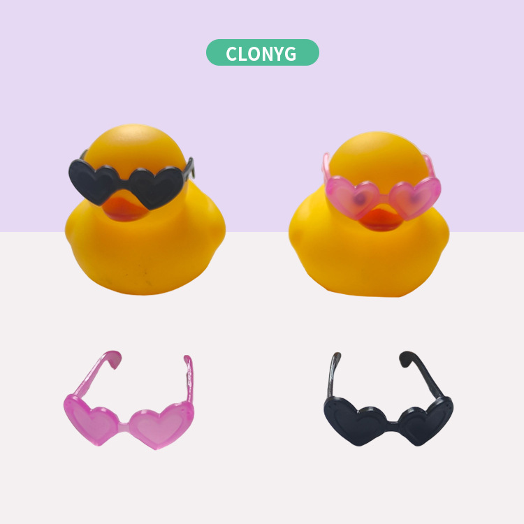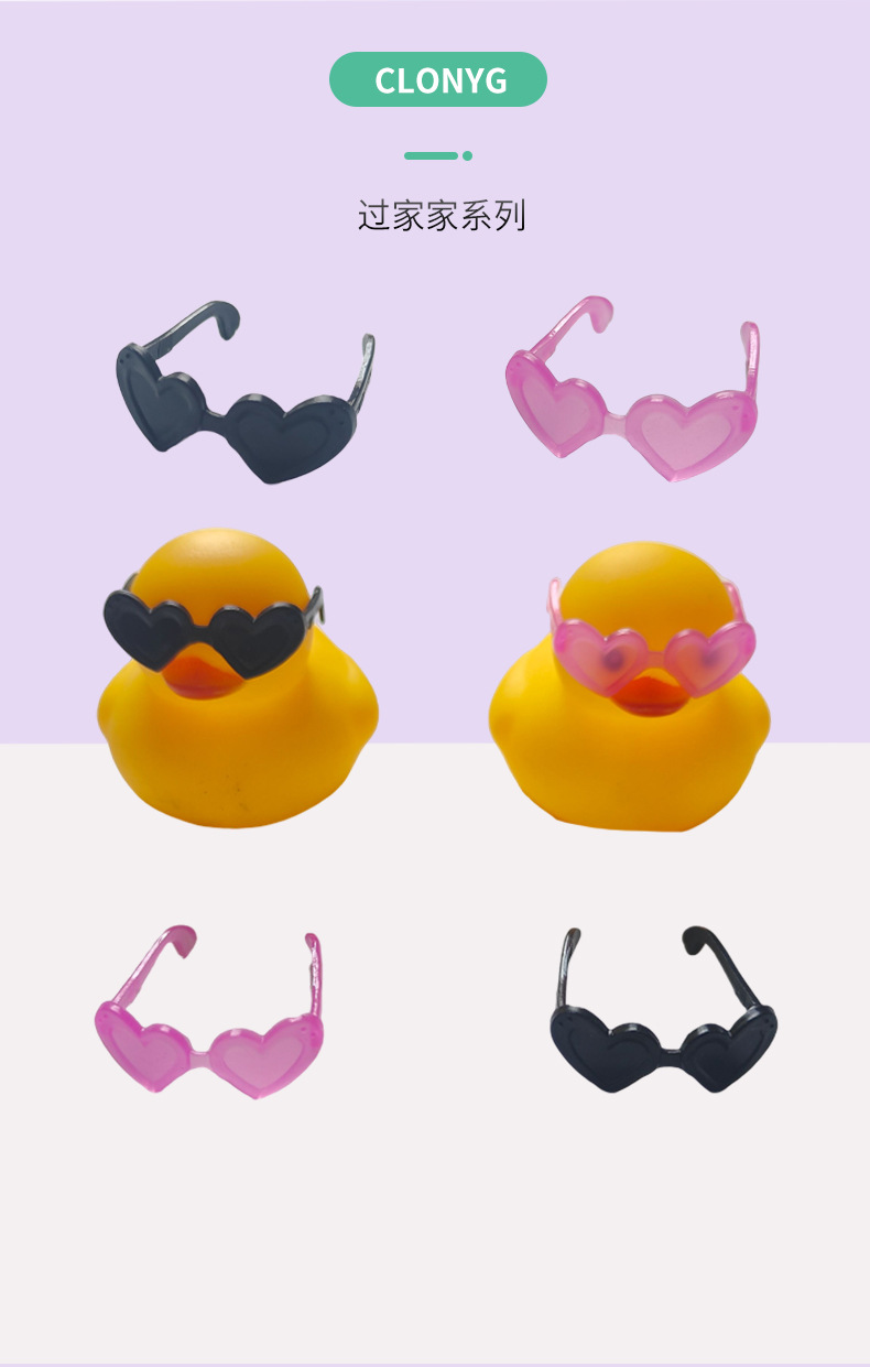 Черные очки в форме сердца; Розовые очки в форме сердца; Черные солнцезащитные очки с маленькой желтой учкой; Белые маленькие желтые очки в виде утки; Синие маленькие желтые солнцезащитные очки в виде утки; Розовые солнцезащитные очки в виде маленькой желтой утки