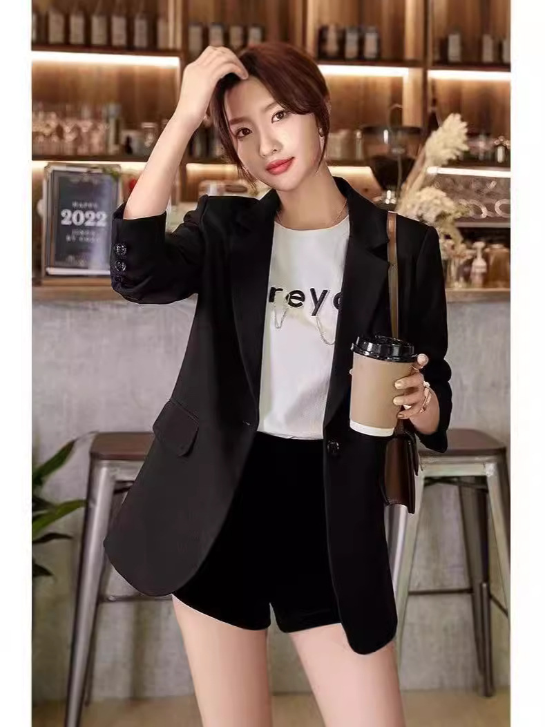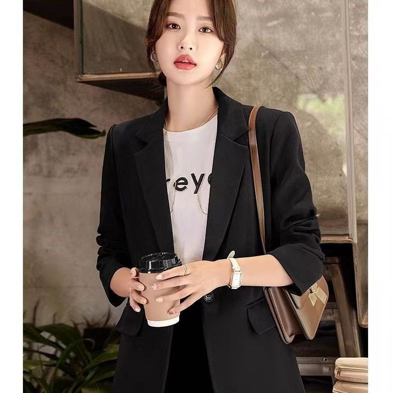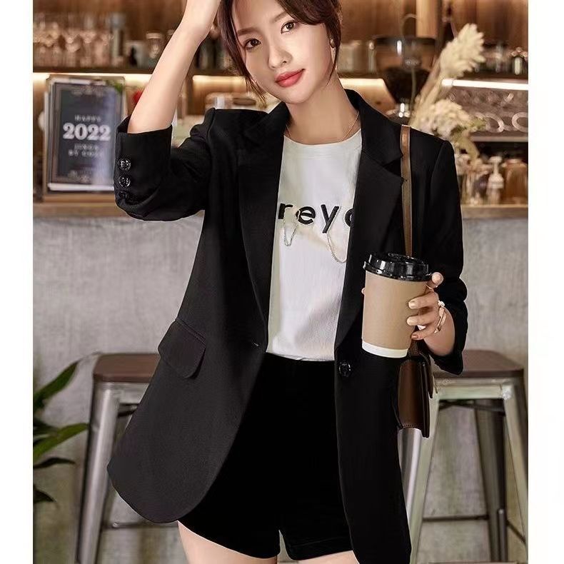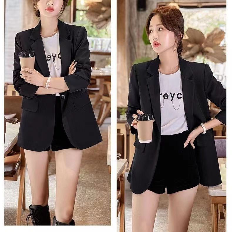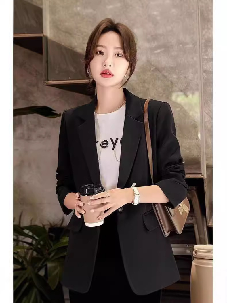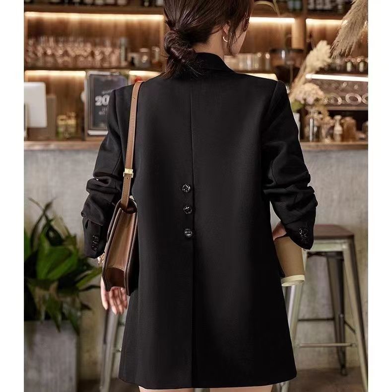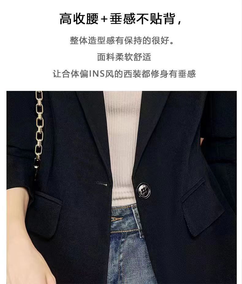 Весенний 2025 универсальный черный блейзер свободного кроя для невысоких женщин с мягкими плечами, утягивающий силуэт.