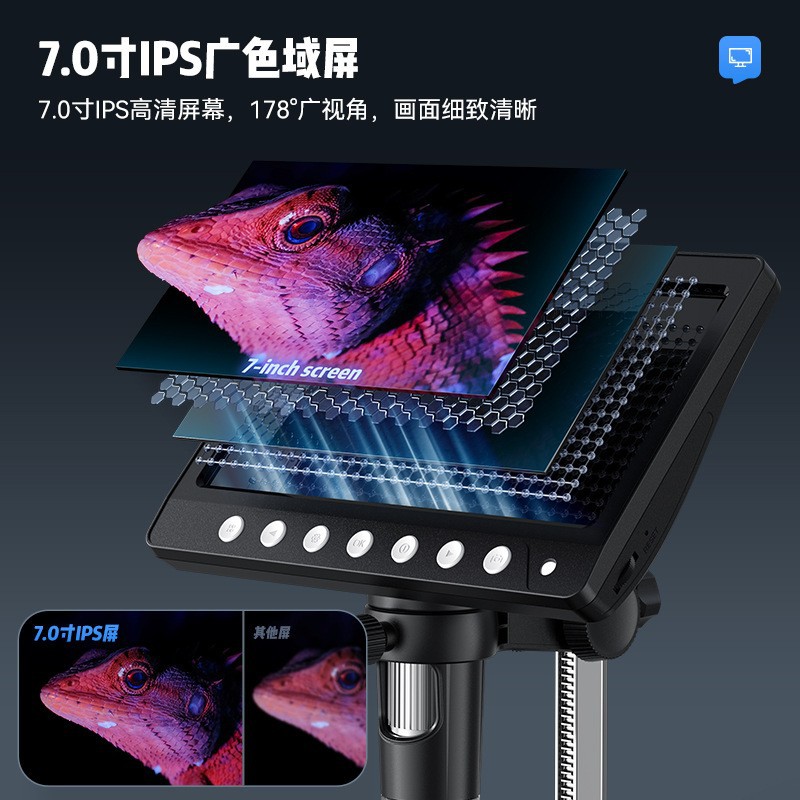 新款330 7寸数码高清显微镜 尺寸:7寸IPS 像素:500万像素 放大倍数:1200x 图片分辨率 (2592*1944)插值 3M(2048*1536)插值、 2M(1920*1080)插值 1M(1280*720)插值、