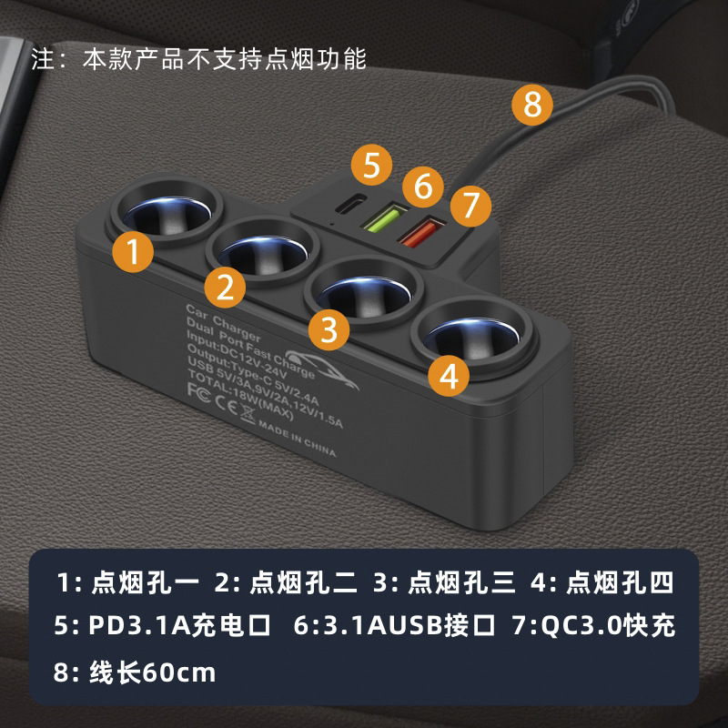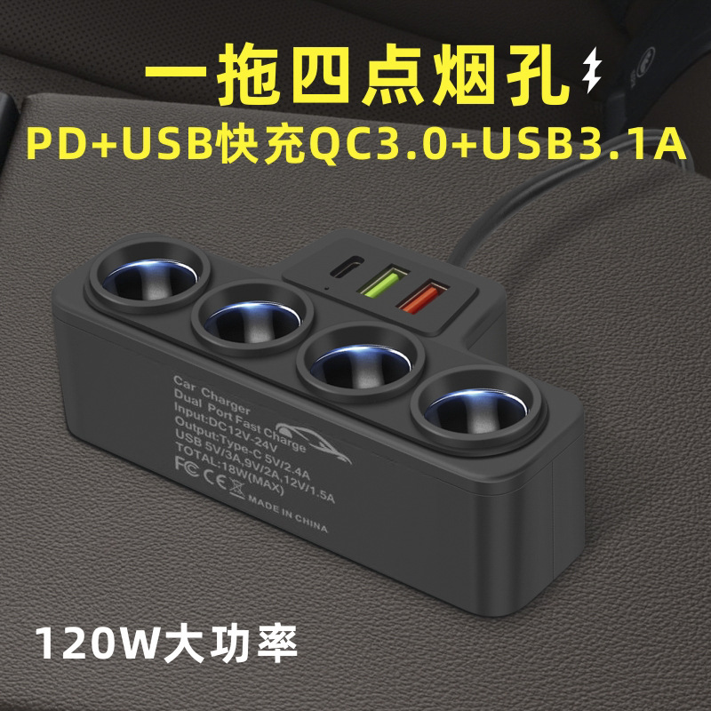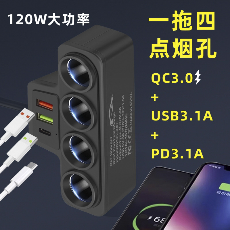 2024 новая автомобильная зарядка автомобиля прикуриватель один на четыре с QC3.0 USB PD интерфейс быстрой зарядки 12V24V универсальный