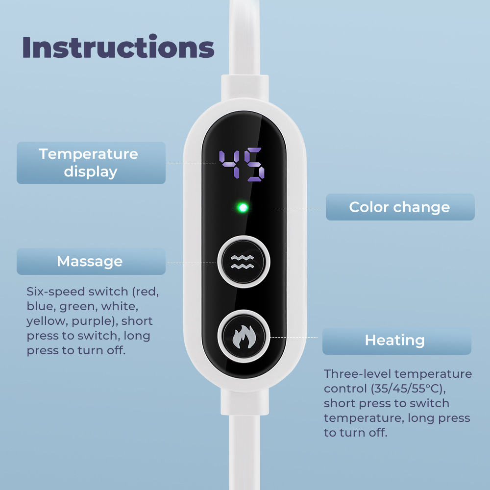 颜色:深蓝色,材质:涤纶+氨纶,三档加热(35°C、45°C、55°C),六档按摩(红、蓝、绿、白、黄、紫切换),长按2秒关机,额定电压:5V2A,震动马达:4颗。