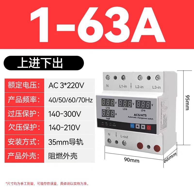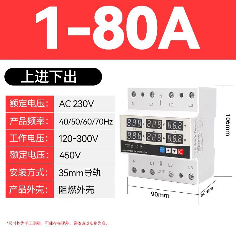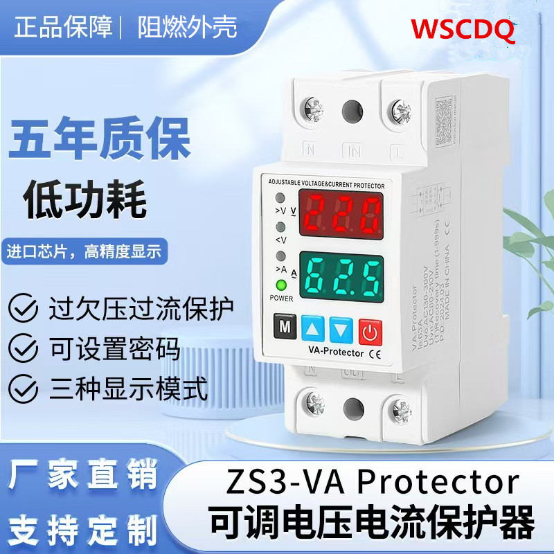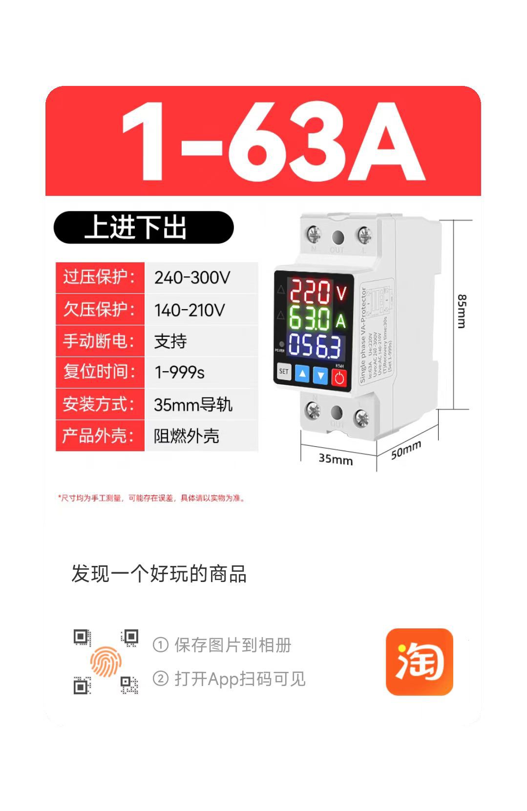 Реле защиты от перенапряжения и пониженного напряжения 40A63A230VDIN с регулируемой настройкой, монтаж на DIN-рейку, с функцией ограничения тока и амперметром.
