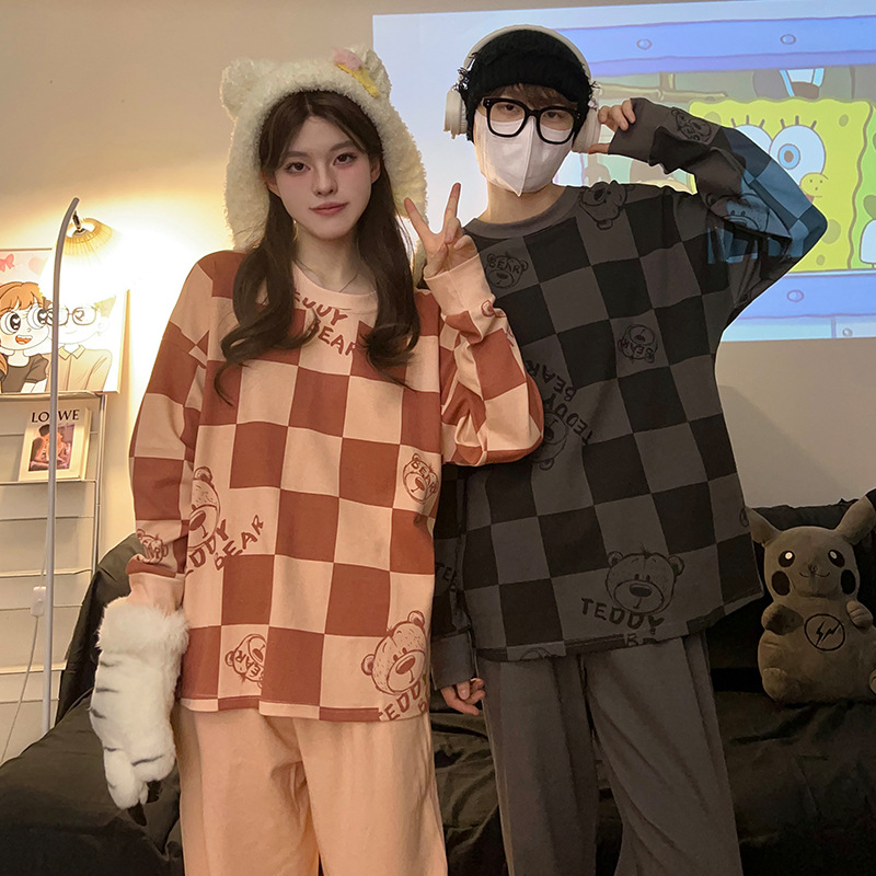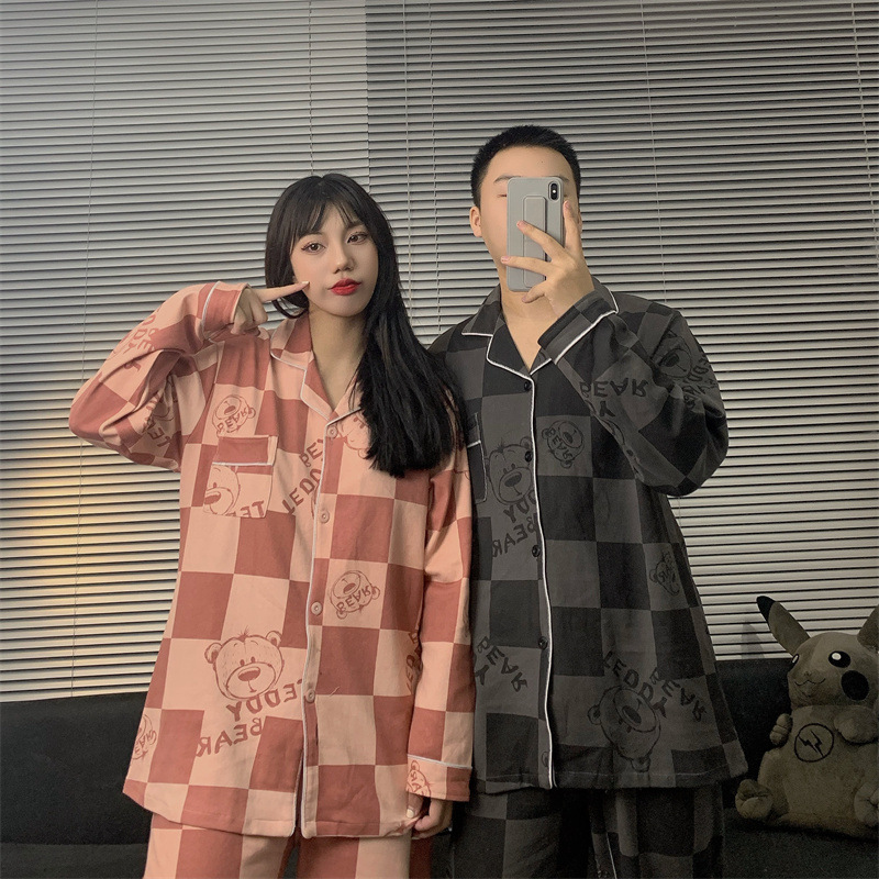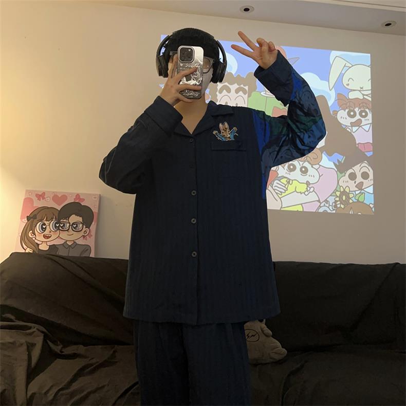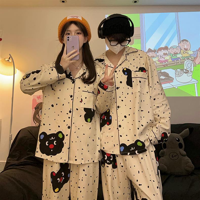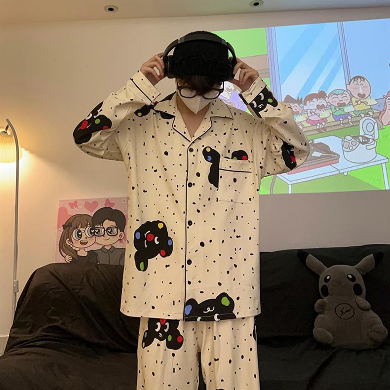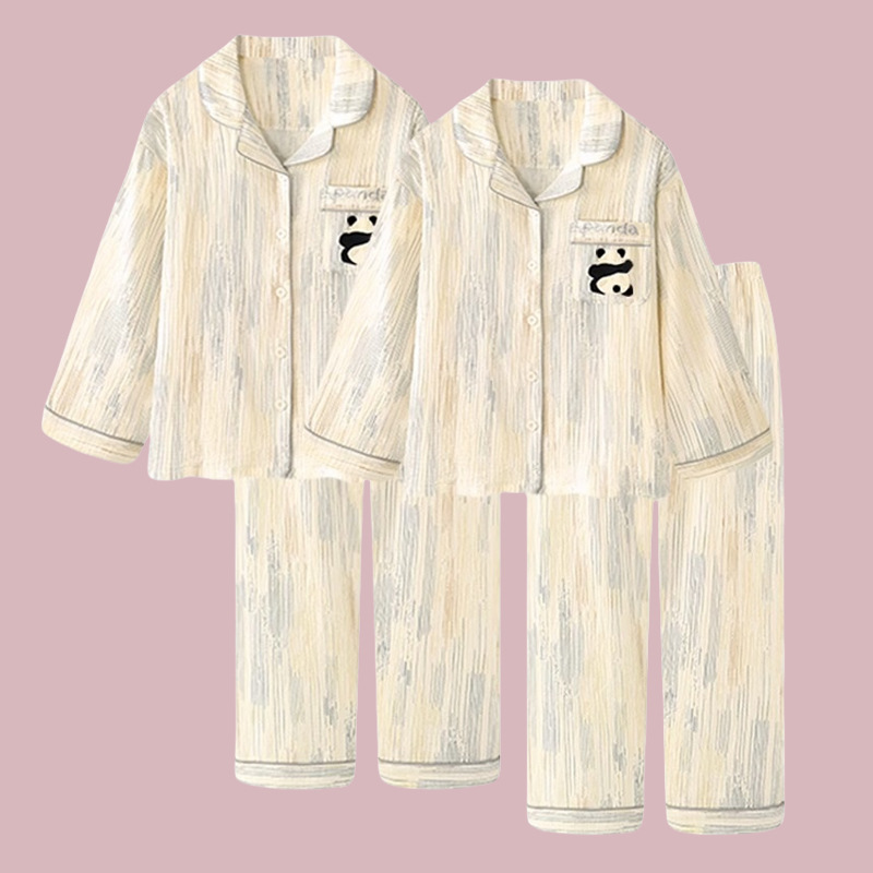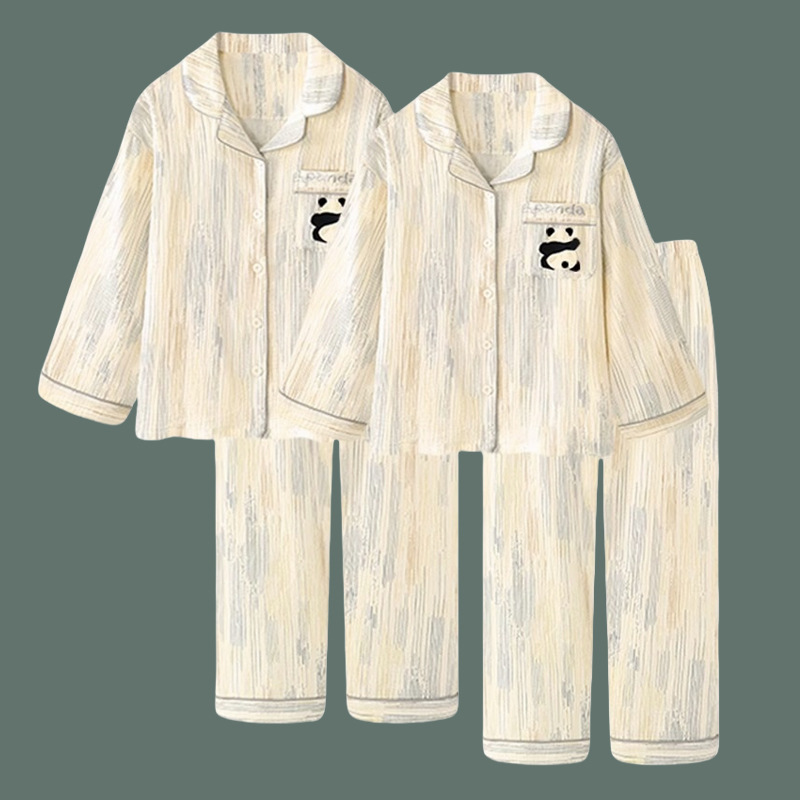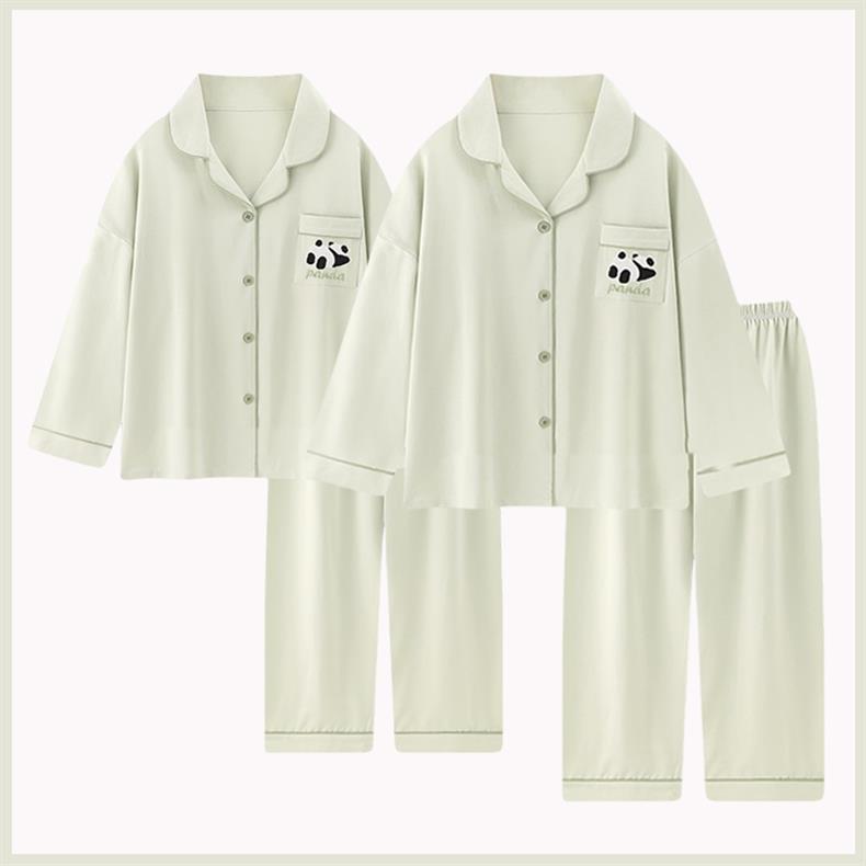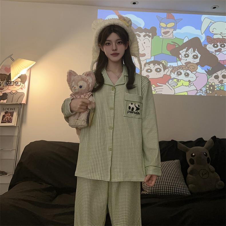 Матча зеленый свежий простой панды хлопчатобумажная пара пижама женская весна и осень длинный рукав костюм мужской большой размер домашней одежды