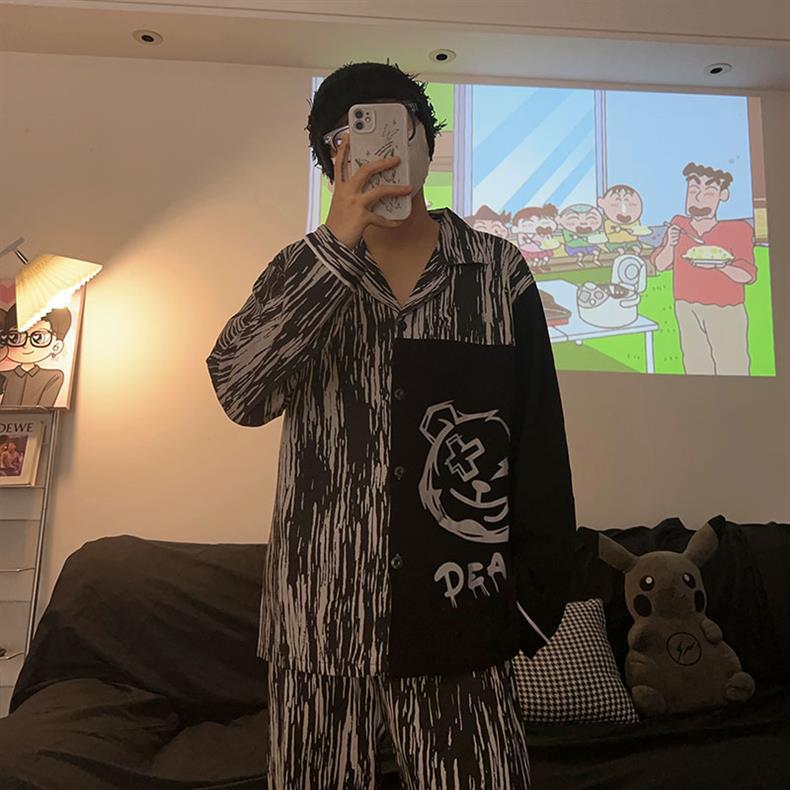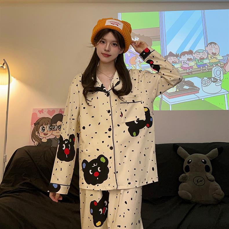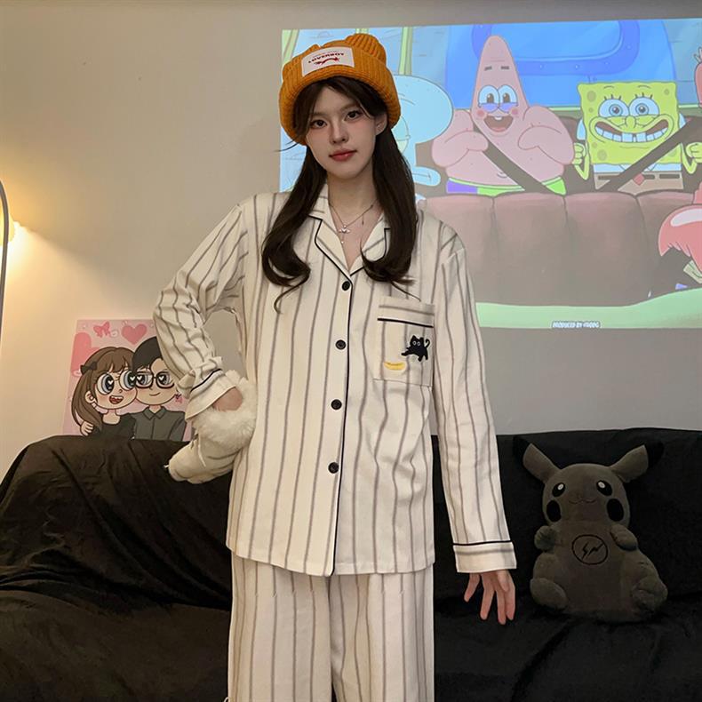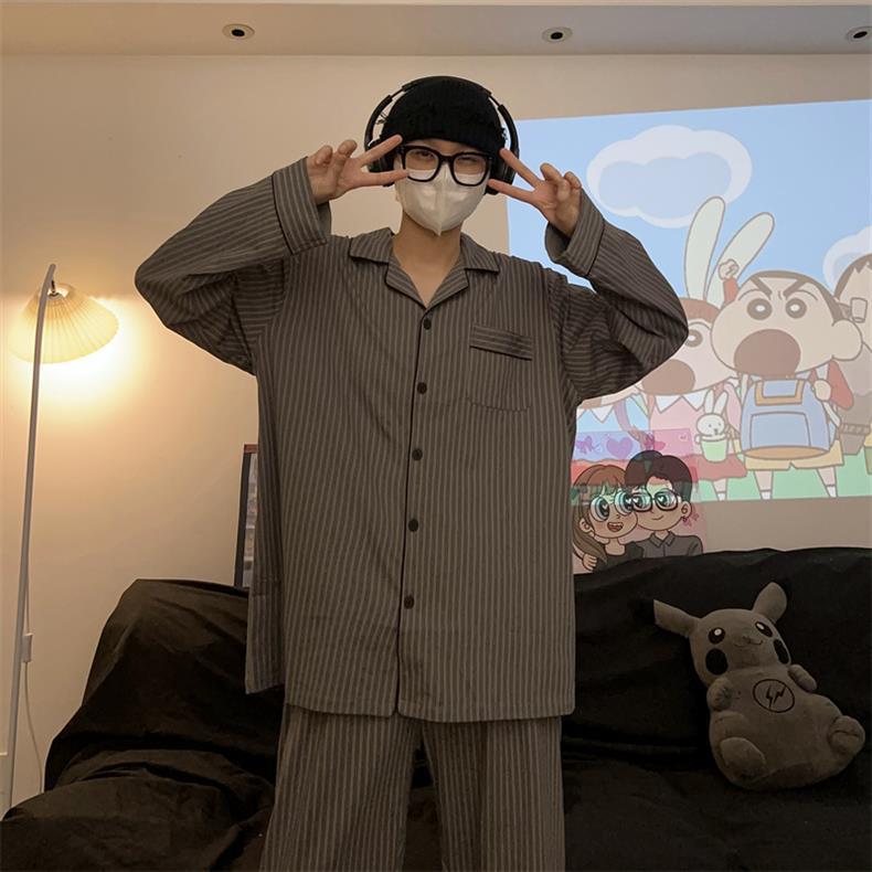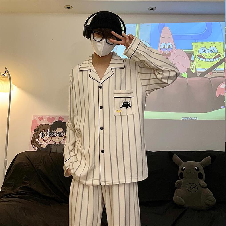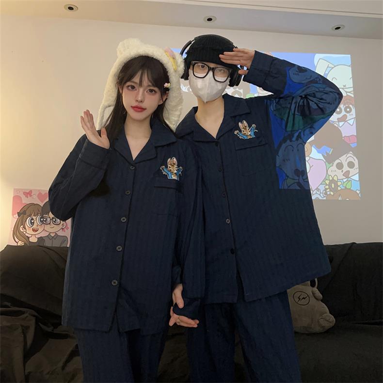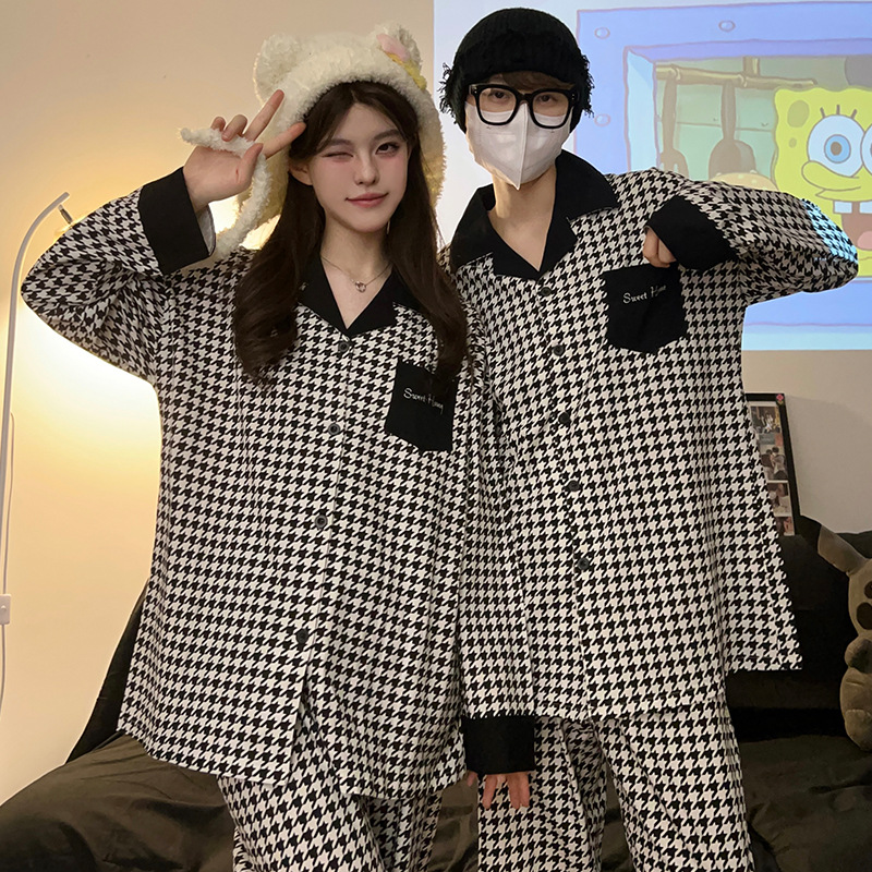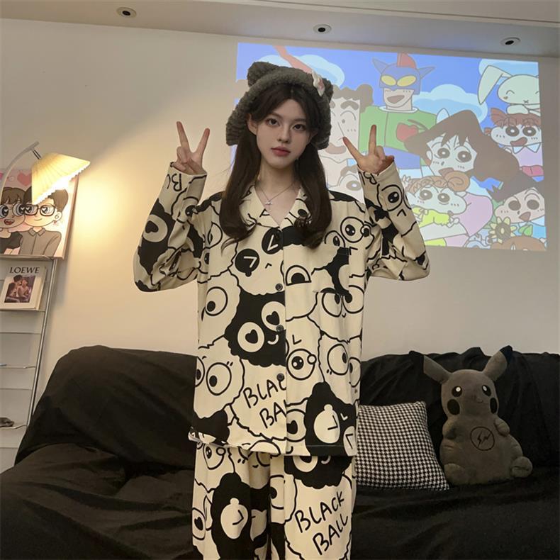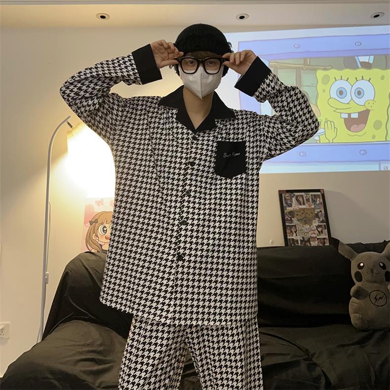 Матча зеленый свежий простой панды хлопчатобумажная пара пижама женская весна и осень длинный рукав костюм мужской большой размер домашней одежды
