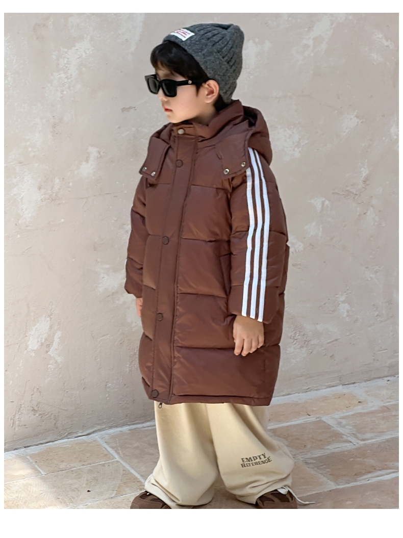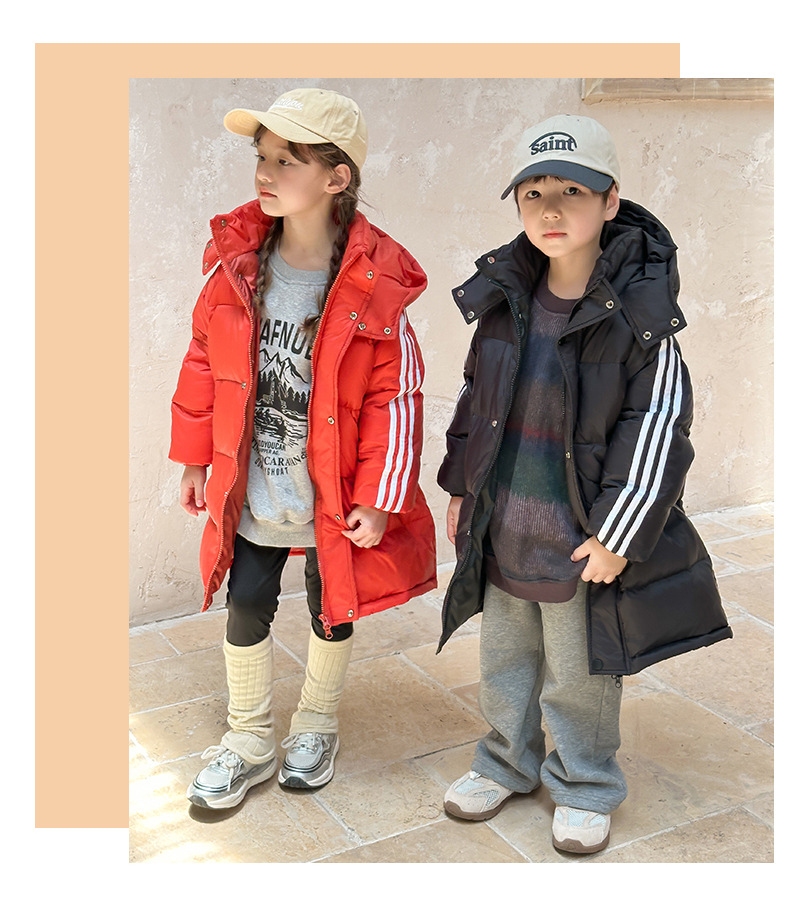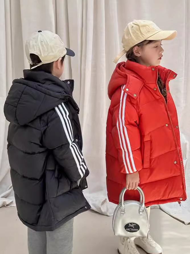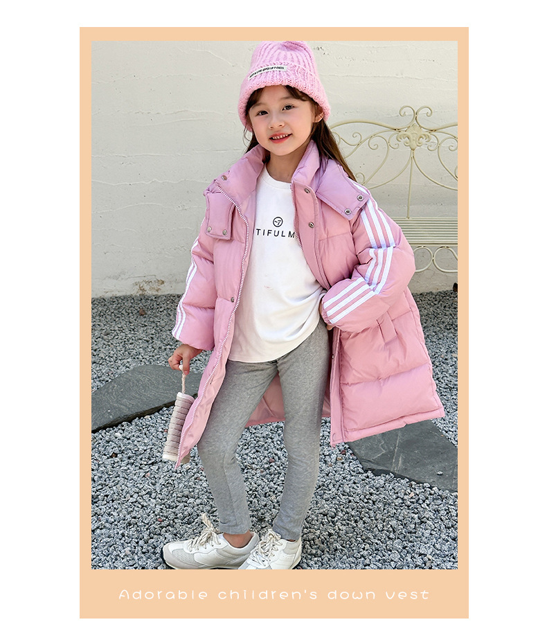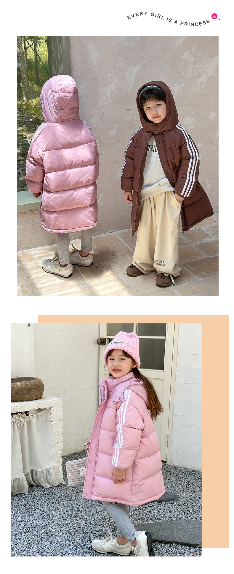 2024 Детский пуховик утолщенные колено средний длинный мальчик для девочек классический зимний пиджак с тремя полосами