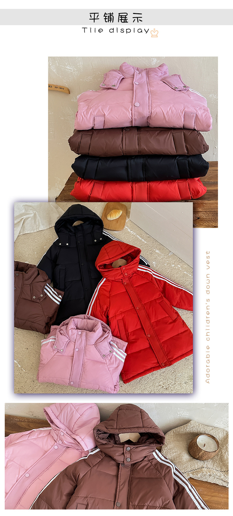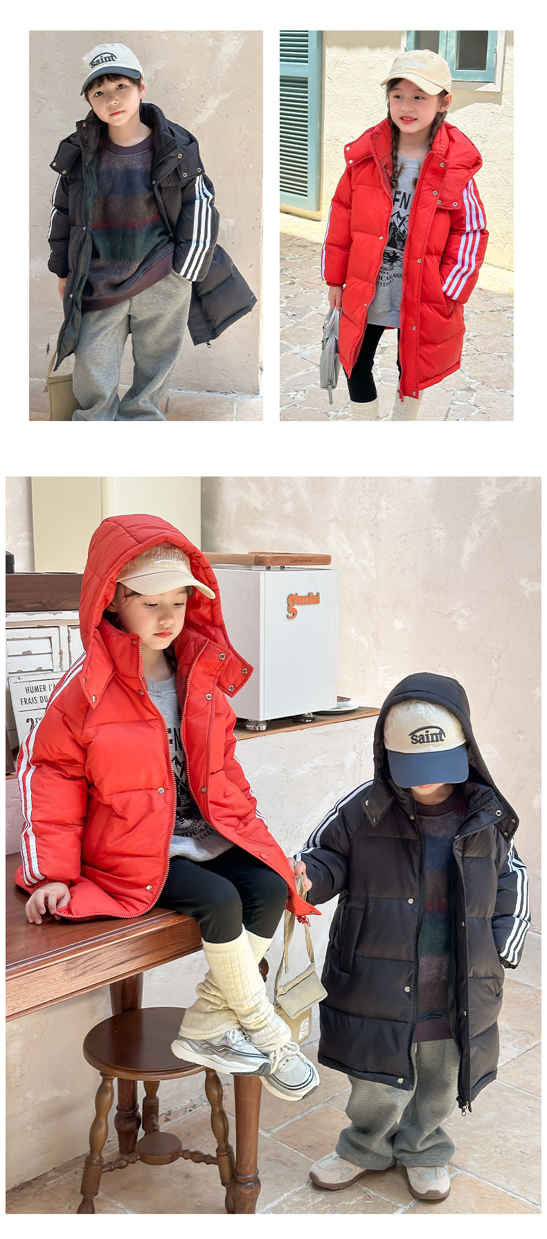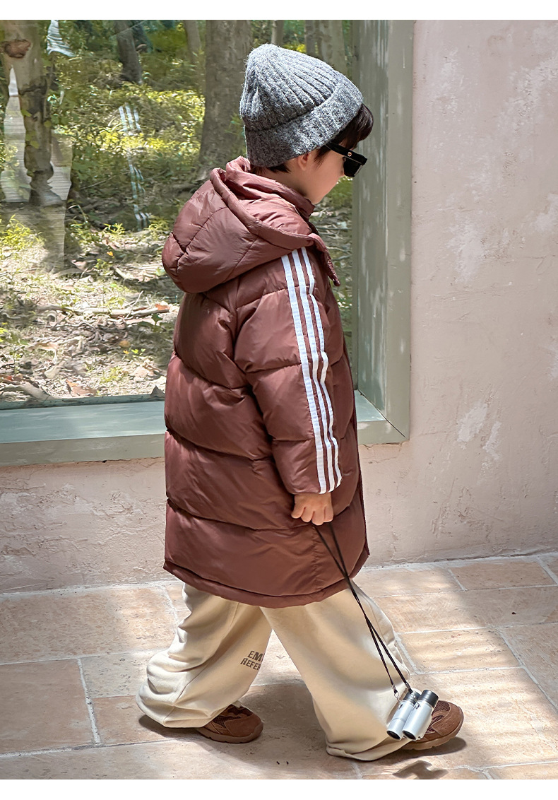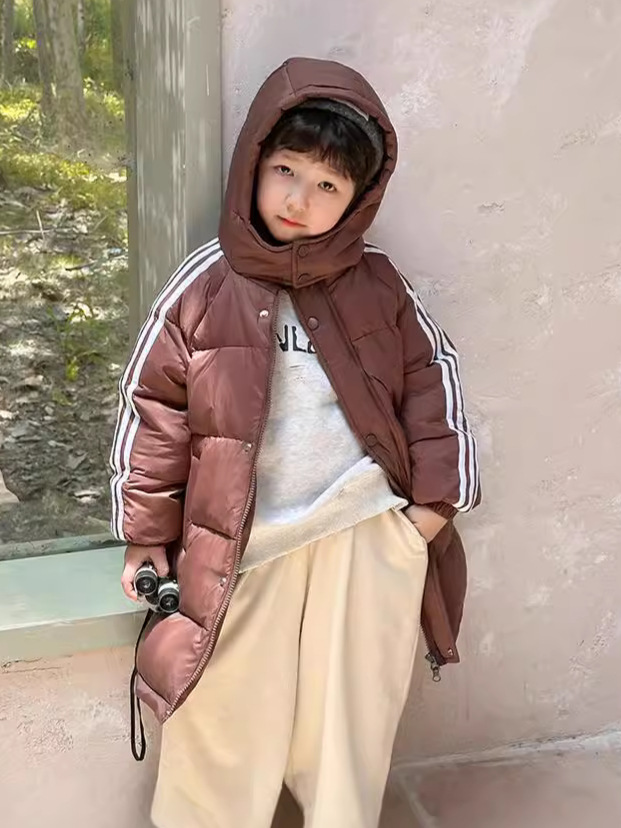 2024 Детский пуховик утолщенные колено средний длинный мальчик для девочек классический зимний пиджак с тремя полосами
