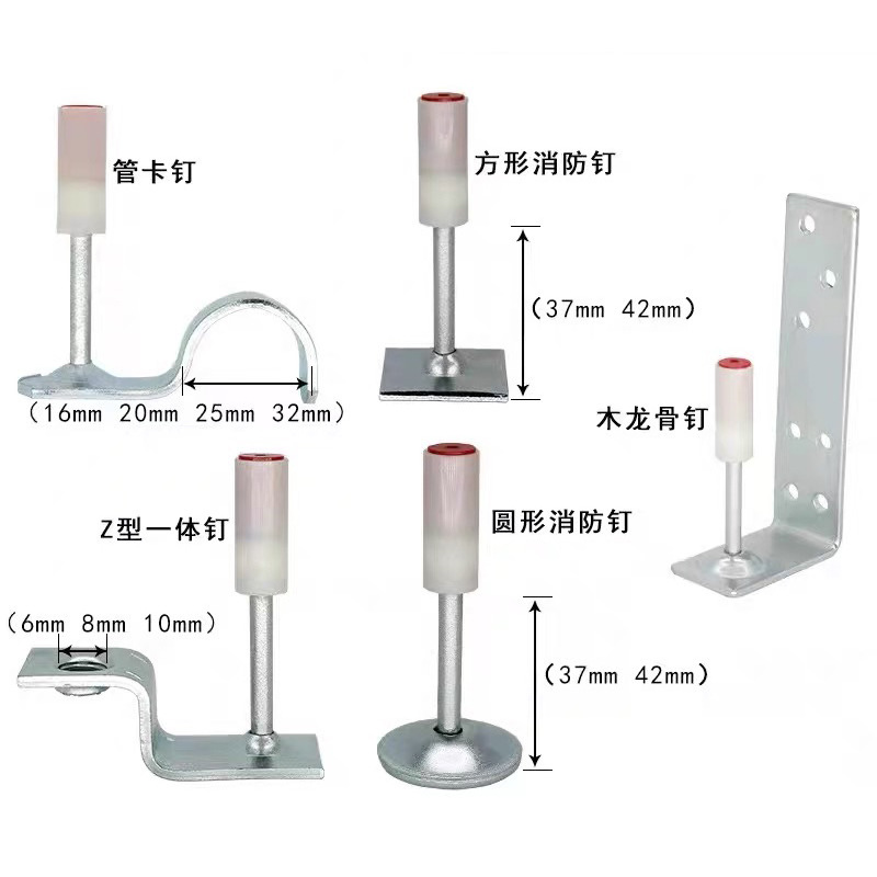 Специальная скоба для потолка М6; Специальные подвесные гвозди М8; Специальный подвесной гвоздь М10.; 32 огнестойкие круглые гвозди; 42 огненные круглые гвозди; 16 тюбиков скоб; 20 трубок скоб; 25 трубчатых скоб; 32 пробирки скоб; Мини-пожарные гвозди; Мини-стебы для труб 16; Мини-трубки скобы 20; Мини-хомут для труб 25
