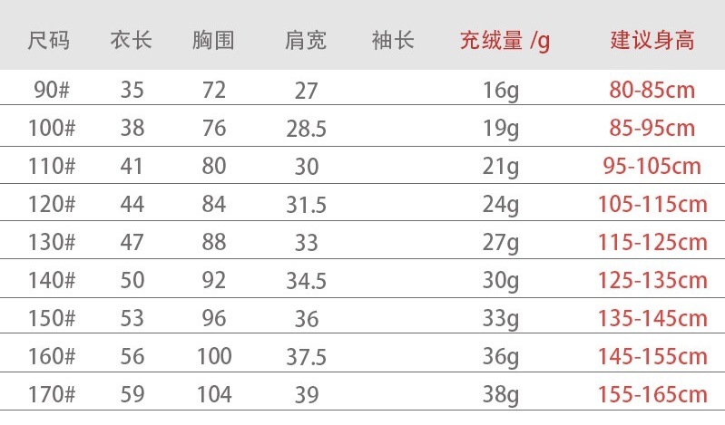 90cm; 100cm; 110cm; 120cm; 130cm; 140cm; 150cm; 160cm; 170cm