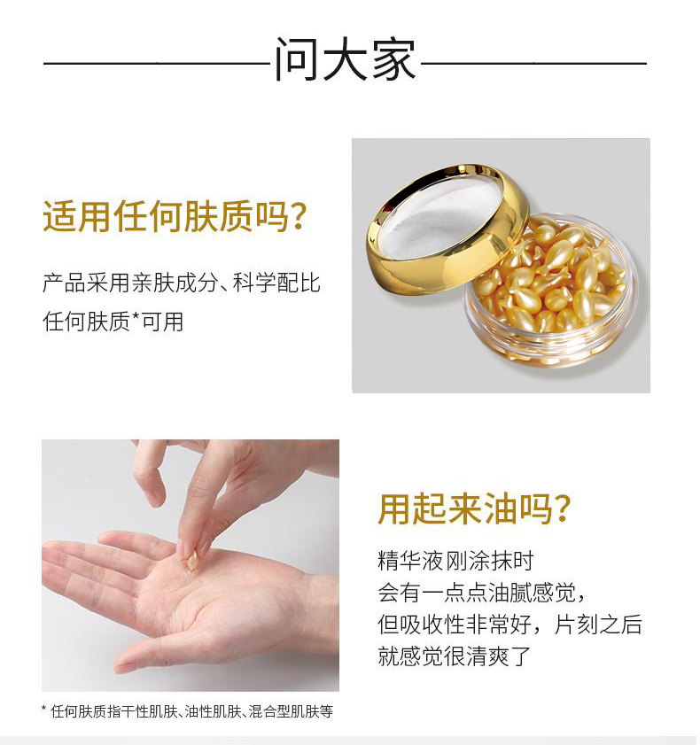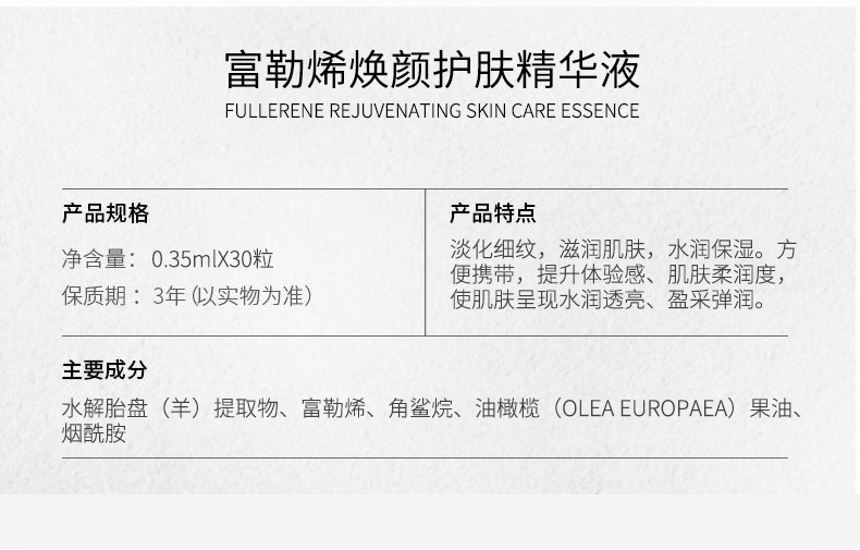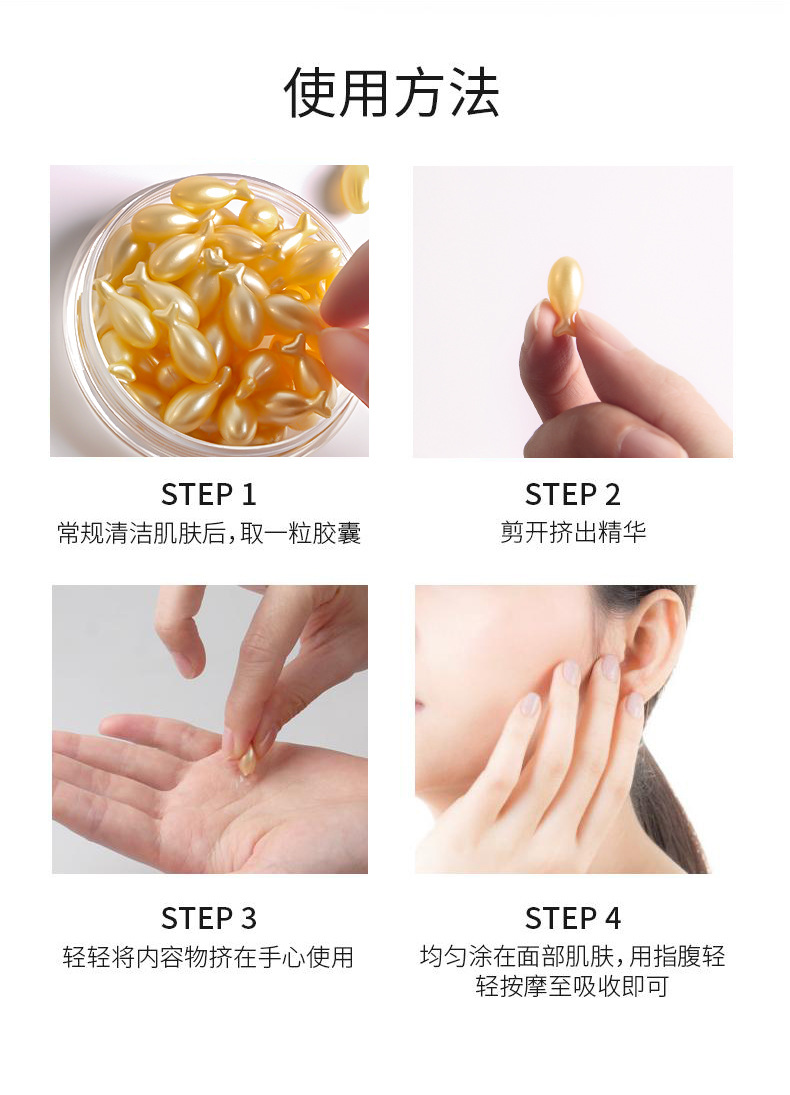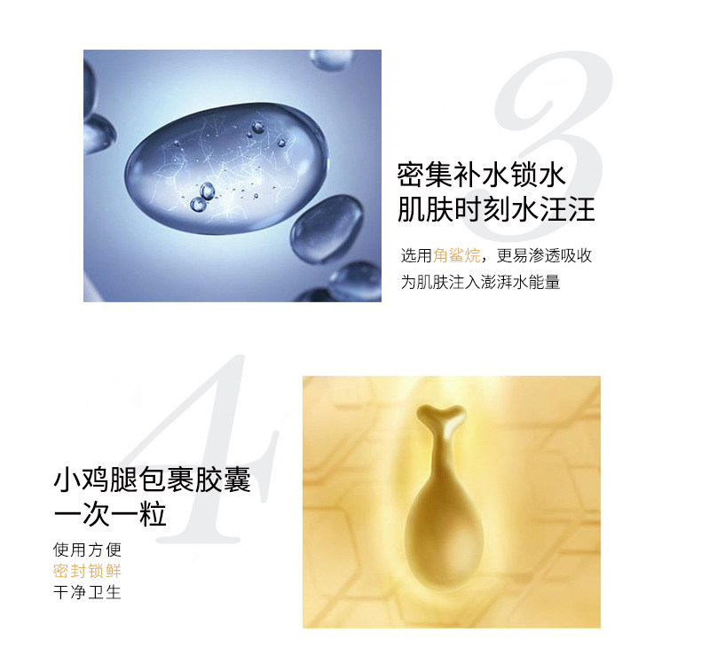 30 капсул омолаживающей сыворотки (позолоченная крышка); 30 капсул антивозрастной эссенции (белая крышка); Фуллерен Водянистый Увлажняющий Крем-Эссенция 30 капсул; Флакон с 60 капсулами эссенции витамина Е (английская версия только для трансграничных продаж); Эфирное масло розы, бутылка 60 капсул (английская версия предназначена только для трансграничных продаж); 30 капсул омолаживающей эссенции (с золотым гальваническим покрытием) (английская версия предназначена только для трансграничных продаж); L-VC Essence 40 капсул, круглая бутылка; L-VC Essence 50 капсул, круглая бутылка; L-VC Essence 50 капсул, круглая бутылка, английская версия (только для продаж за границу); Овечья плацента, пакетик 20 капсул; Baichi Flower Squalane Double Anti-Wrinkle Firming Essence Oil, коробка из 36 капсул; Крем-эссенция Gold Cap, 30 капсул; Крем-эссенция White Cap, 30 капсул; Белый пруд цветка сквалан маленький счастливый мешочек эссенция масло 36 капсул; Маленький мешочек с эфирными маслами, 30 капсул