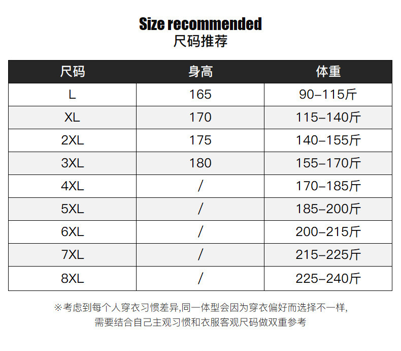 L; XL; 2XL; 3XL; 4XL; 5XL; 6XL; 7XL; 8XL