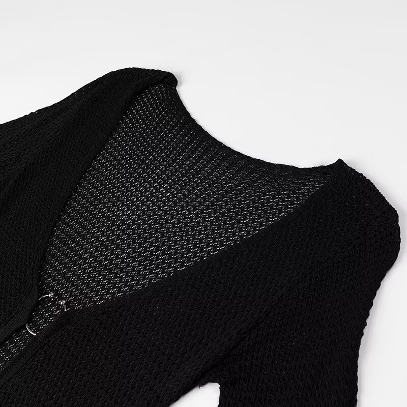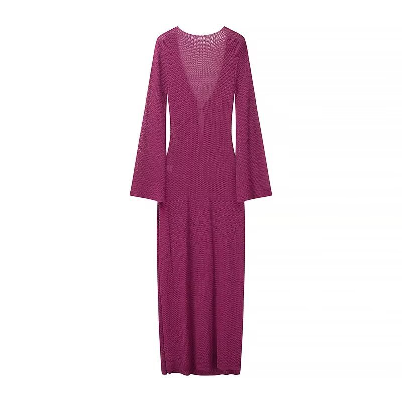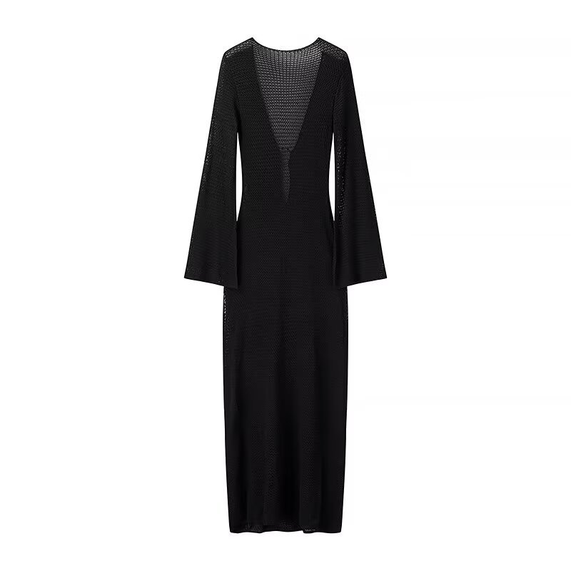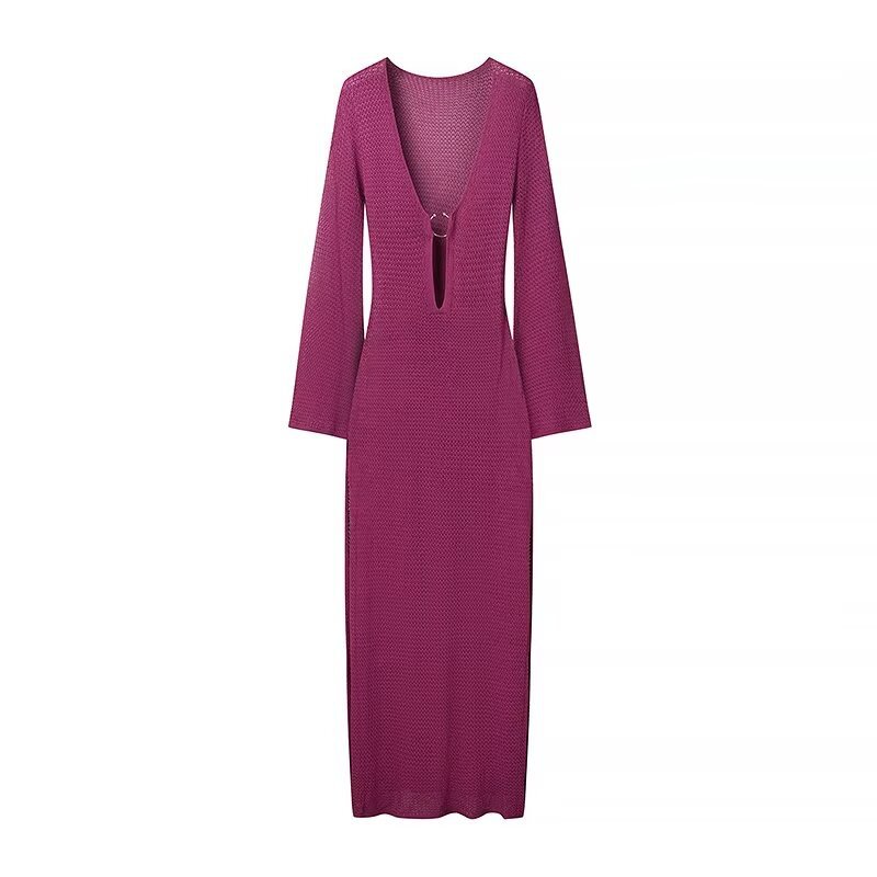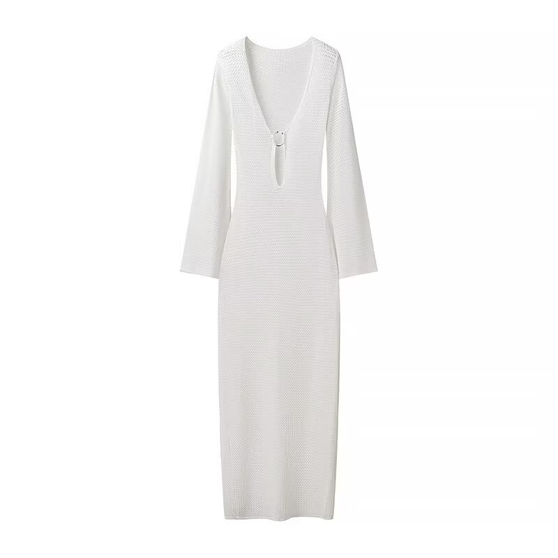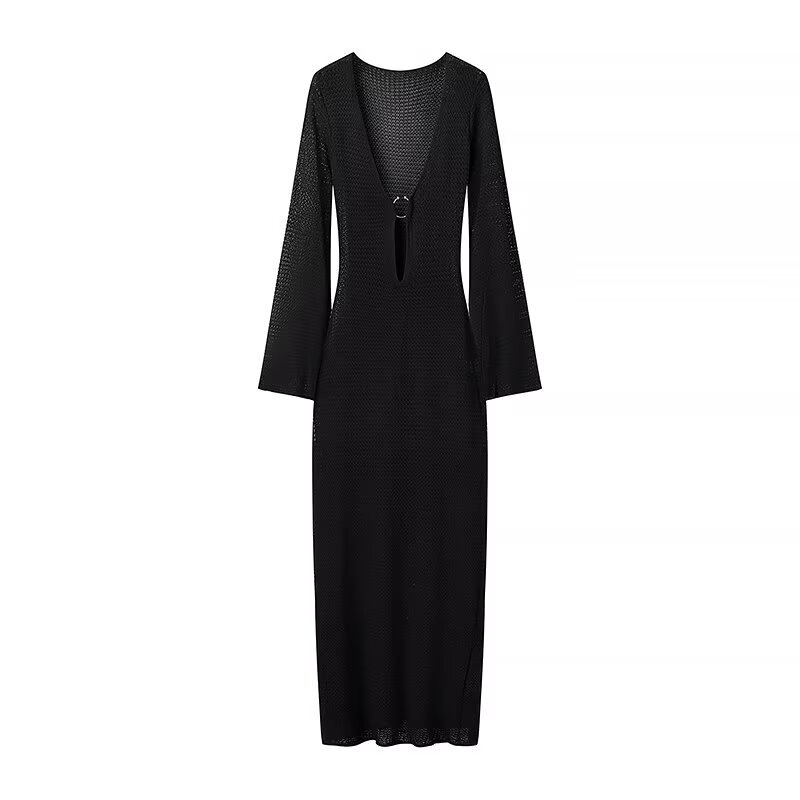 2024 осень новая женская мода в европейском и американском стиле тонкое V-образное расклешенное рукава длинное пляжное платье с пряжкой
