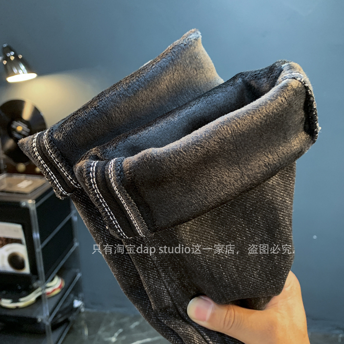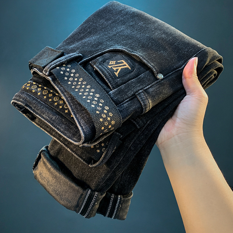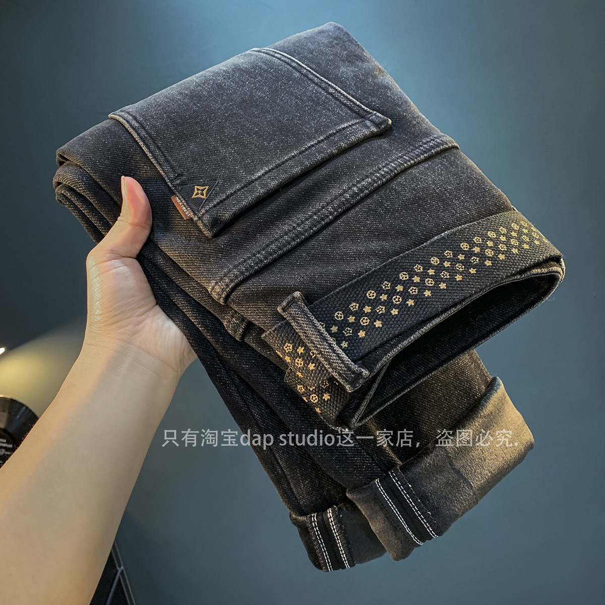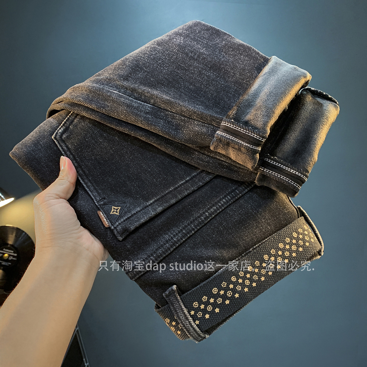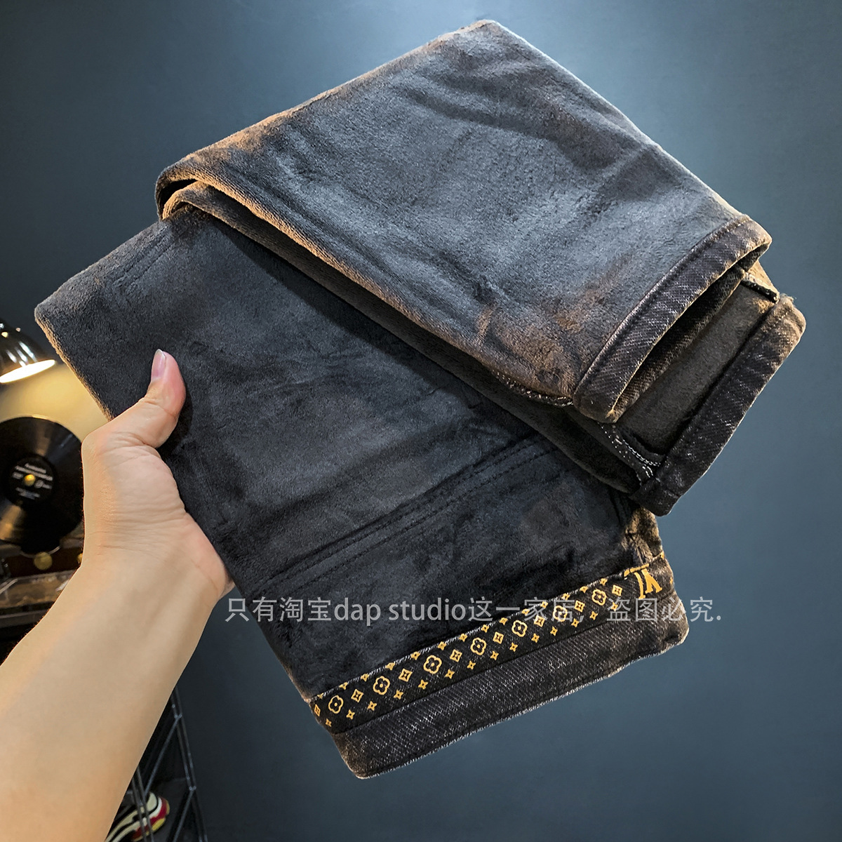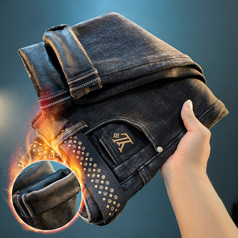 Высокие роскошные джинсы мужские зимние 2024 года плюшевые толстые повседневные вышитые теплые брюки стройные мужские брюки