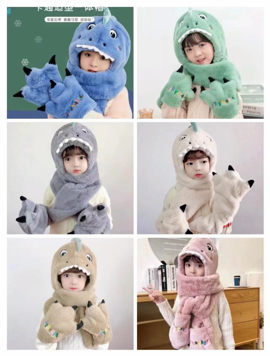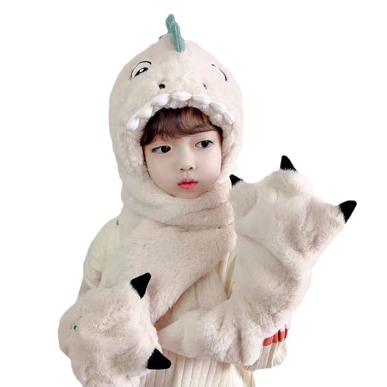 Зимний комплект из шапки, шарфа и перчаток для мальчиков и девочек, плюшевый комплект из трех предметов с изображением динозавра
