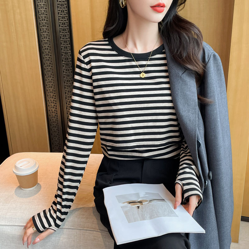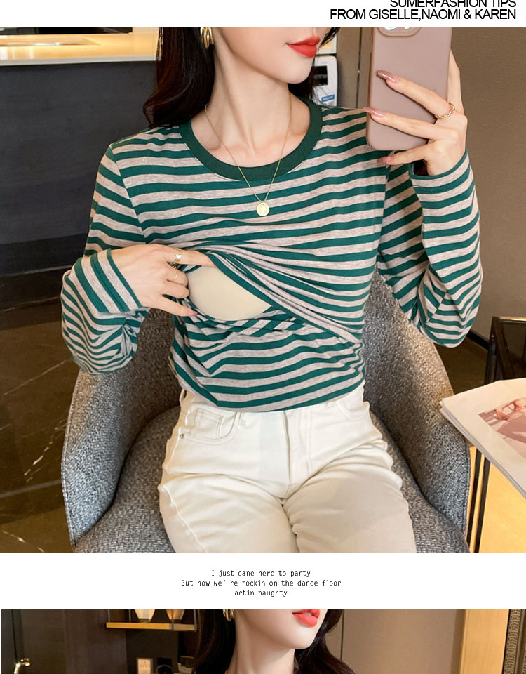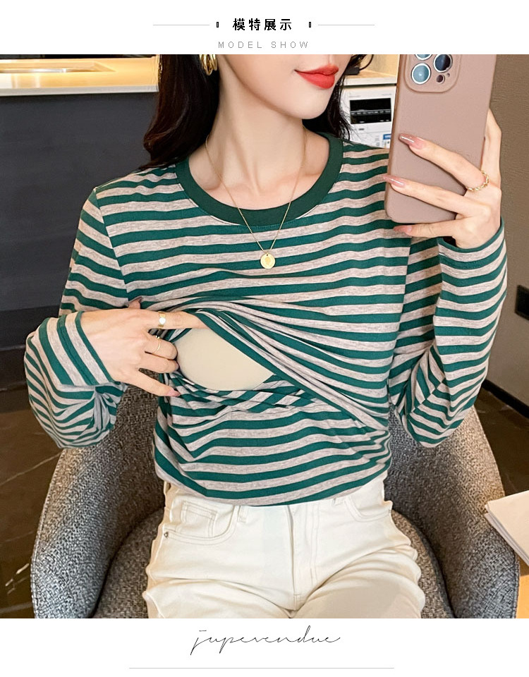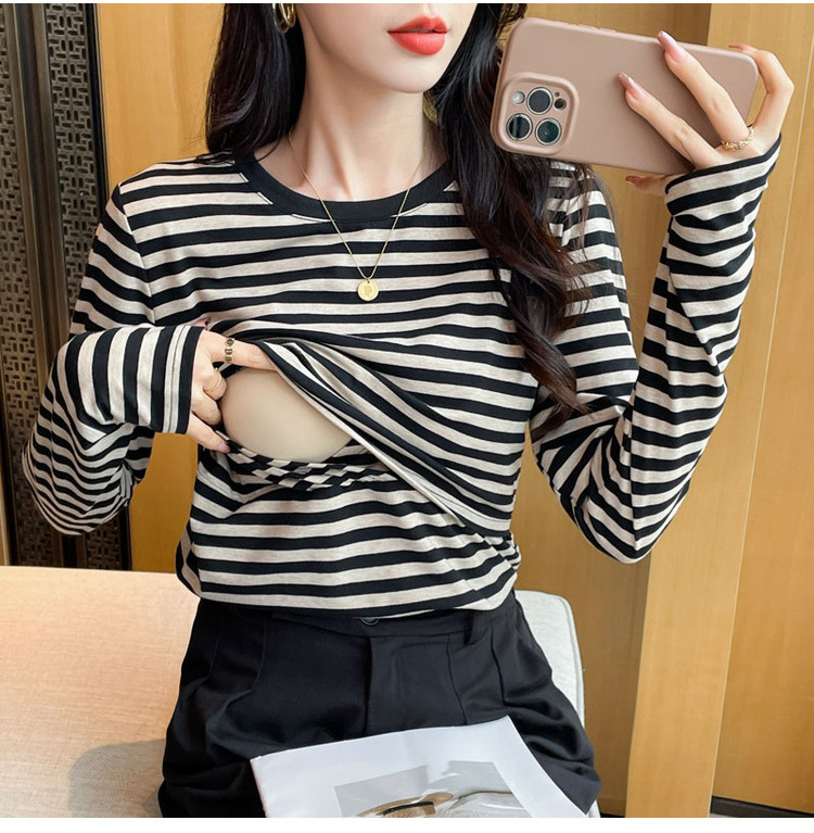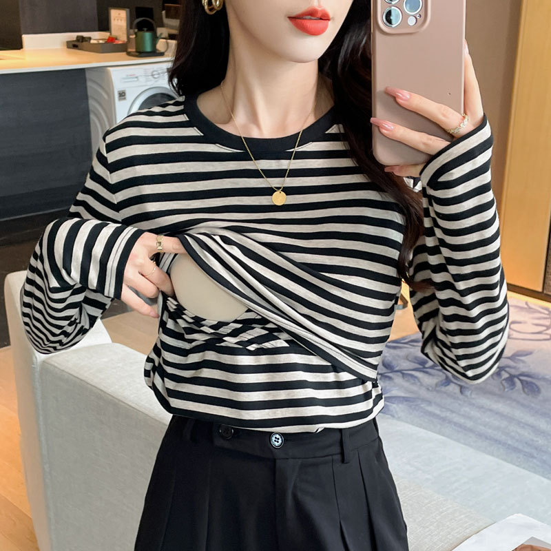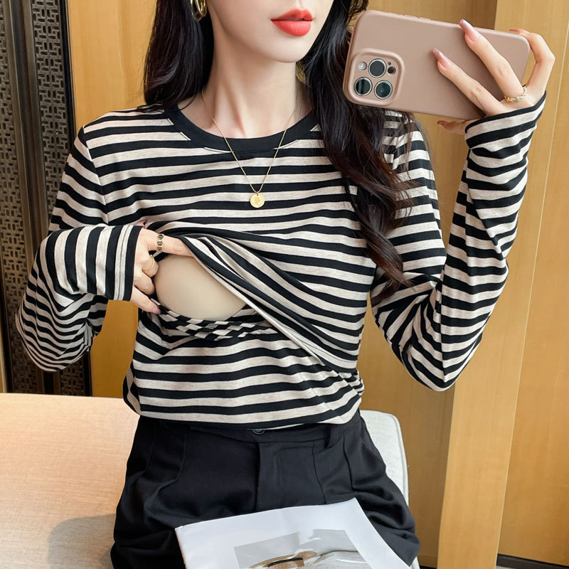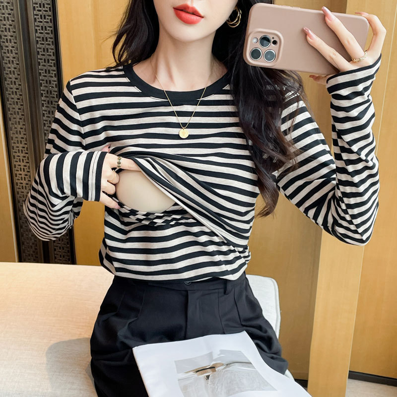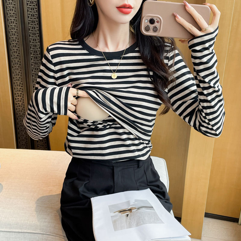 Новый продукт 2024 осень и зима теплая футболка для кормления после родов в полоску