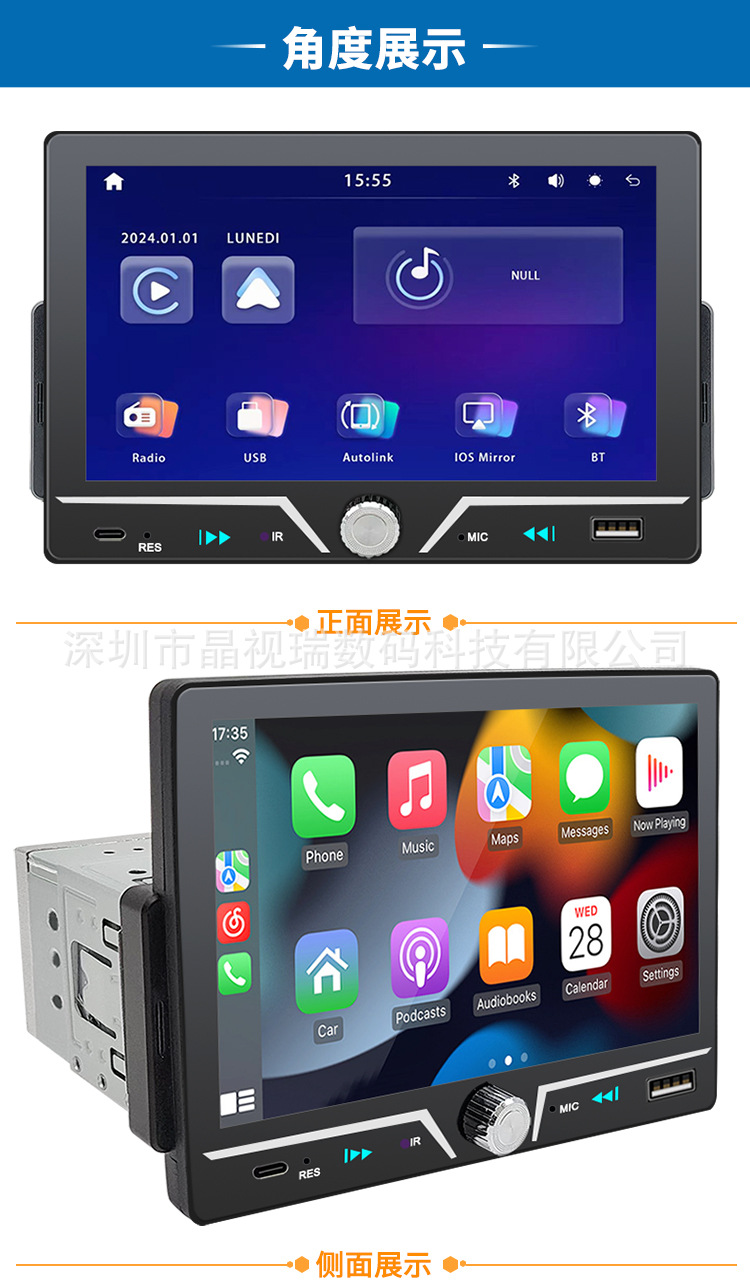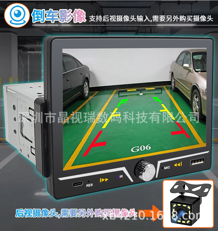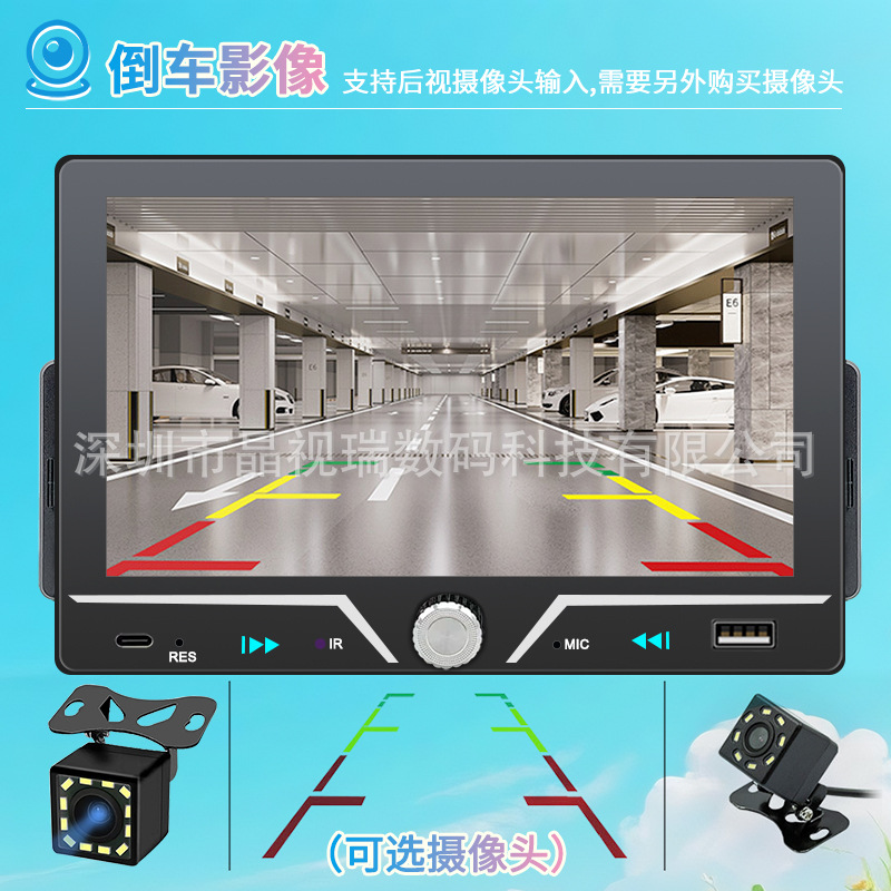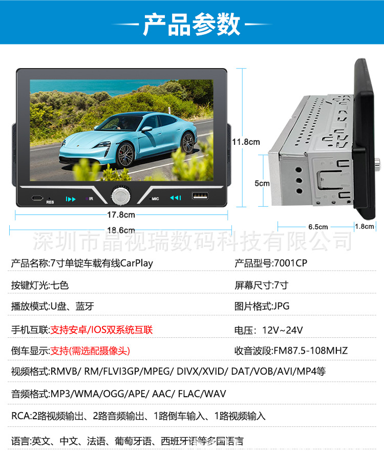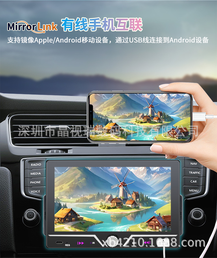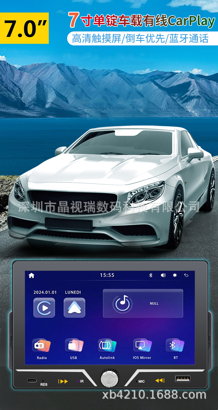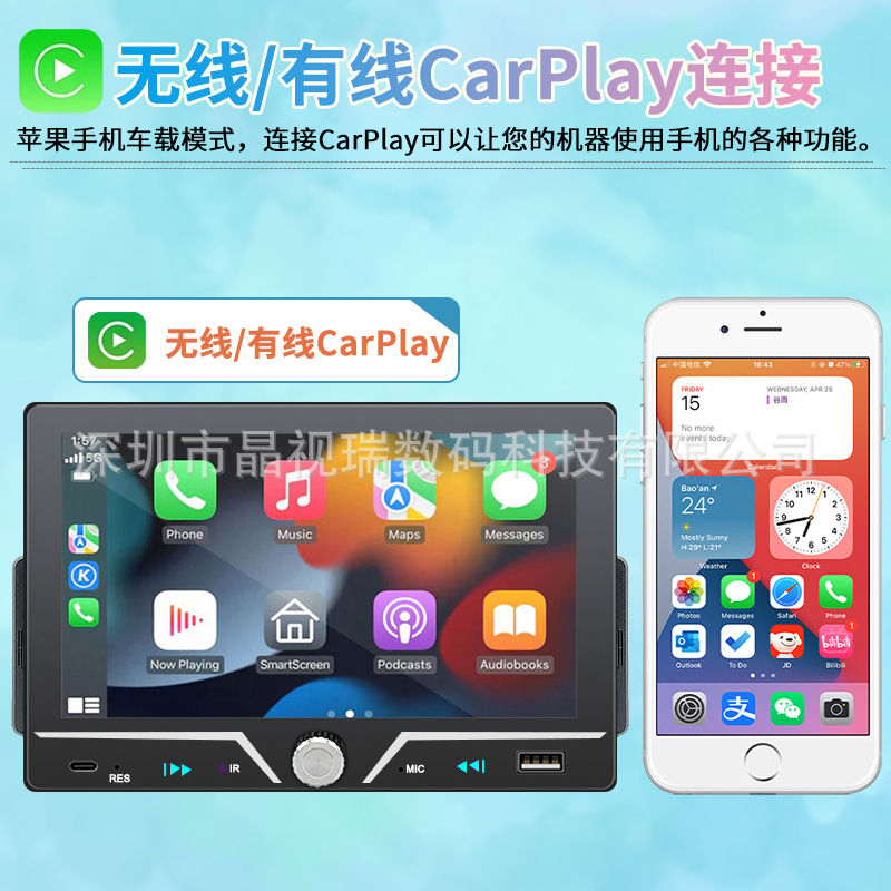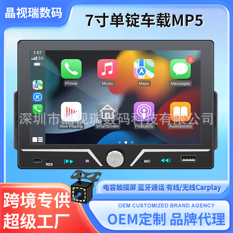 Автомобильный MP5-плеер высокой четкости 7inch года выпуска со слотом для карт, поддержкой CarPlay, подключением к устройствам, функцией Bluetooth-звонков, камерой заднего вида, пультом дистанционного управления и автомагнитолой.