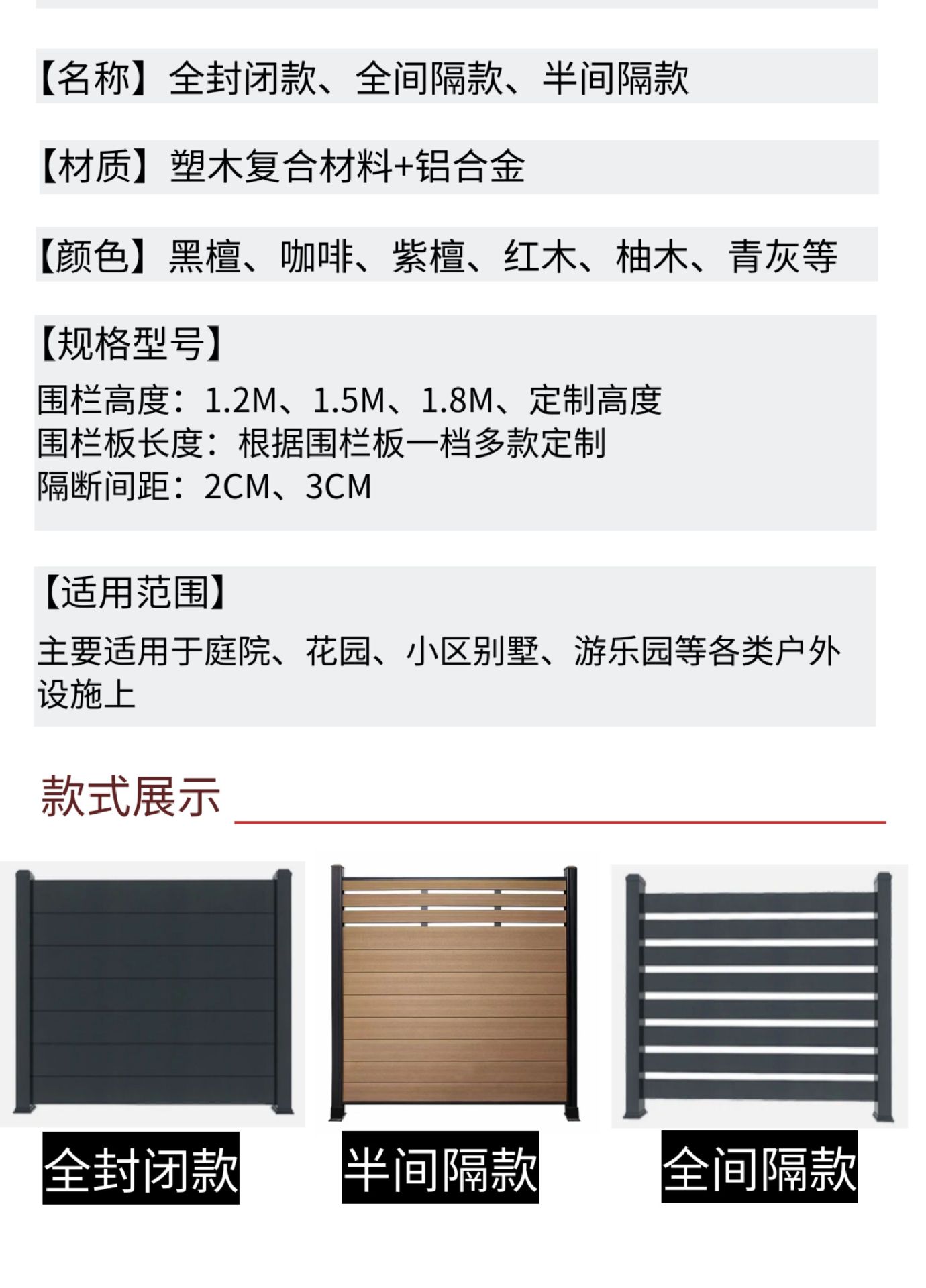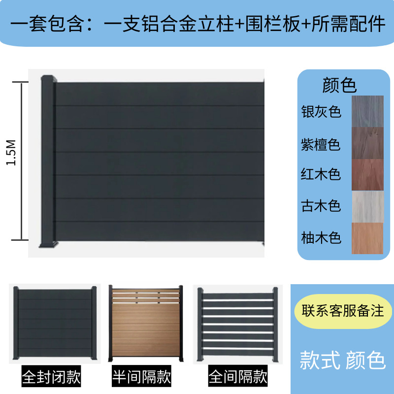 Соэкструдированный пластиковый деревянный забор второго поколения/м2 (включая колонку из алюминиевого сплава длиной 1,2 м); Соэкструдированный пластиковый деревянный забор второго поколения/м2 (включая колонку из алюминиевого сплава длиной 1,5 м); Соэкструдированный пластиковый деревянный забор второго поколения/м2 (включая колонку из алюминиевого сплава длиной 1,8 м); Забор из алюминиевой резной пластины (можно настроить); Черная колонна из алюминиевого сплава/м