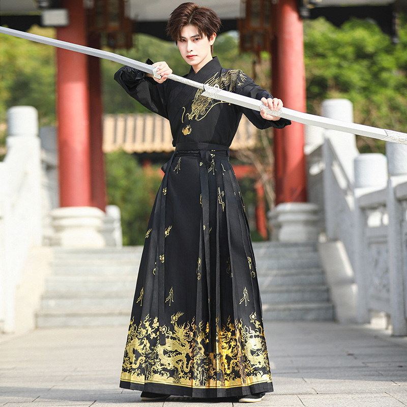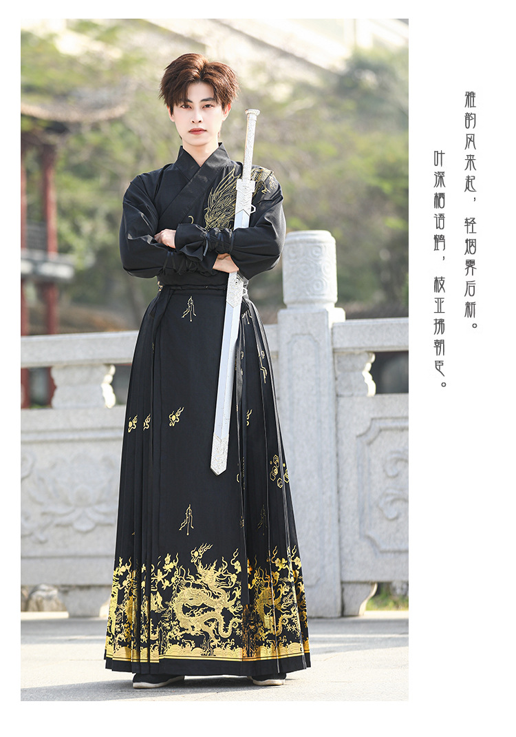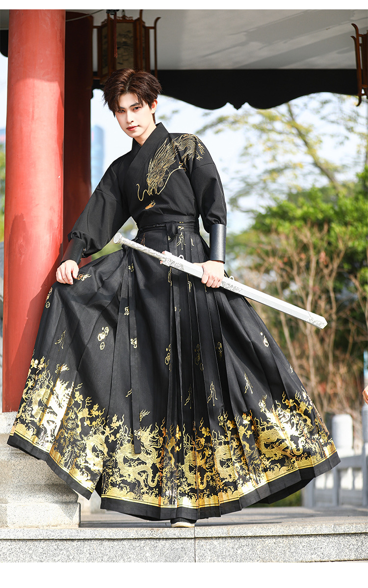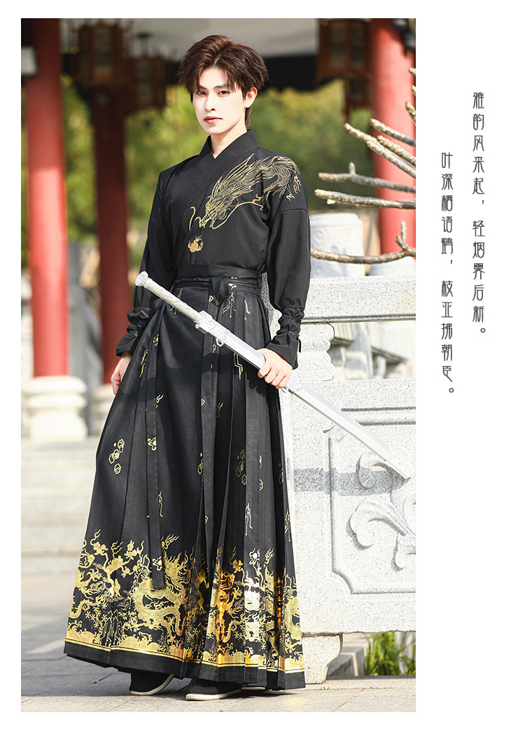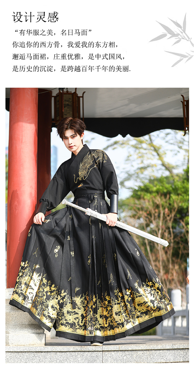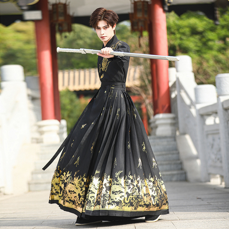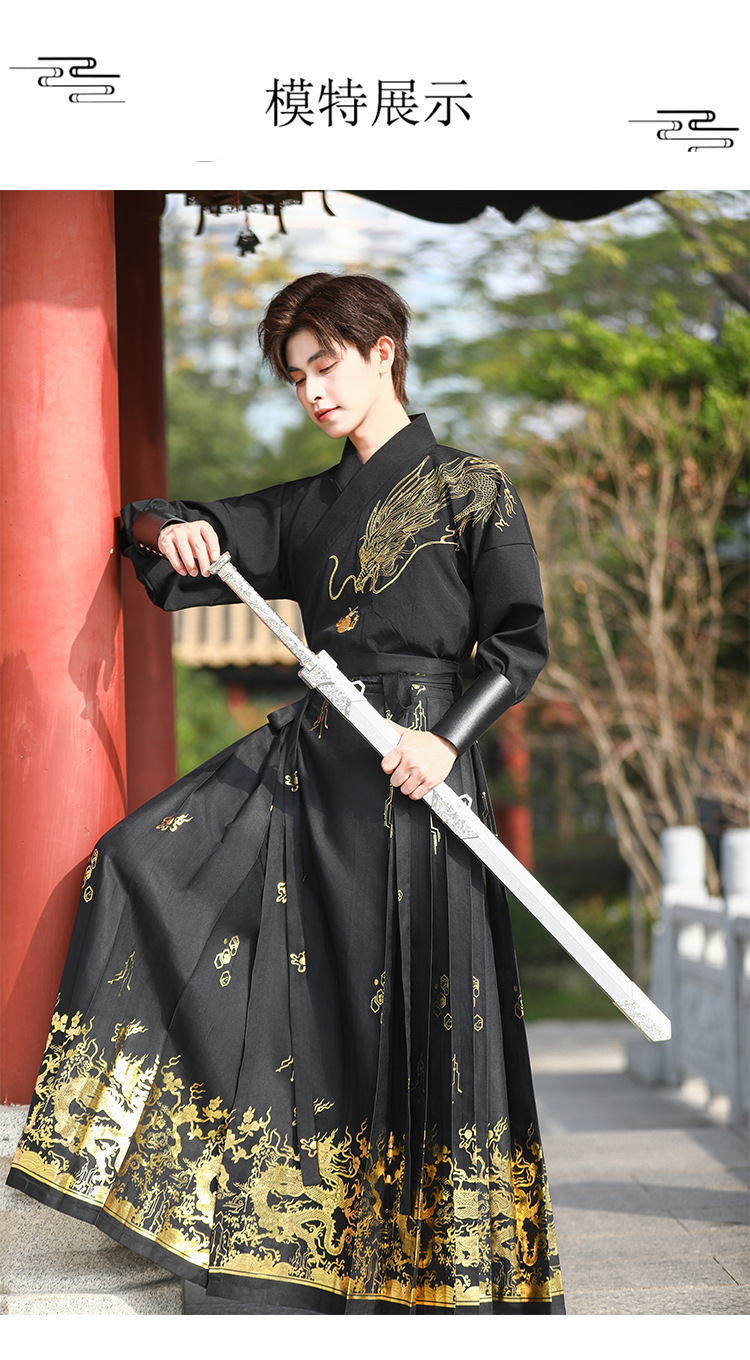 2024 Новый реальный снимок мужской китайский стиль вышитый воротник с длинными рукавами топ с позолотой юбка с конским лицом