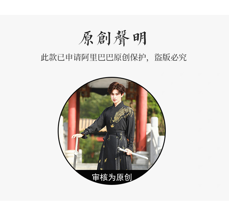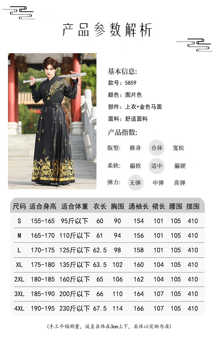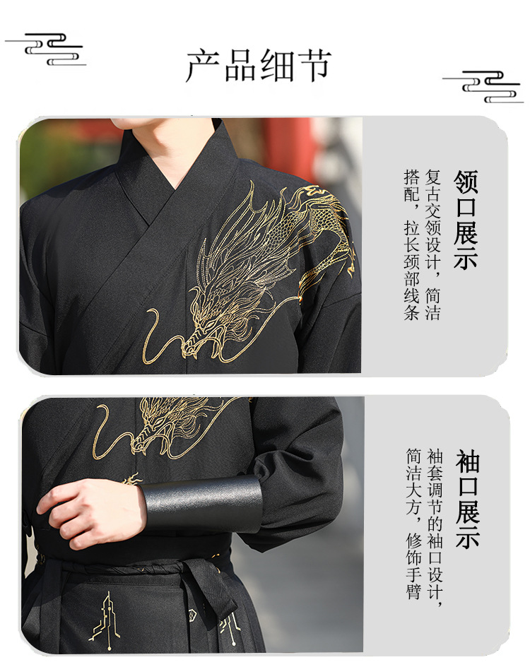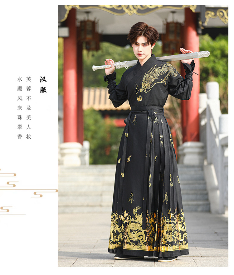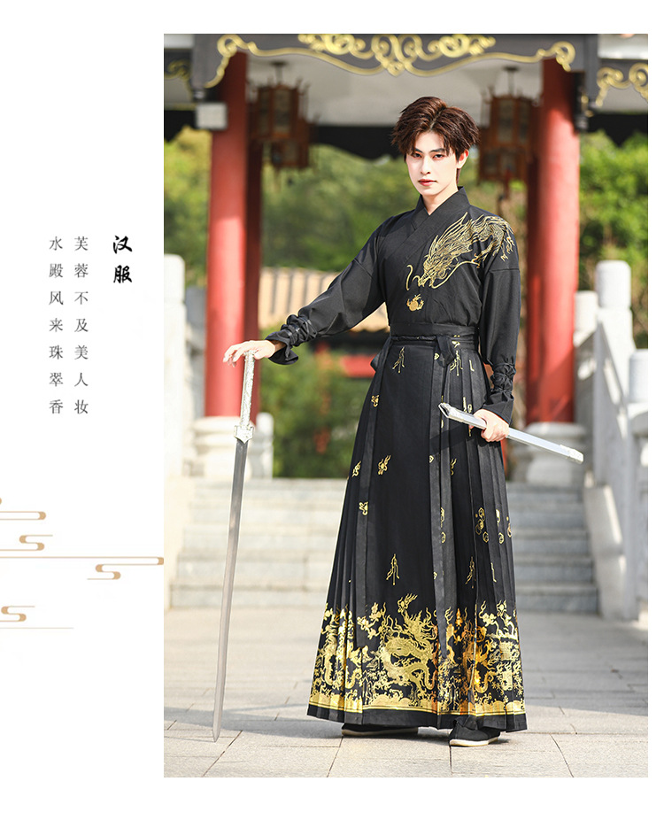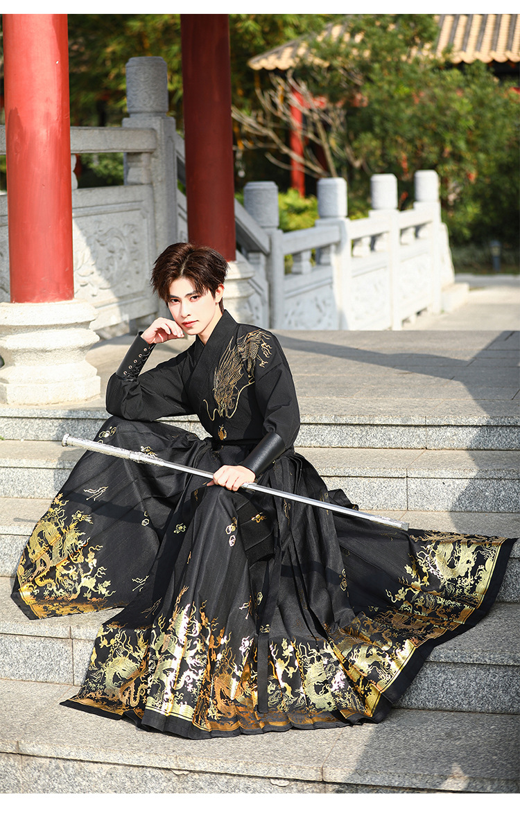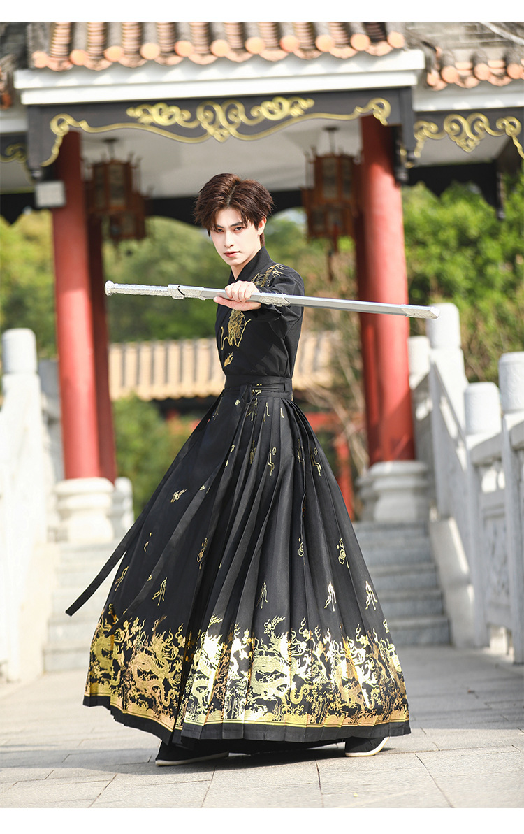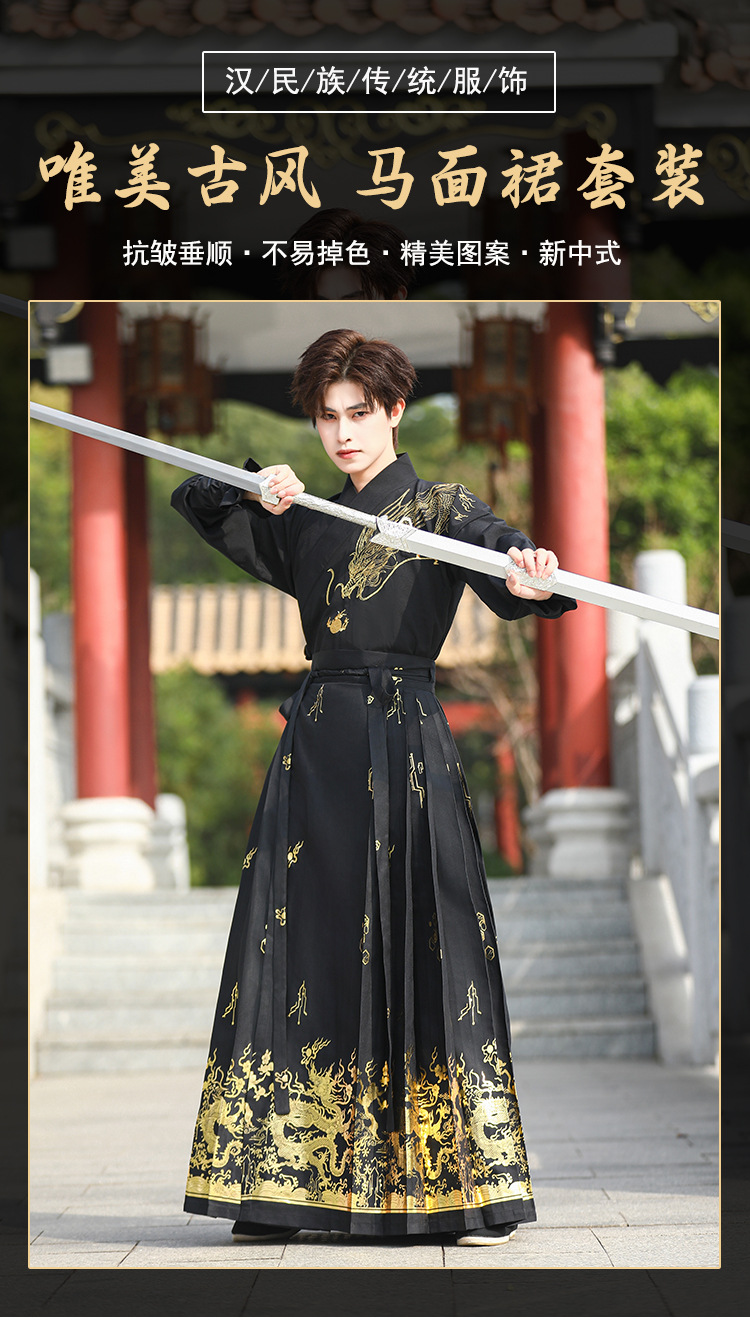 2024 Новый реальный снимок мужской китайский стиль вышитый воротник с длинными рукавами топ с позолотой юбка с конским лицом