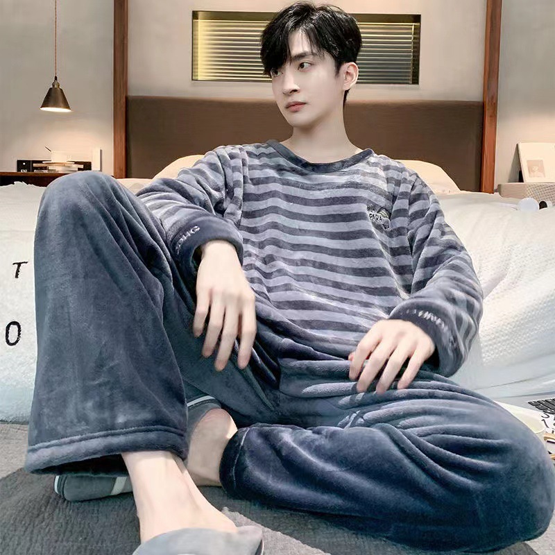 Фланелевая пижама в полоску мужская зимняя свободная пуловина подросток большой размер коралловый бархат