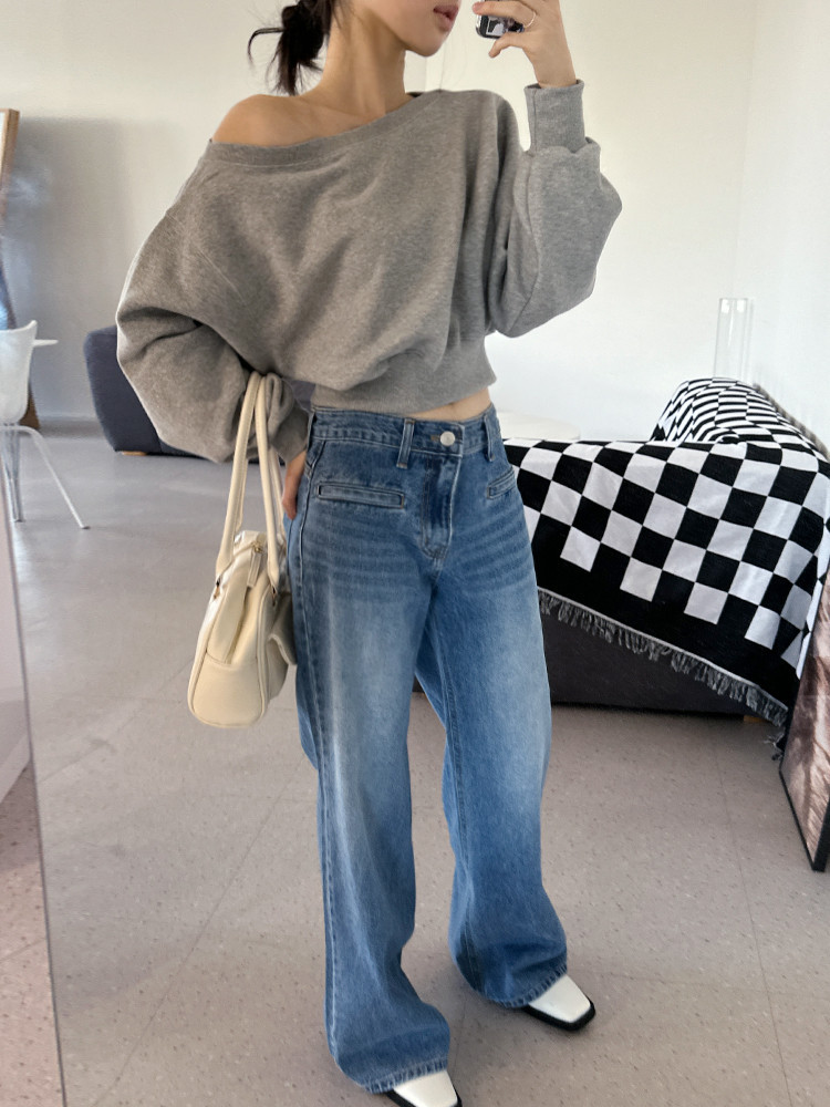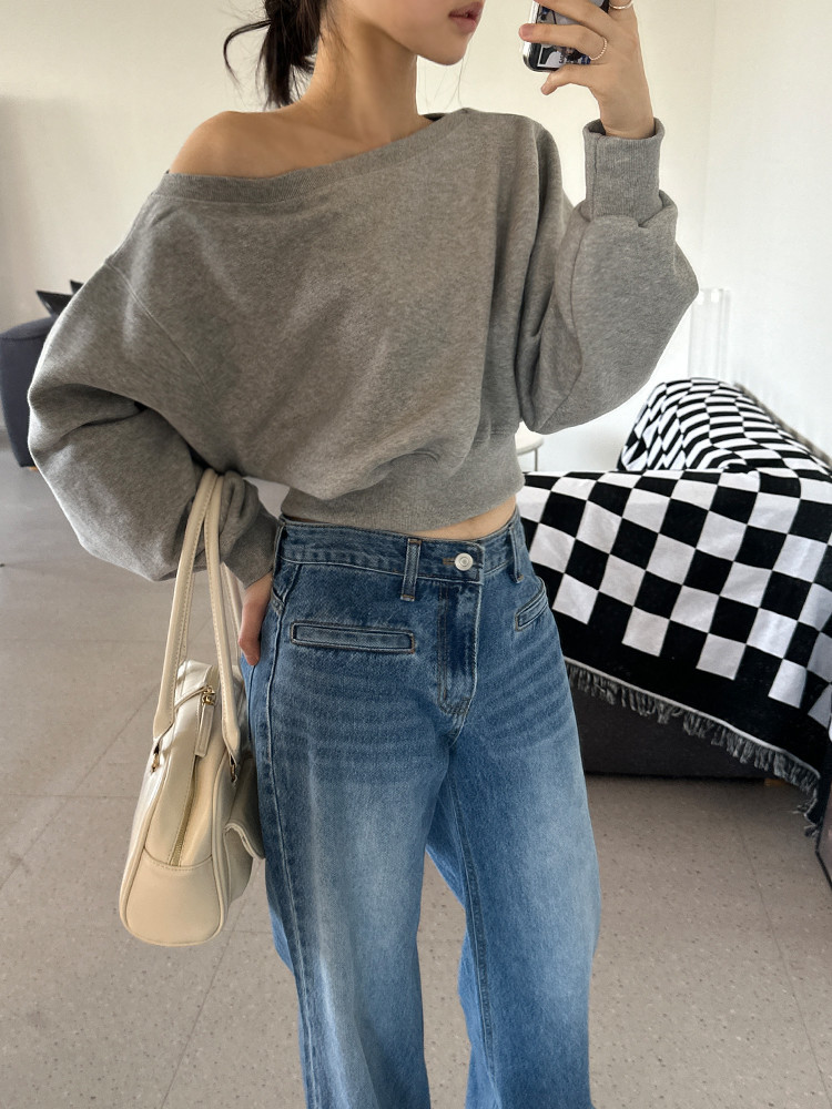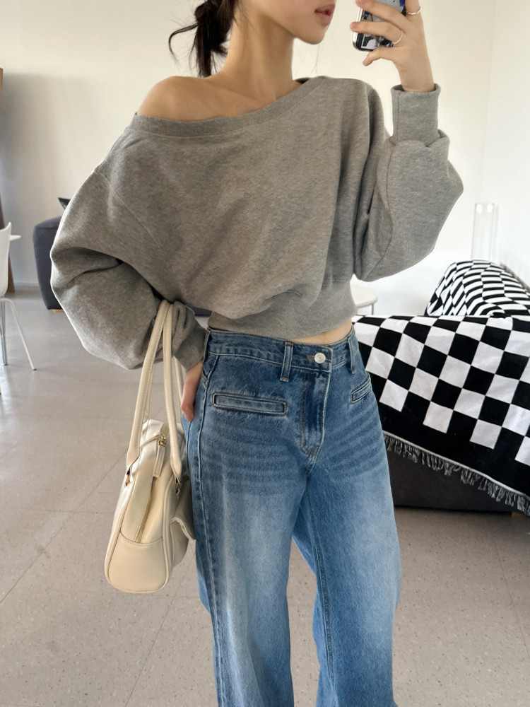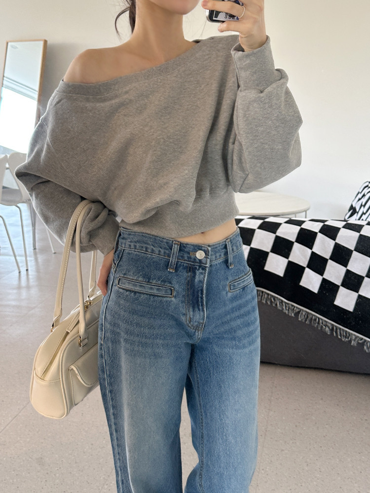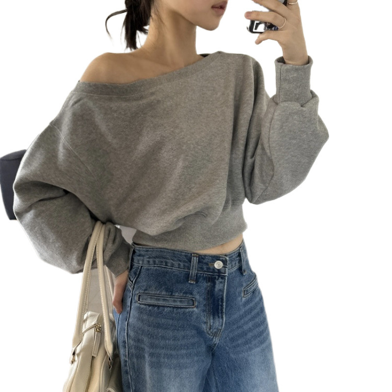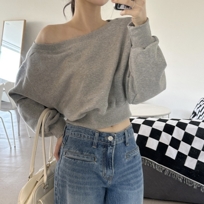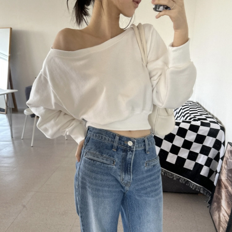 Корейский шикарный осенний свитшот с асимметричным косым воротником, открытыми плечами, универсальный, короткий, однотонный, с длинными рукавами, для женщин