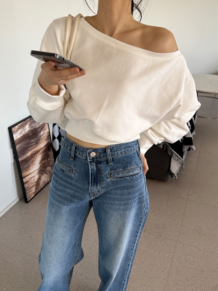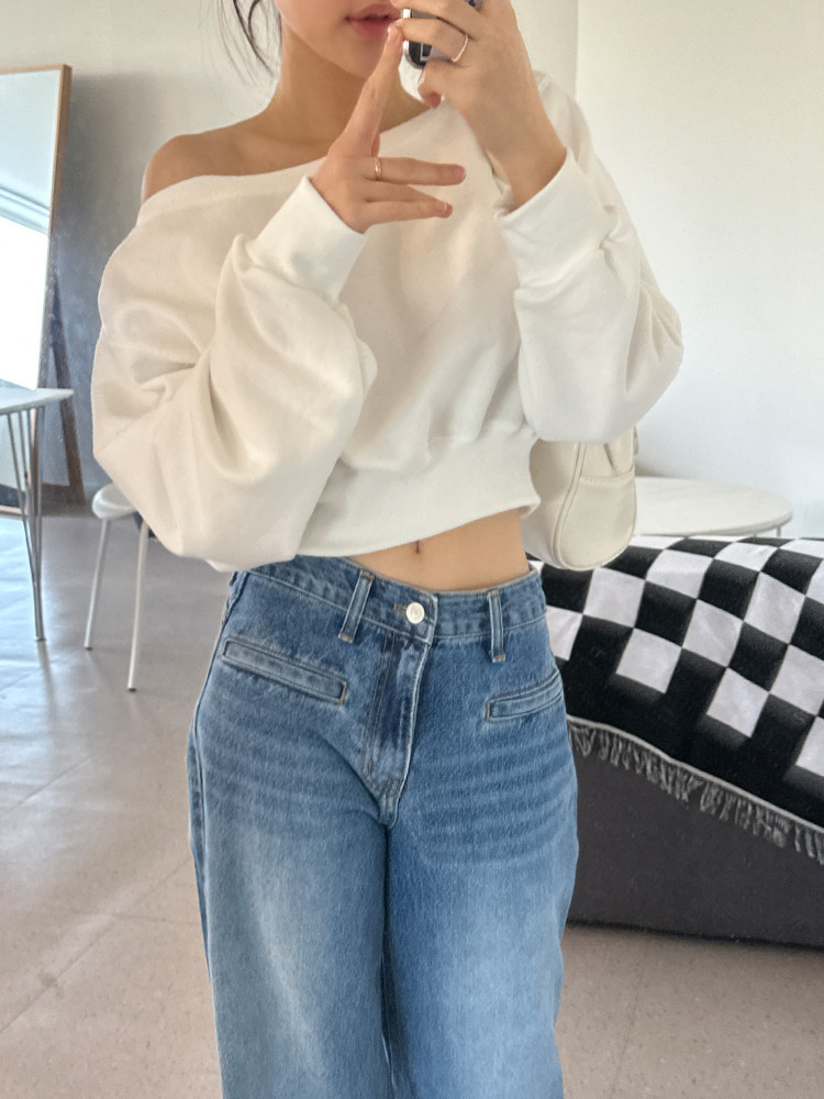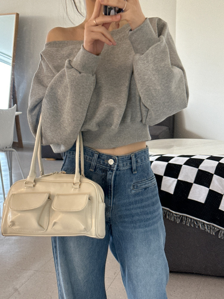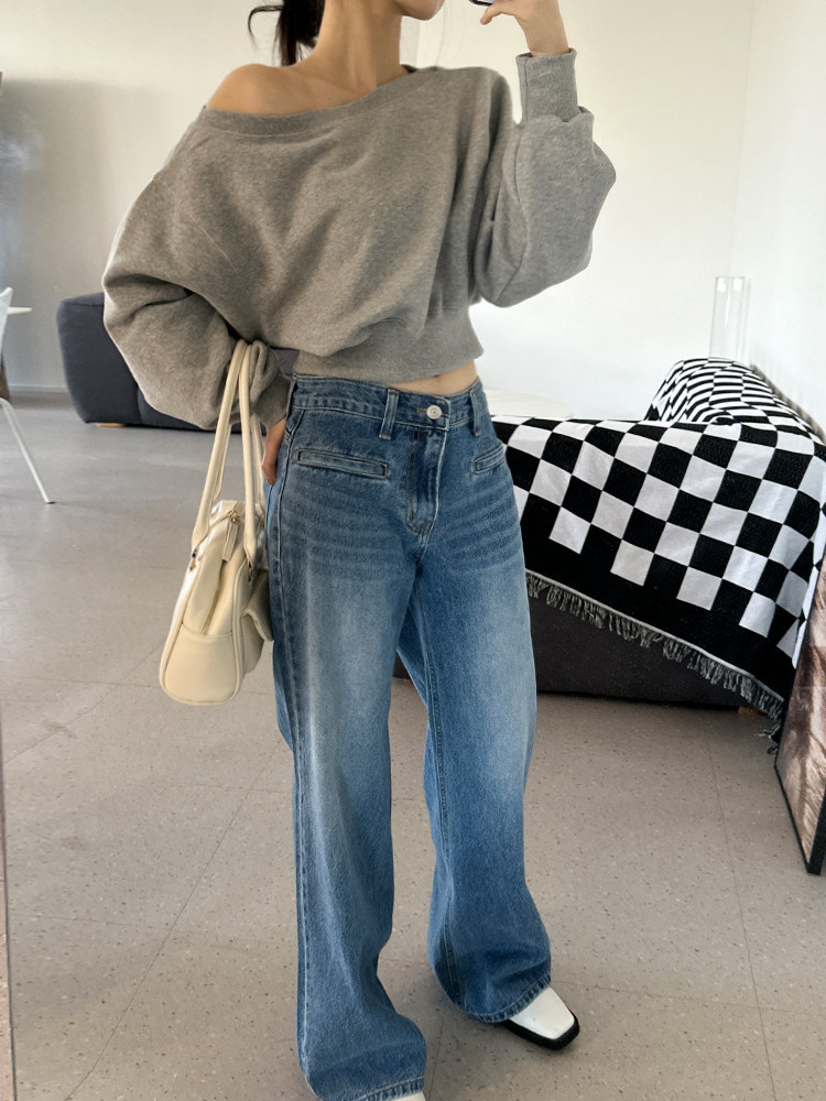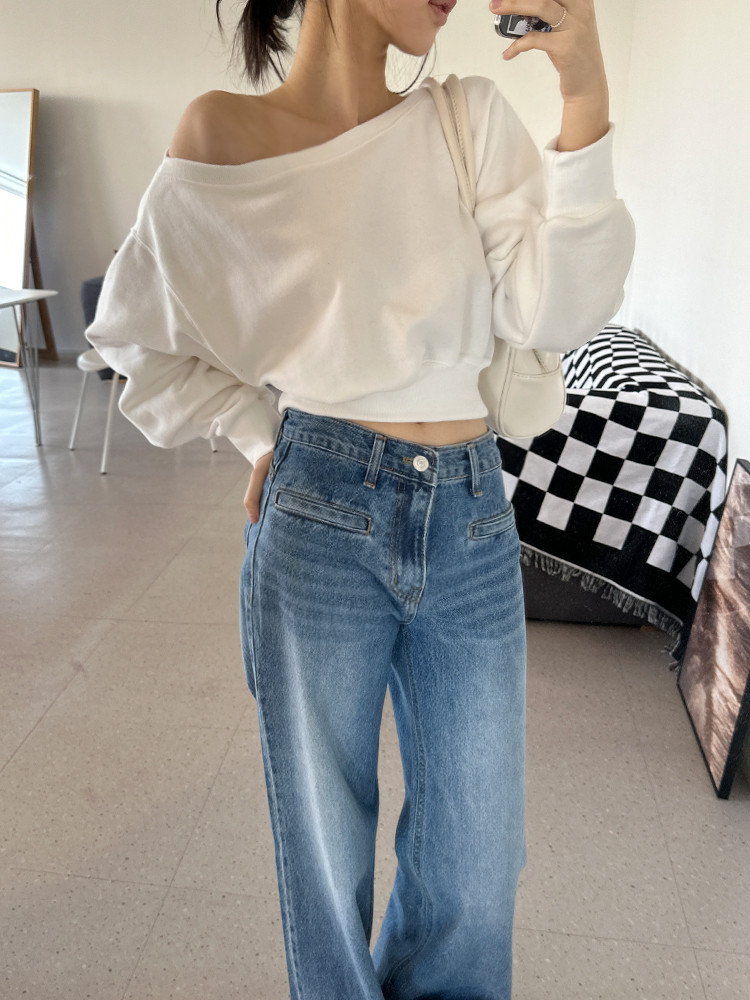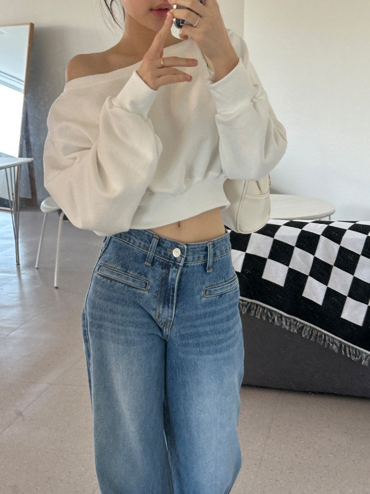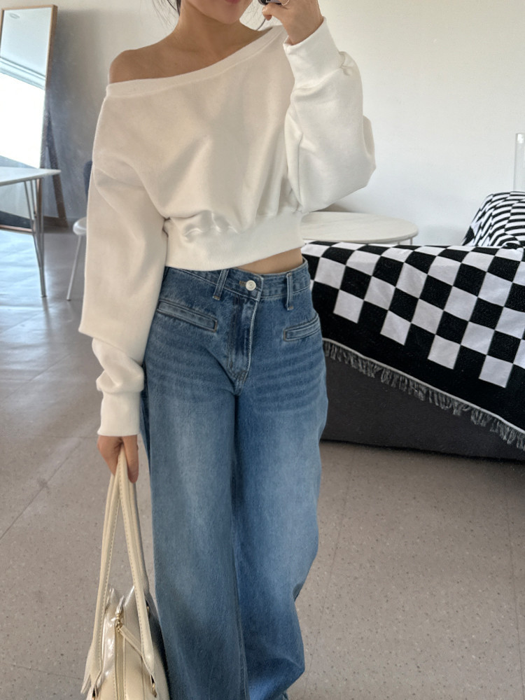 Корейский шикарный осенний свитшот с асимметричным косым воротником, открытыми плечами, универсальный, короткий, однотонный, с длинными рукавами, для женщин