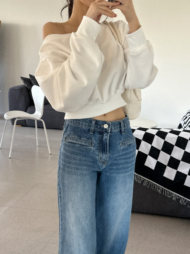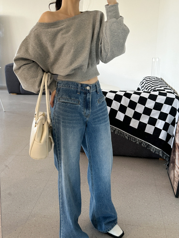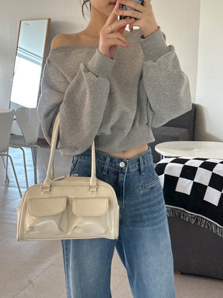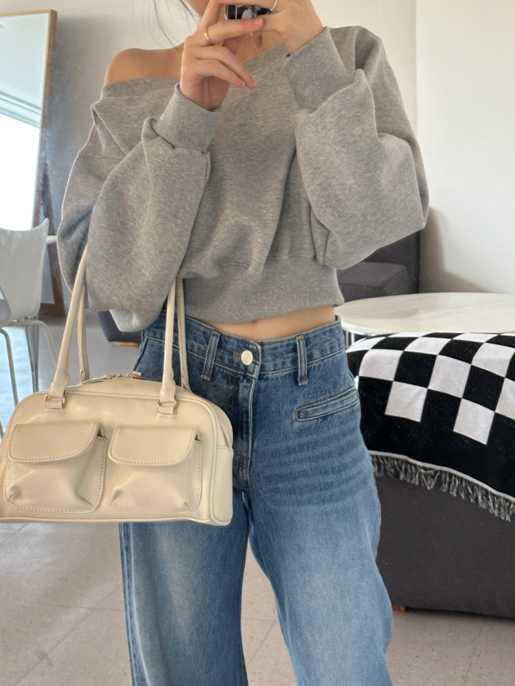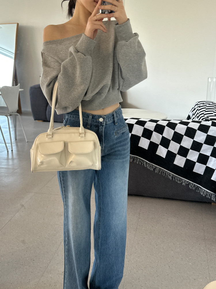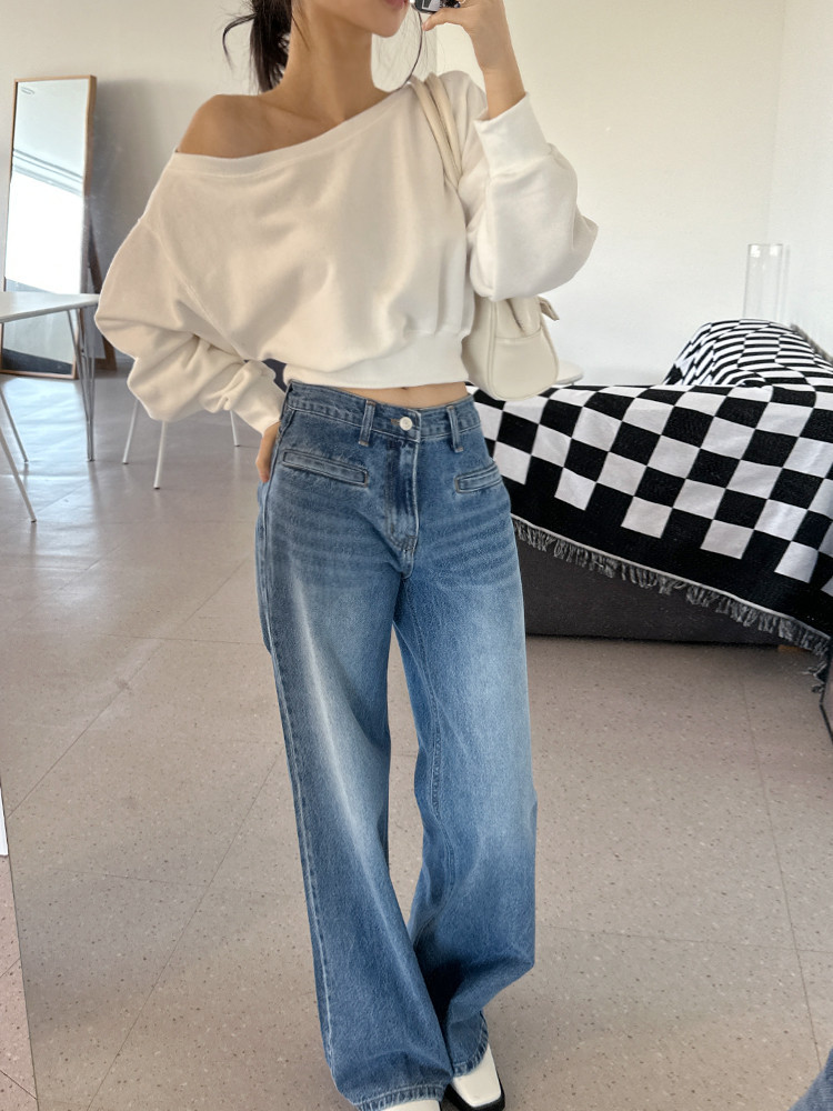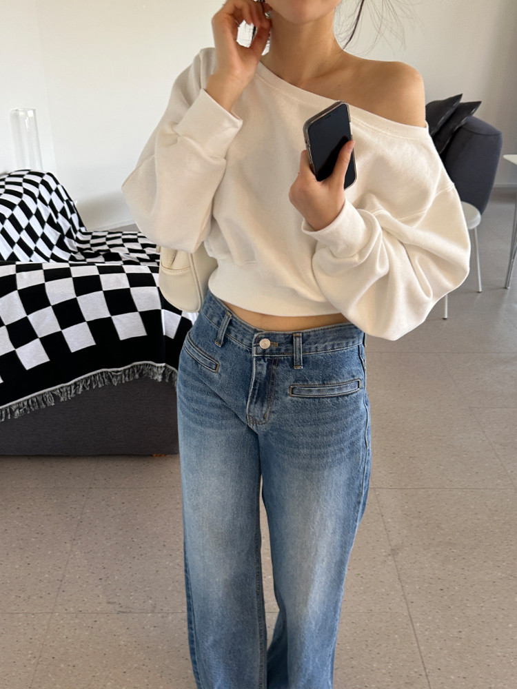 Корейский шикарный осенний свитшот с асимметричным косым воротником, открытыми плечами, универсальный, короткий, однотонный, с длинными рукавами, для женщин